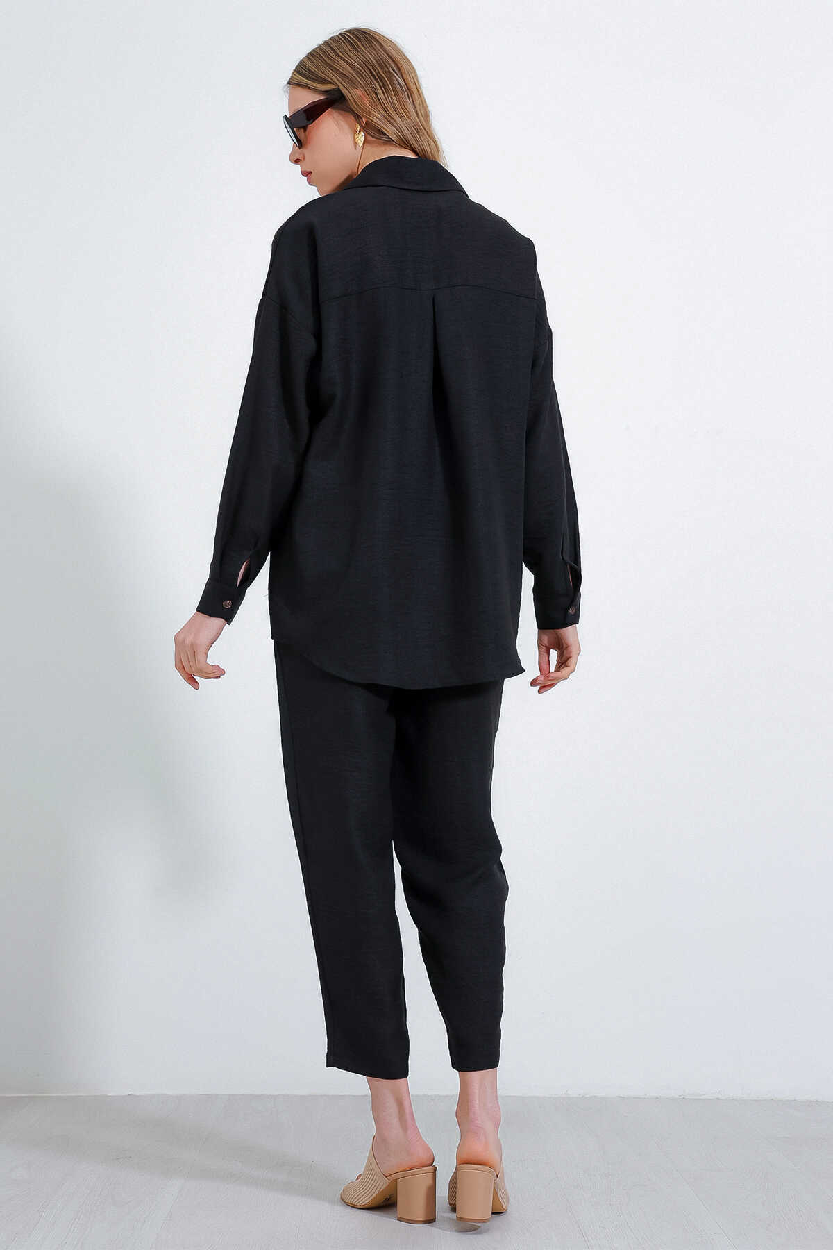 Kadın Siyah Oversize Keten Alt Üst Takım 6622 - Kombin