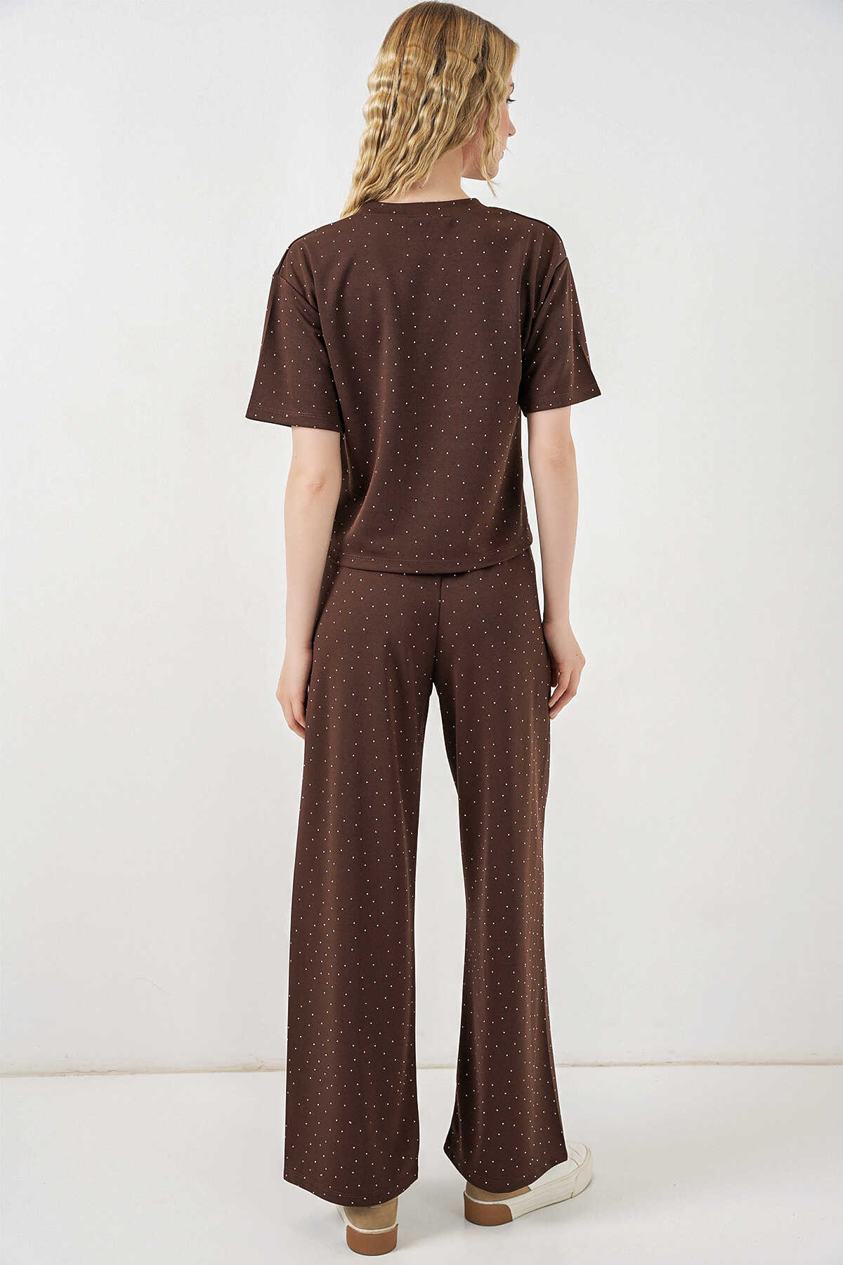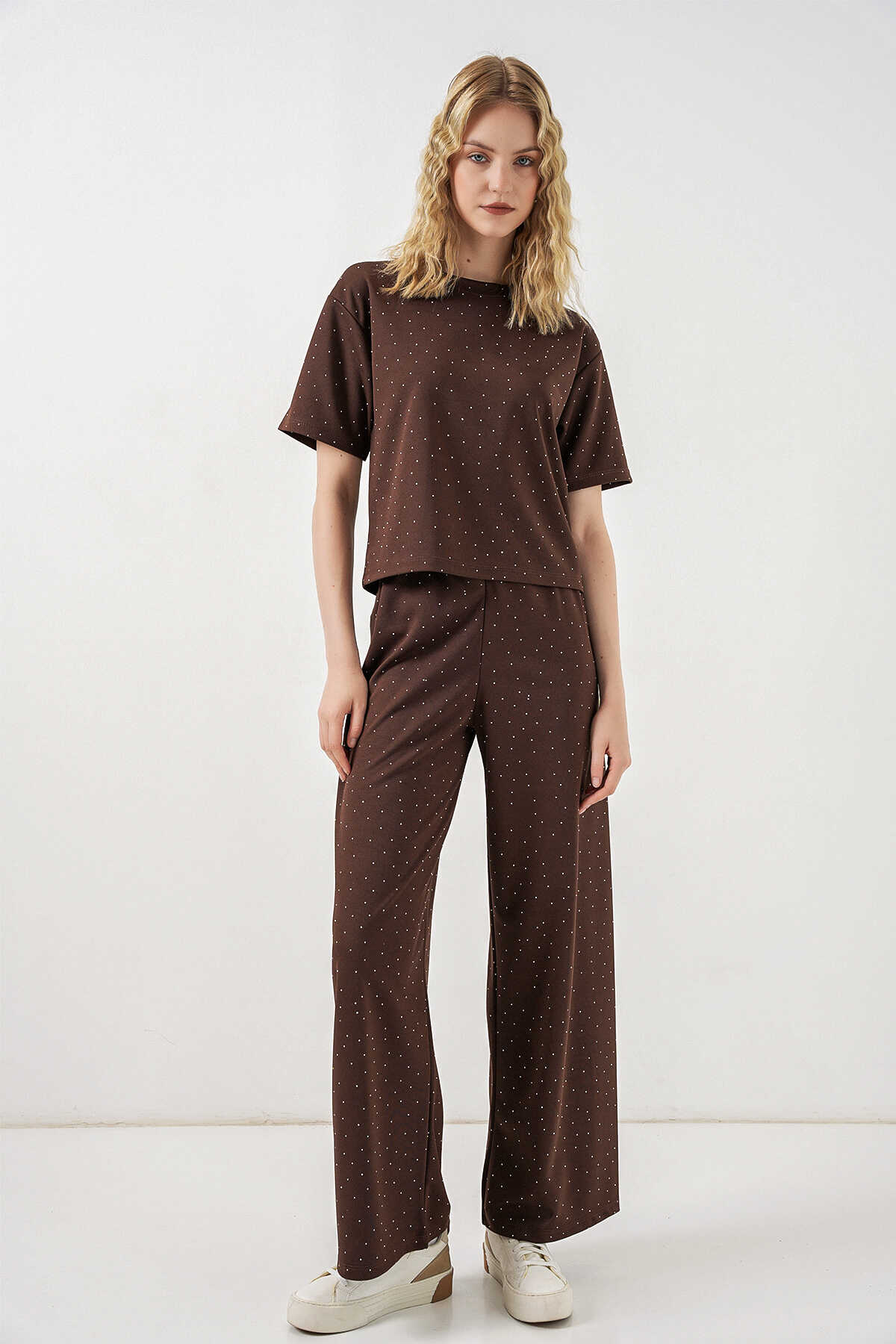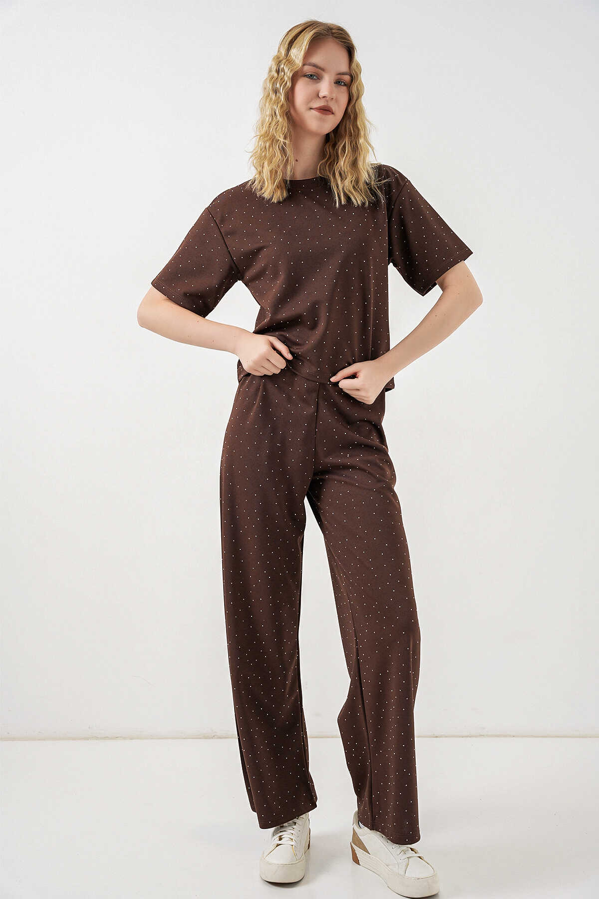 Kadın Taşlı Tişört Pantolon İkili Takım 30105 - Kahverengi - Kombin