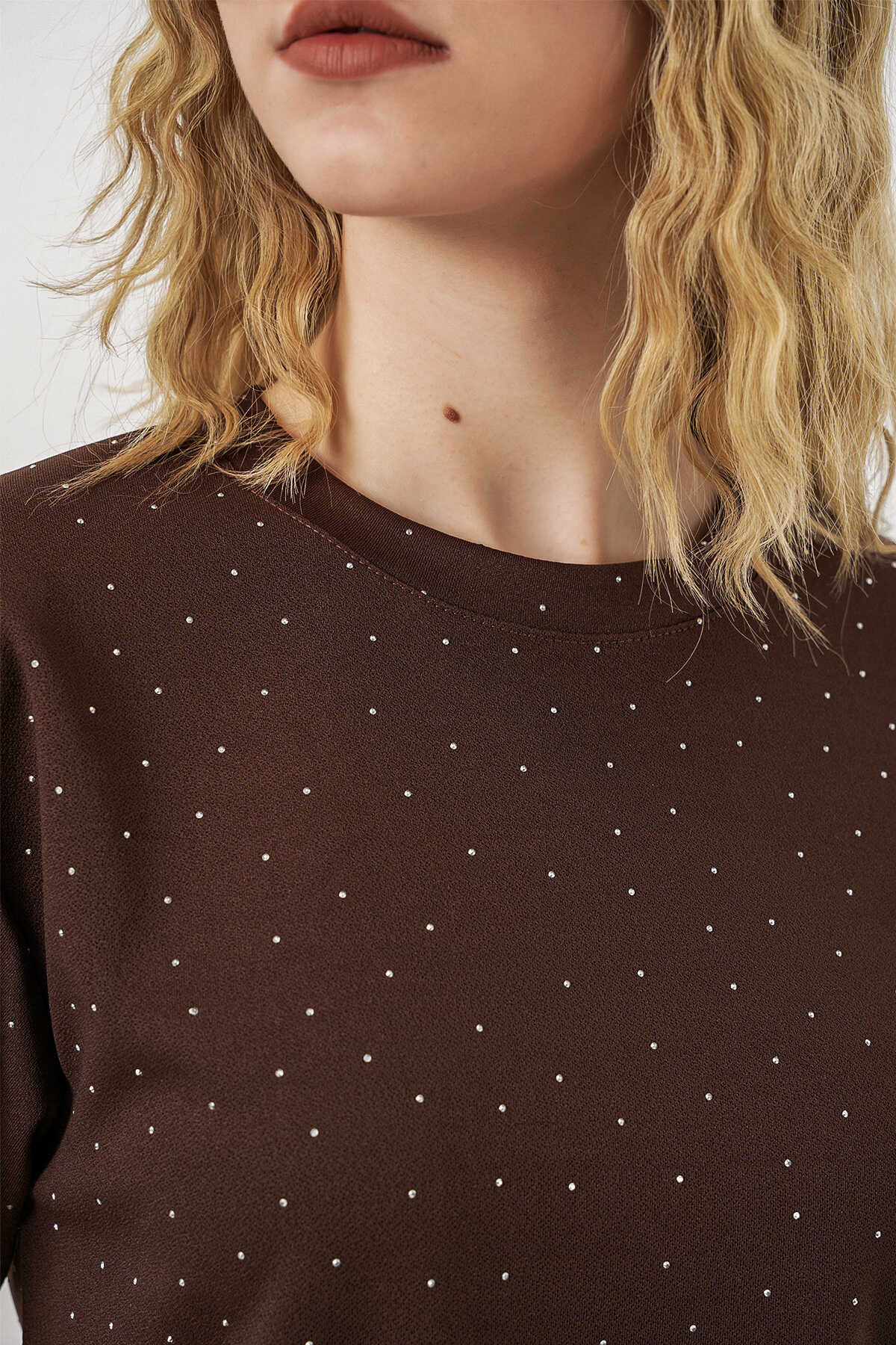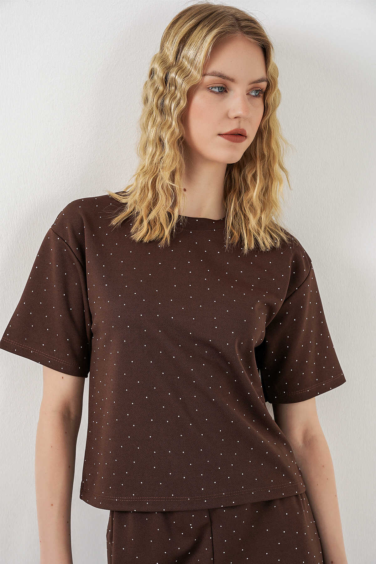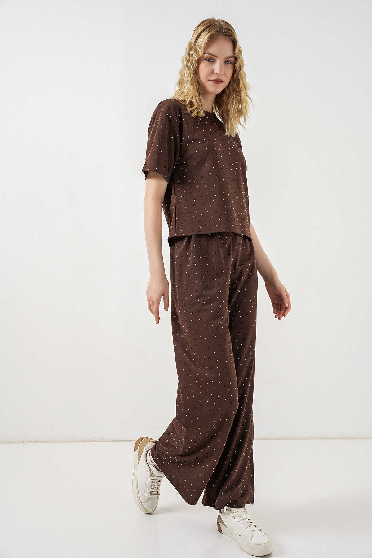 Kadın Taşlı Tişört Pantolon İkili Takım 30105 - Kahverengi - Kombin