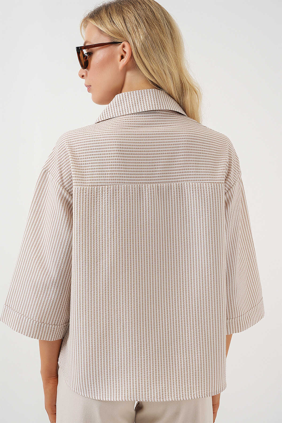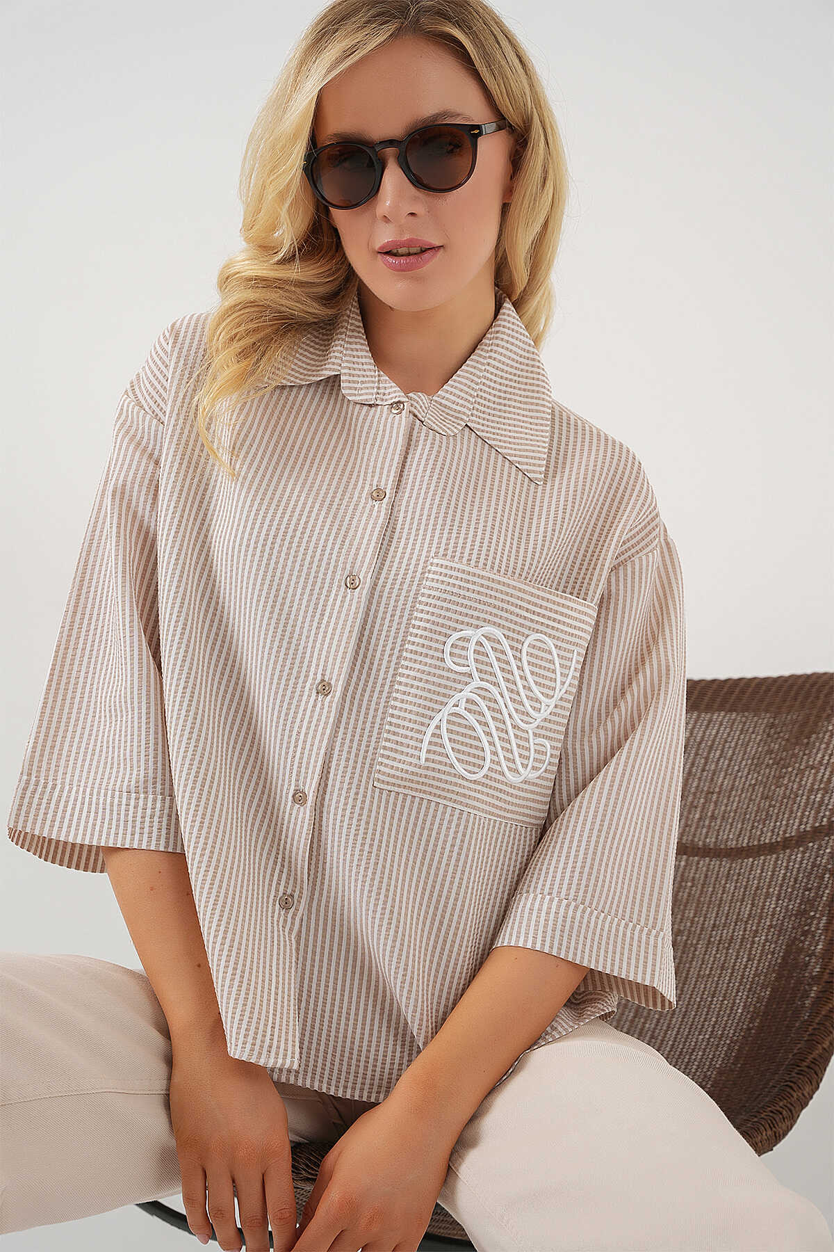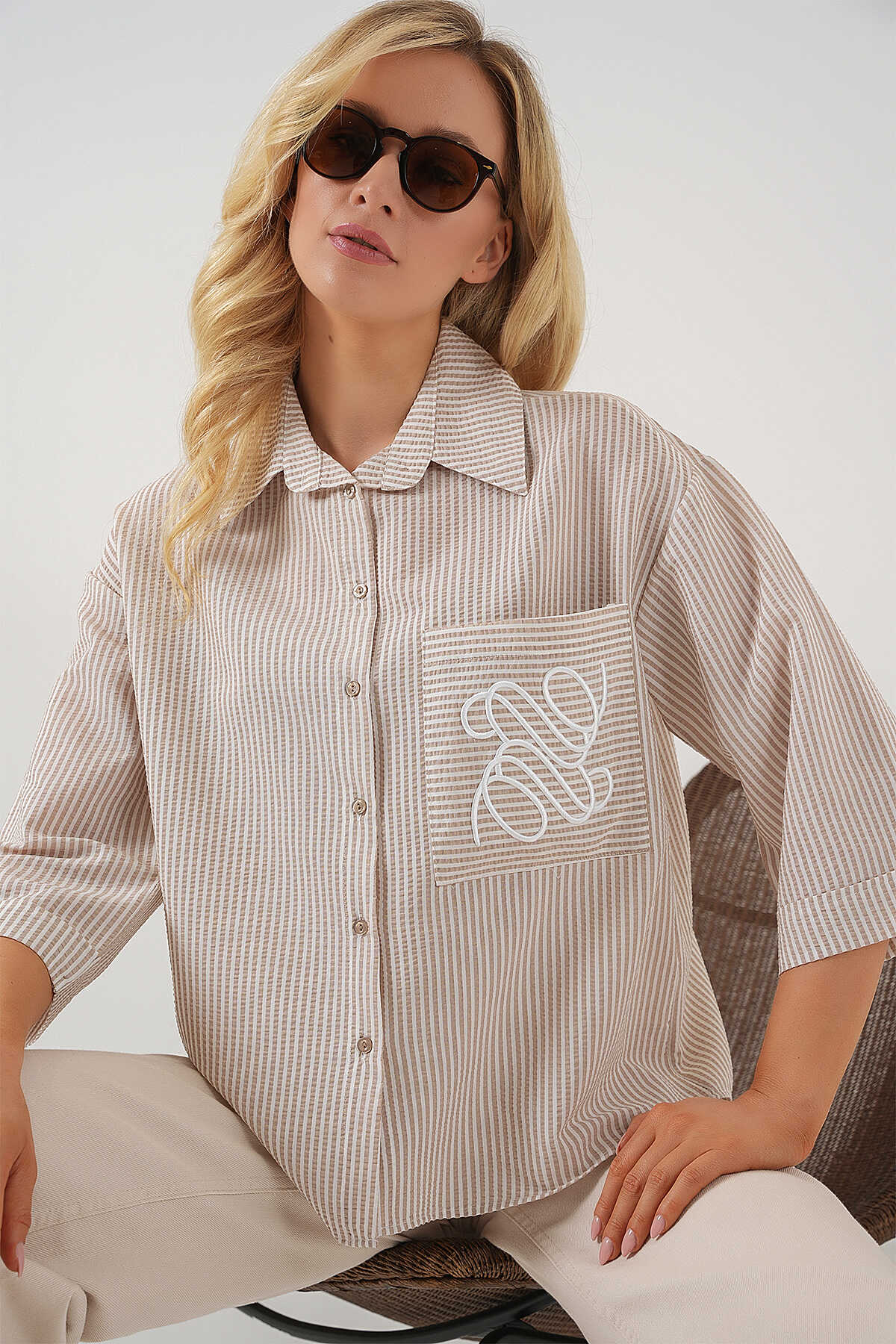 Kadın Tek Cep Nakışlı Gömlek 20328 - Bej - Kombin