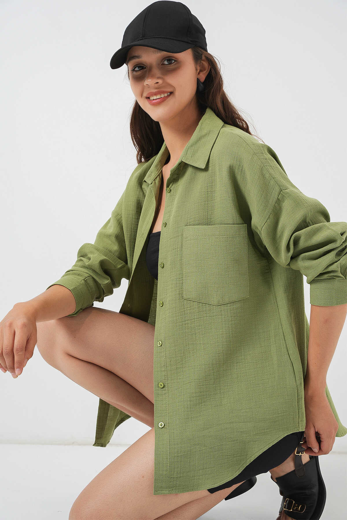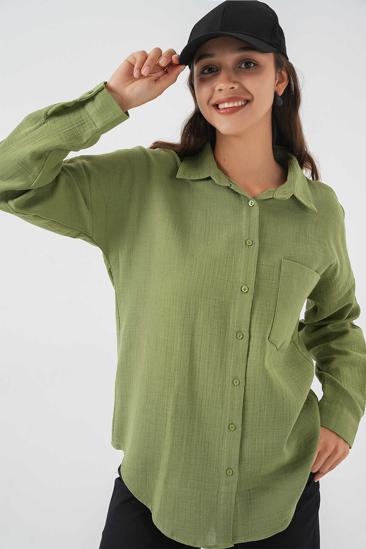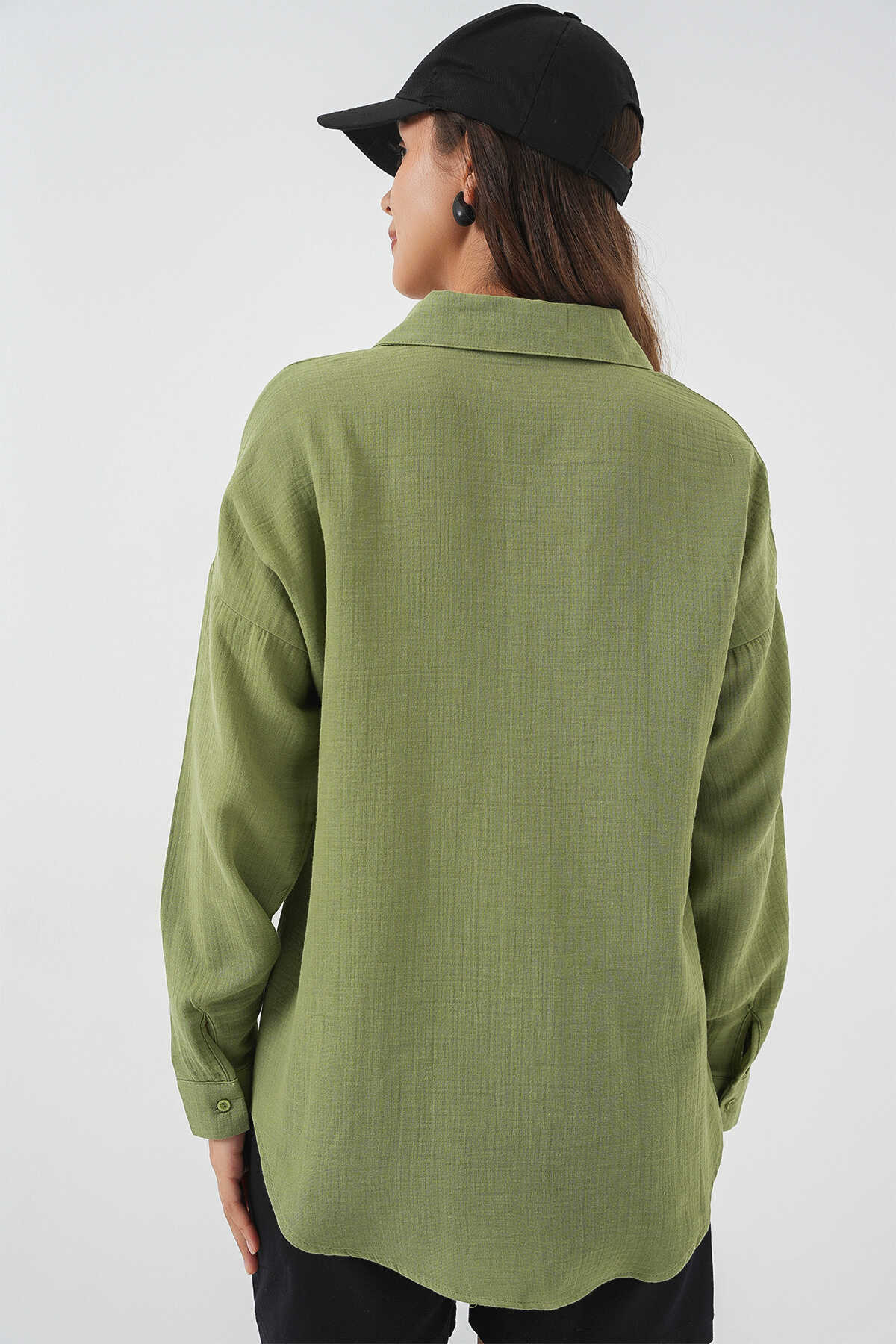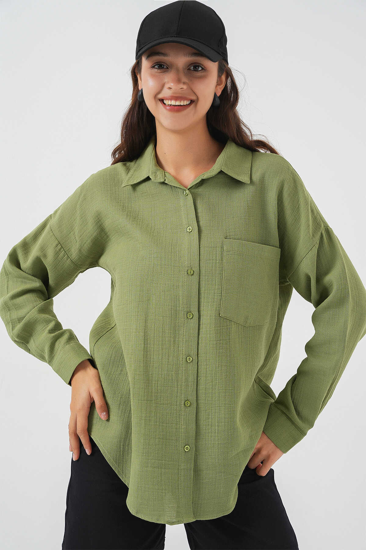 Kadın Tek Cepli Oversize Müslin Gömlek 20353 - Çağla - Kombin