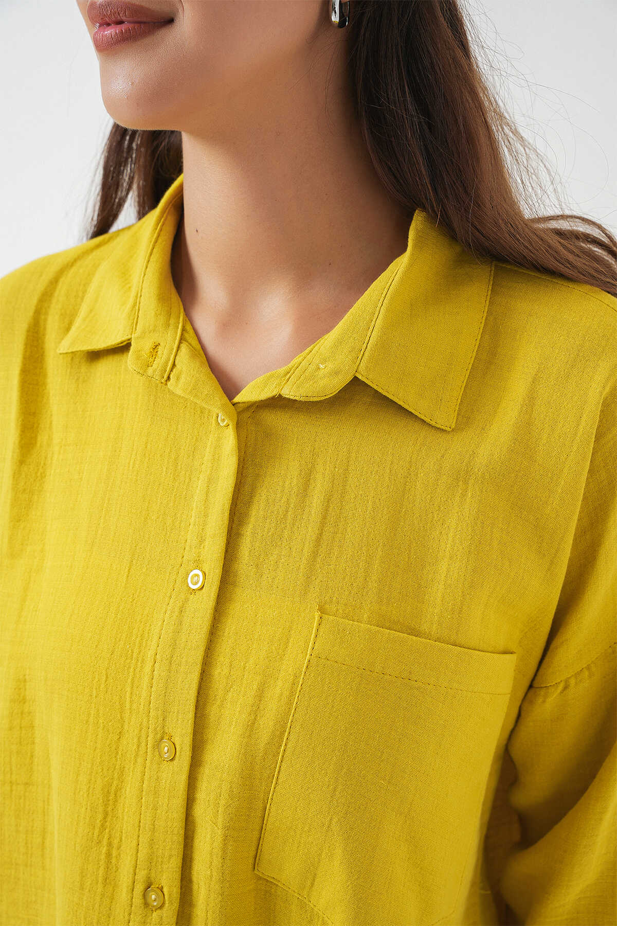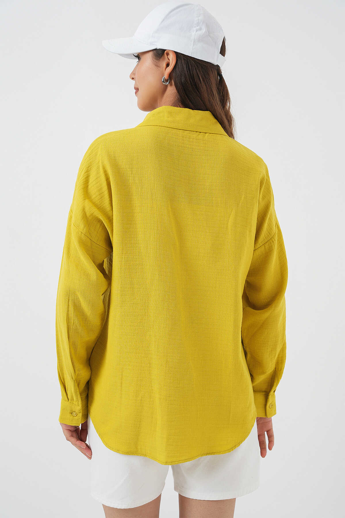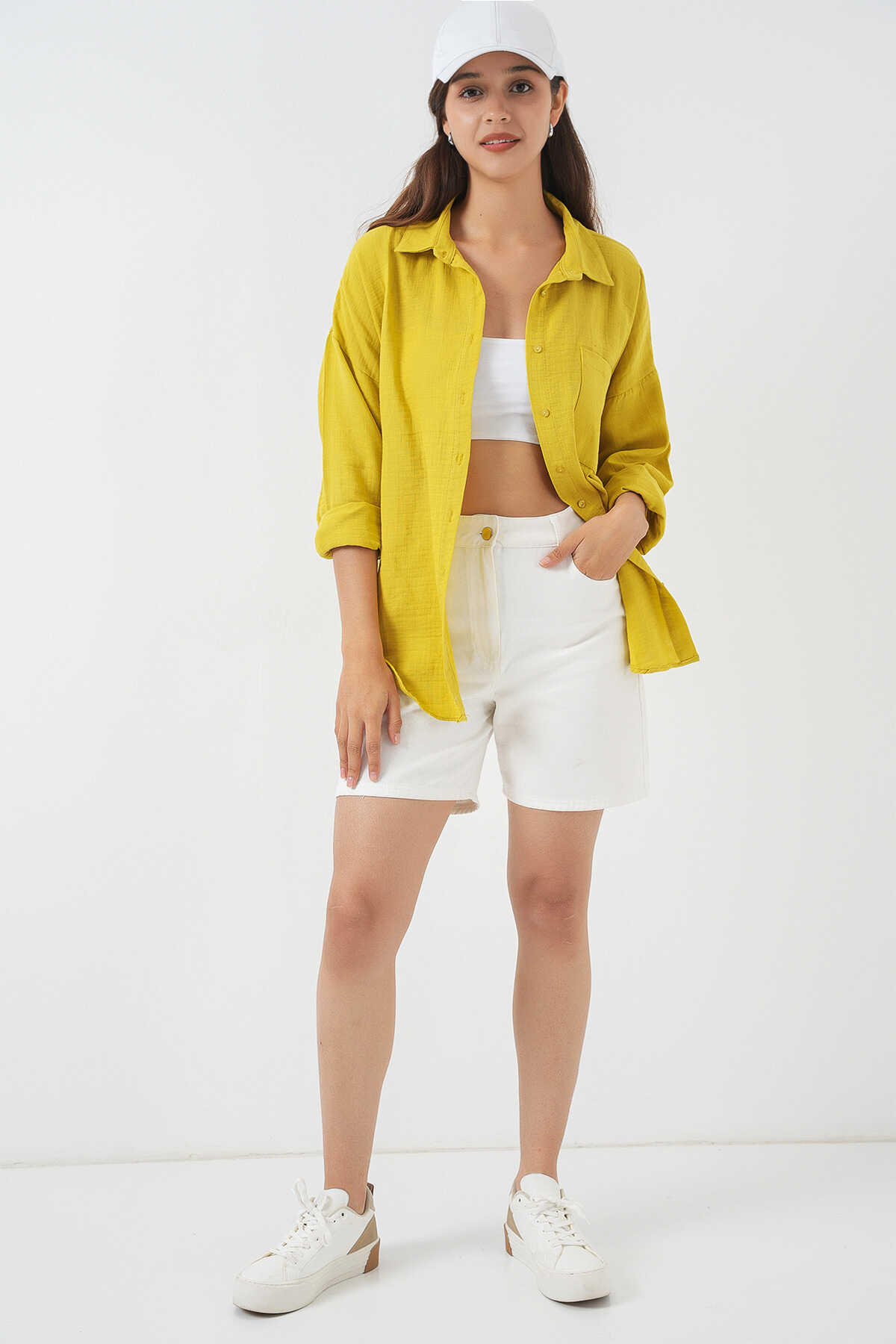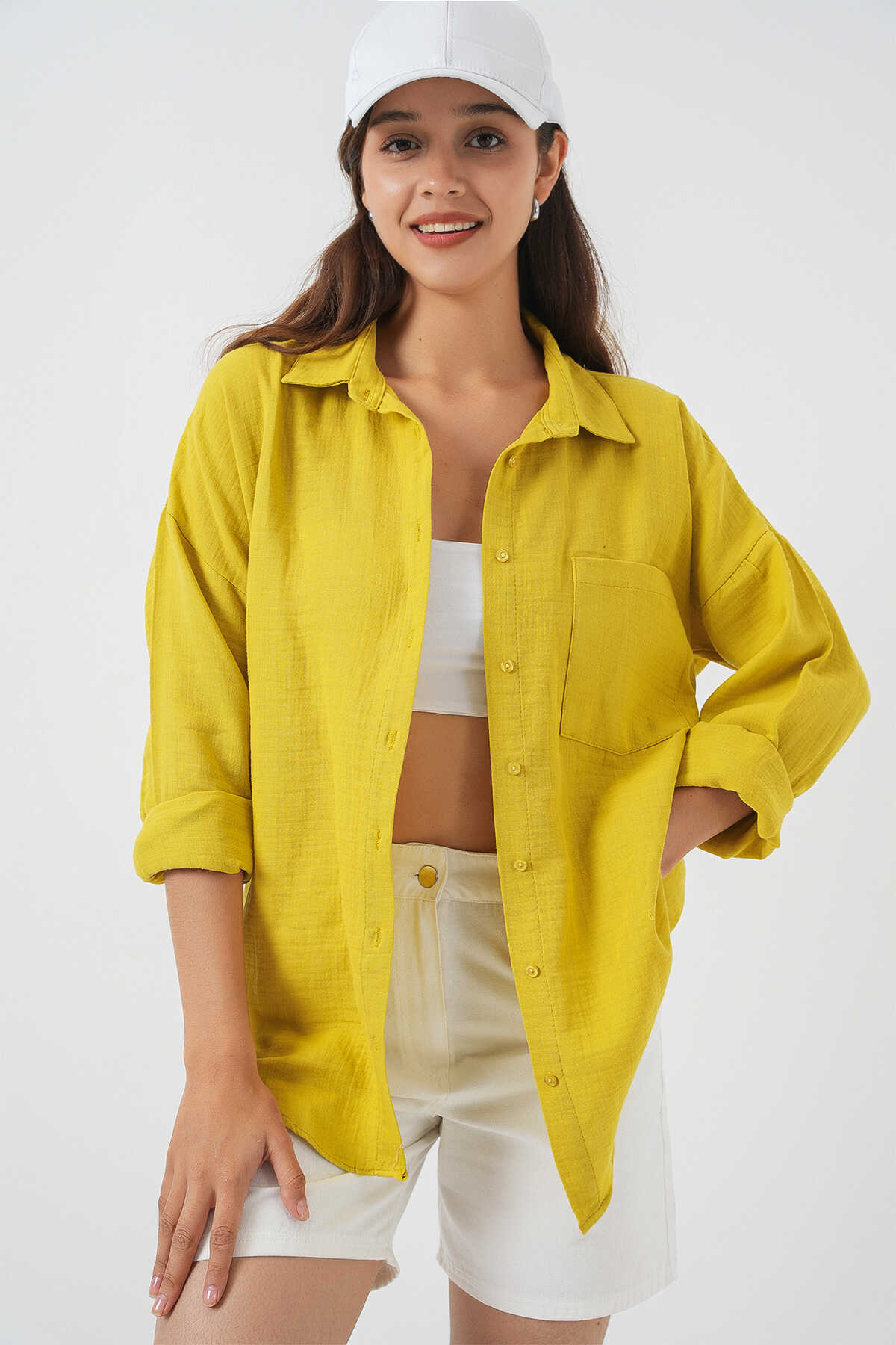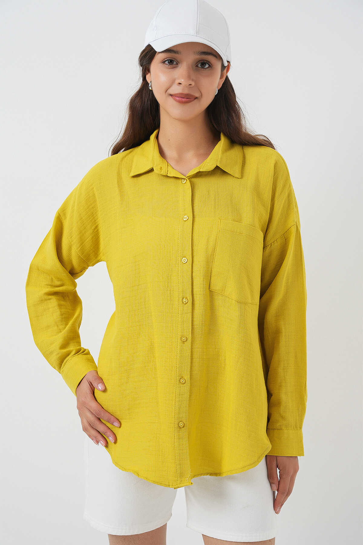 Kadın Tek Cepli Oversize Müslin Gömlek 20353 - Hardal - Kombin