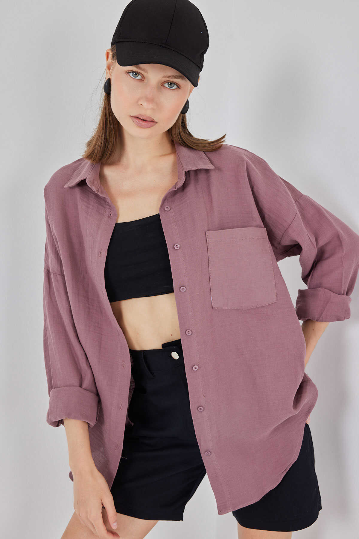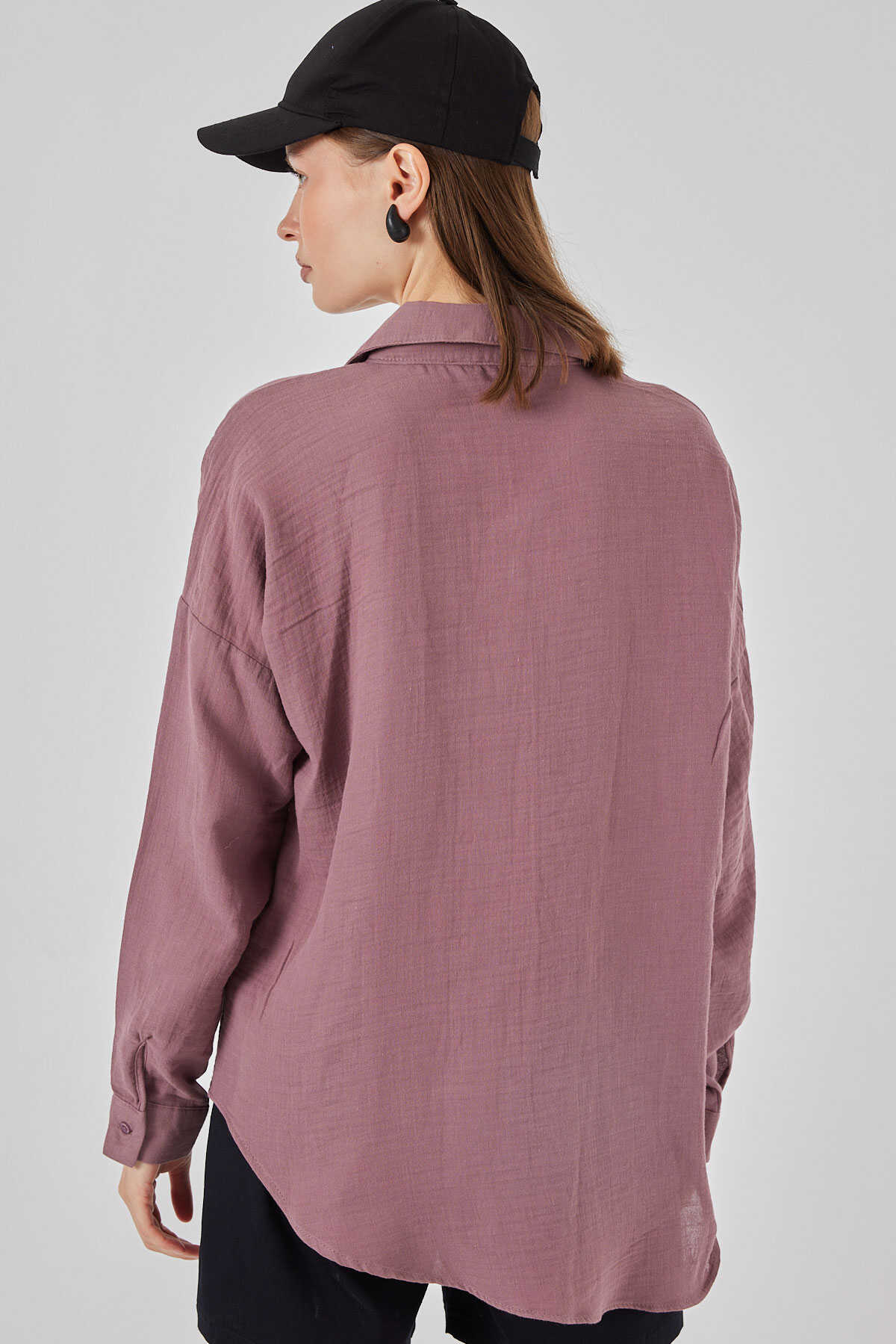 Kadın Tek Cepli Oversize Müslin Gömlek 20353 - Koyu Lila - Kombin