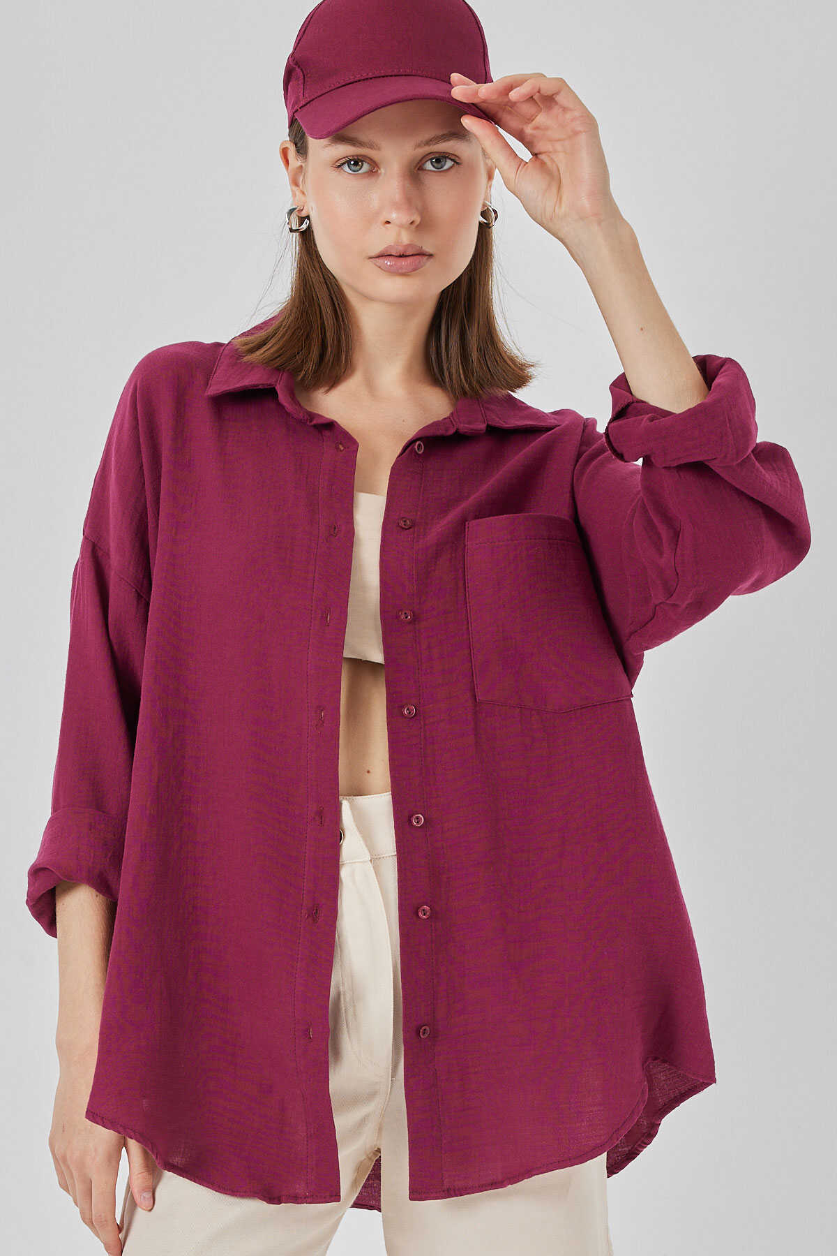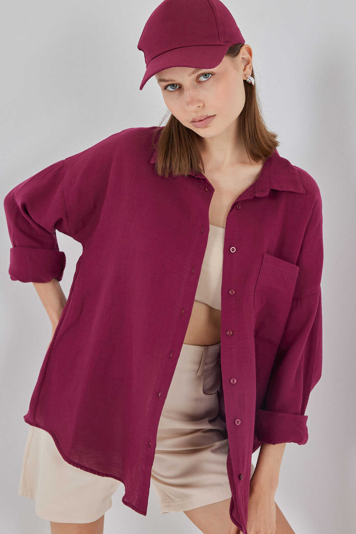 Kadın Tek Cepli Oversize Müslin Gömlek 20353 - Mürdüm
