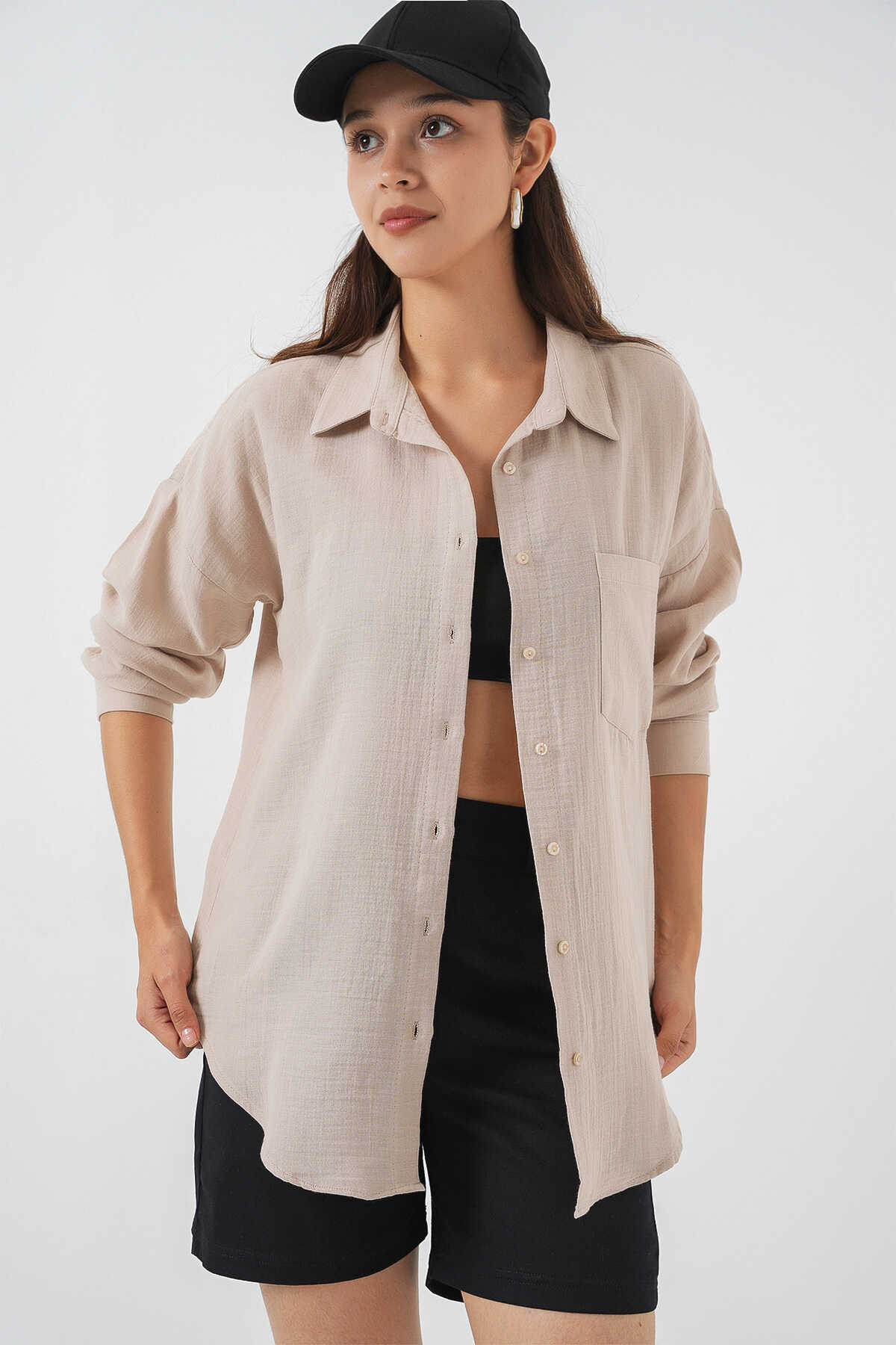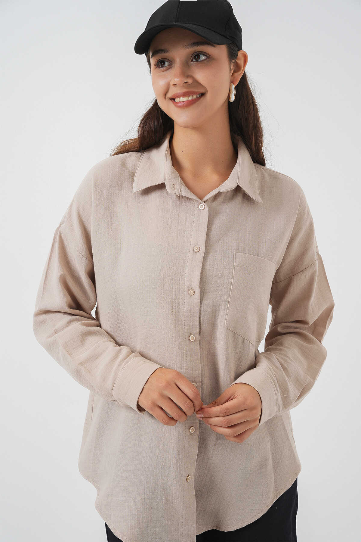 Kadın Tek Cepli Oversize Müslin Gömlek 20353 - Taş - Kombin