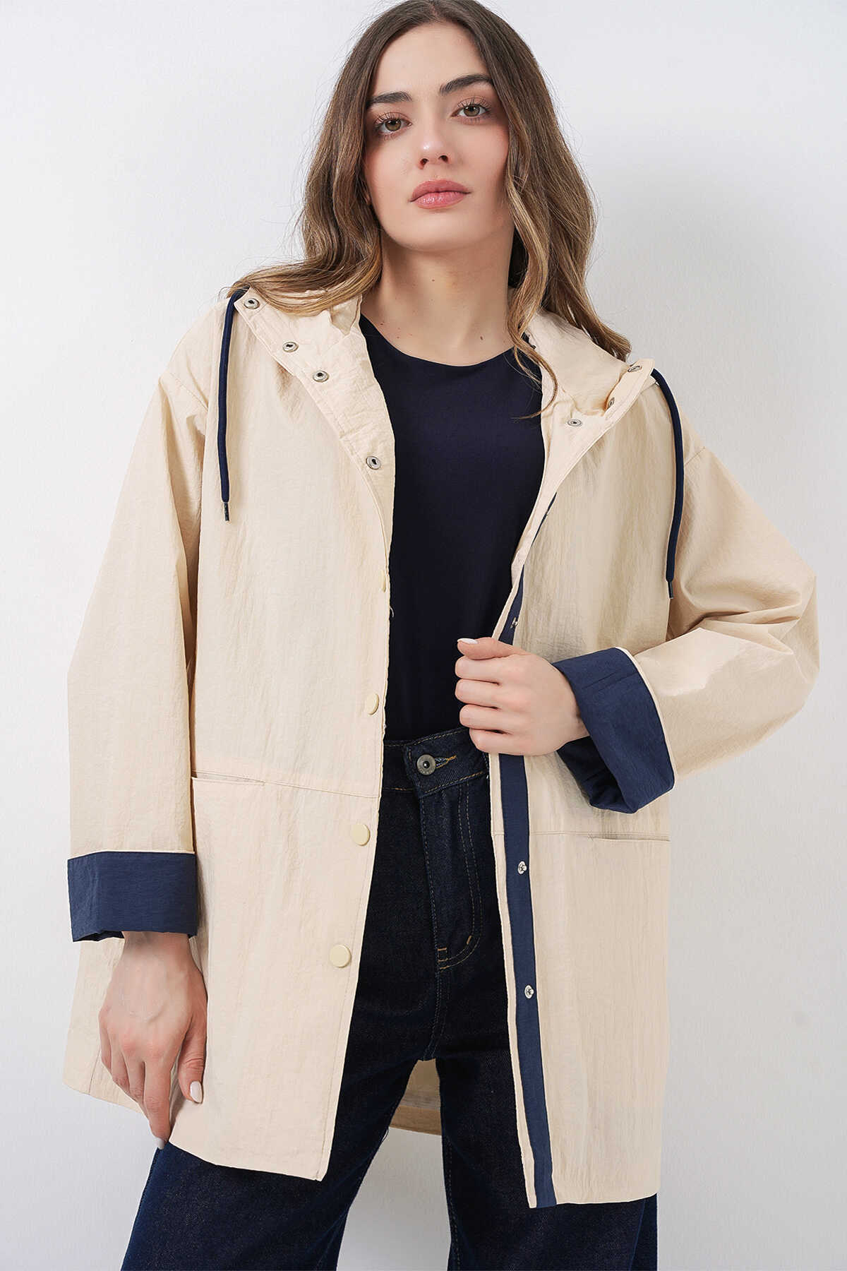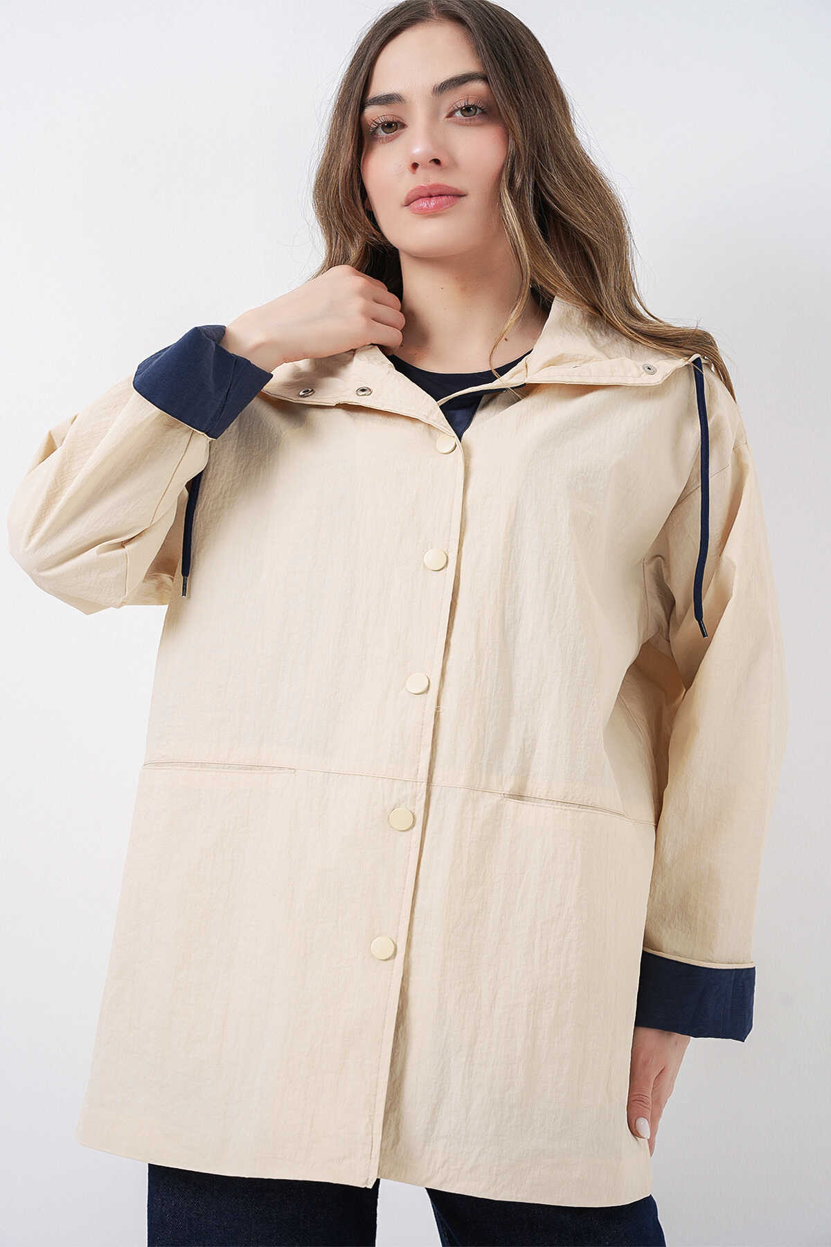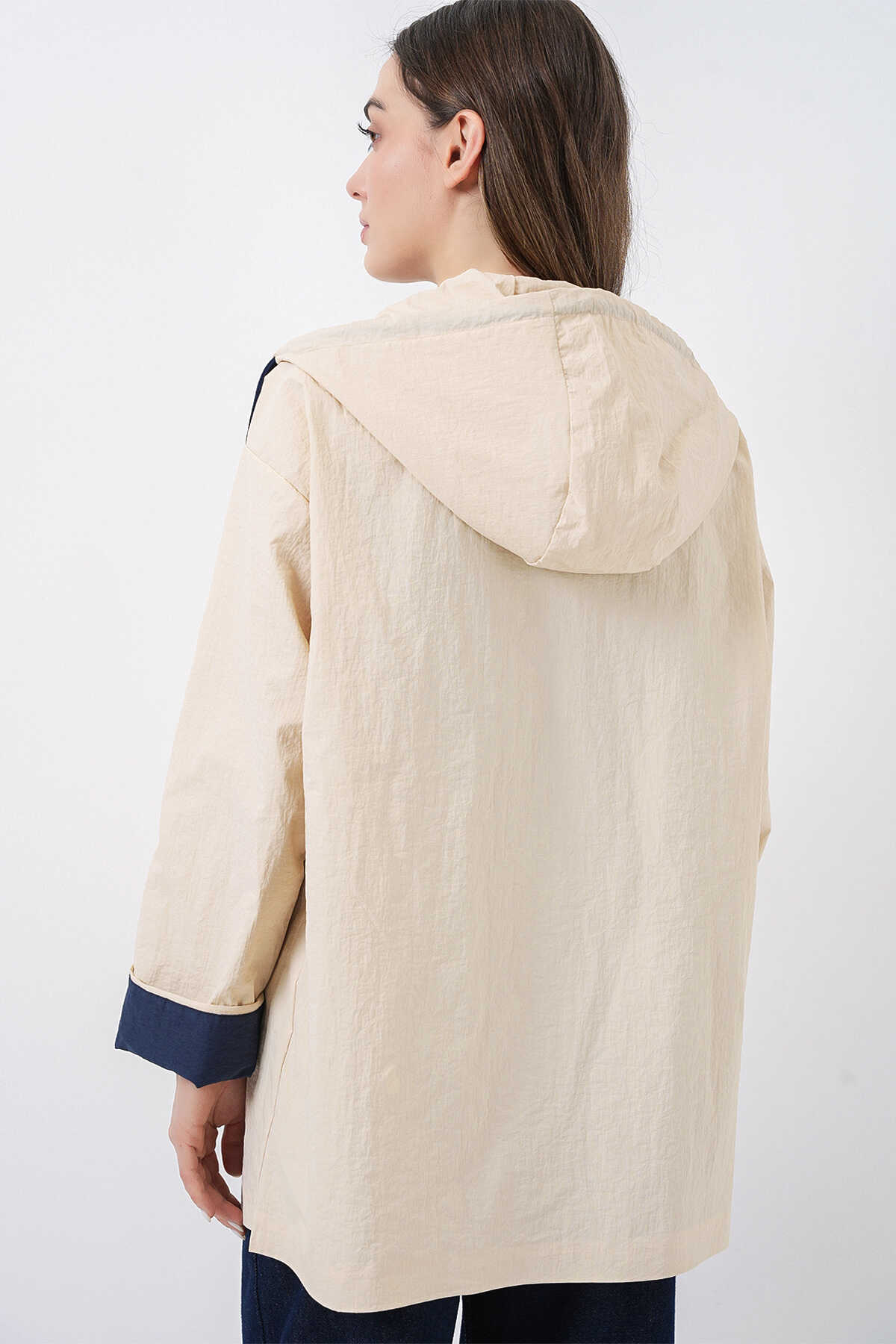 Kadin Teknik Kumas Parasüt Kumas Kapüsonlu Trençkot