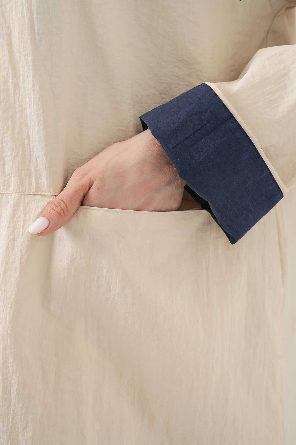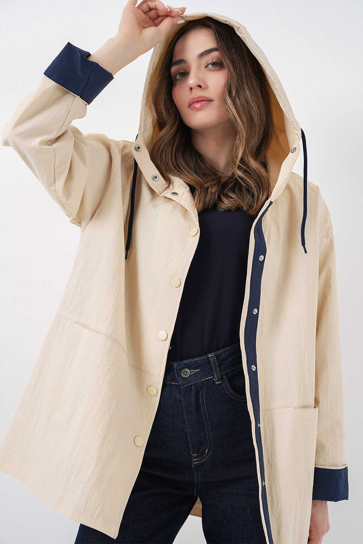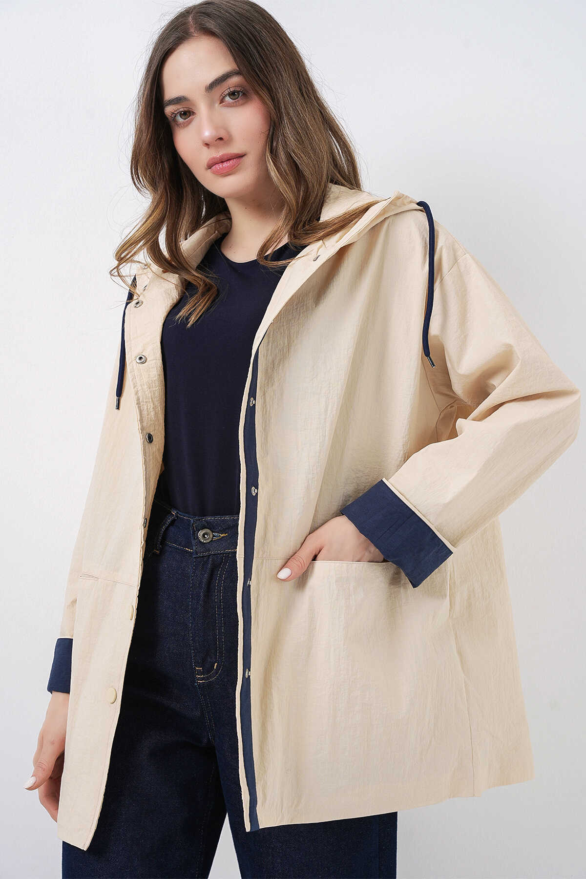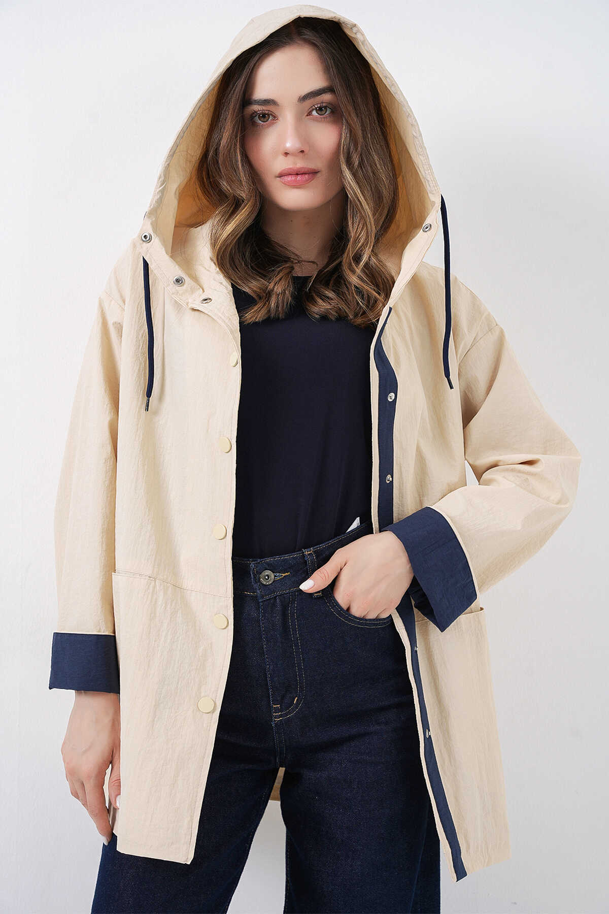 Kadin Teknik Kumas Parasüt Kumas Kapüsonlu Trençkot