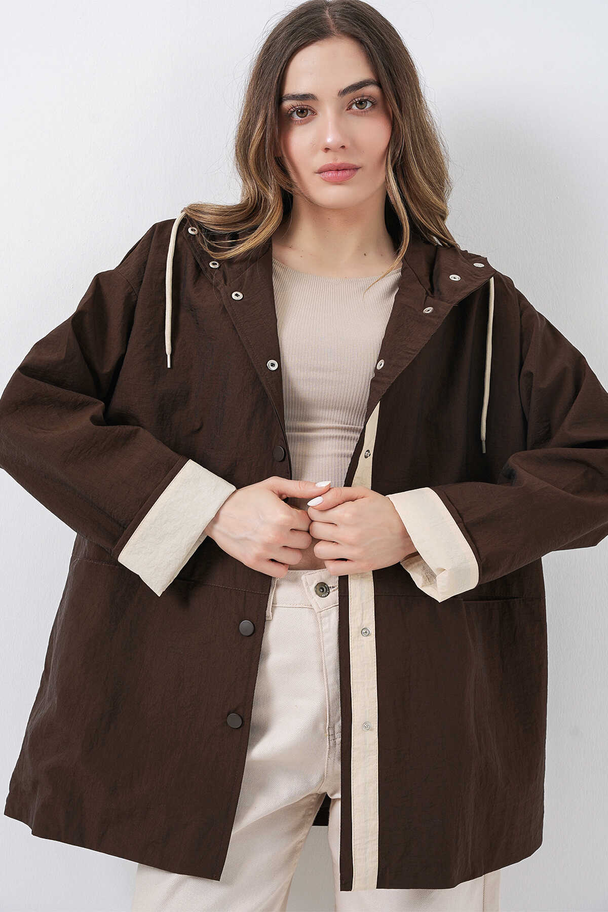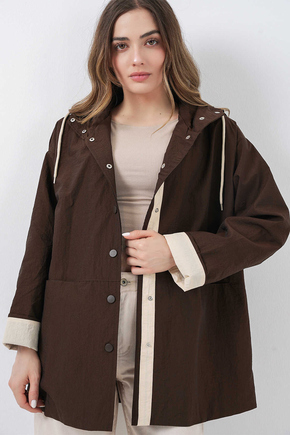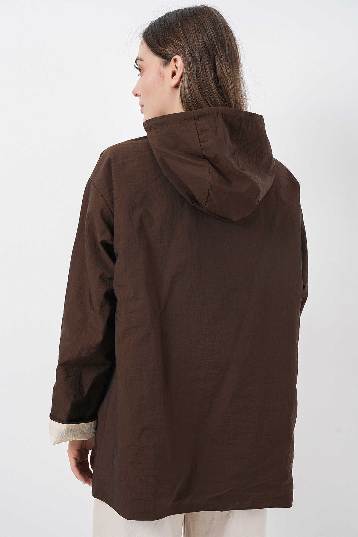 Kadin Teknik Kumas Parasüt Kumas Kapüsonlu Trençkot