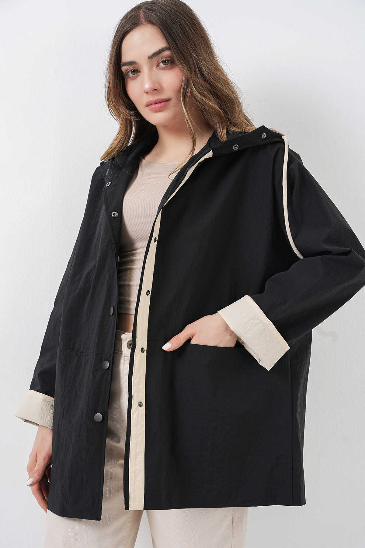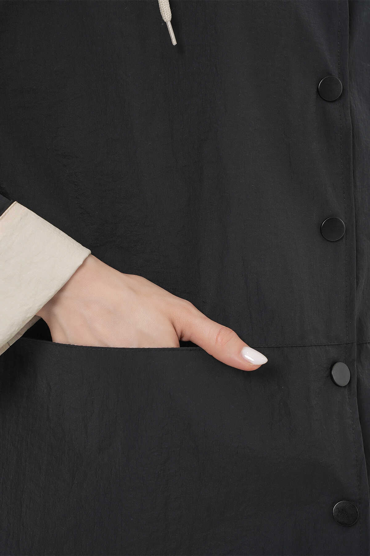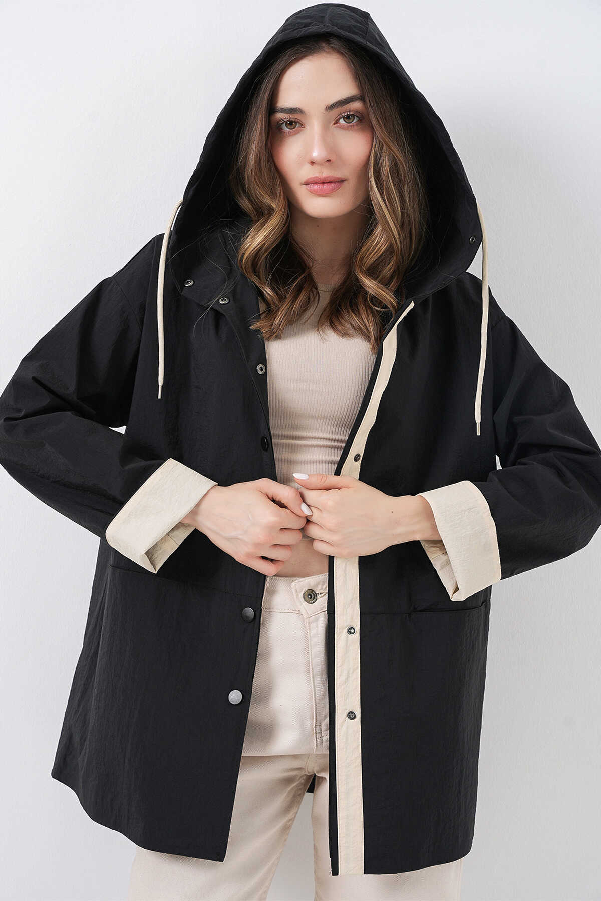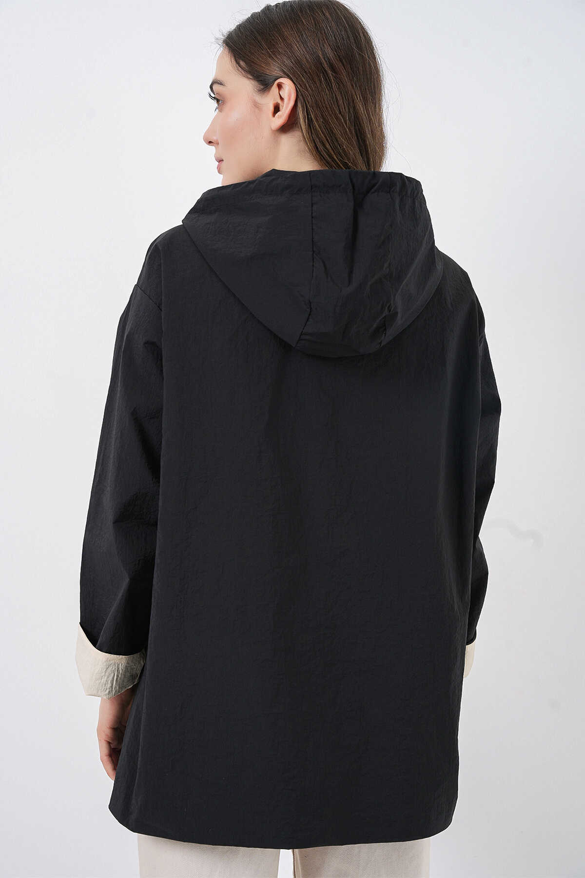 Kadin Teknik Kumas Parasüt Kumas Kapüsonlu Trençkot
