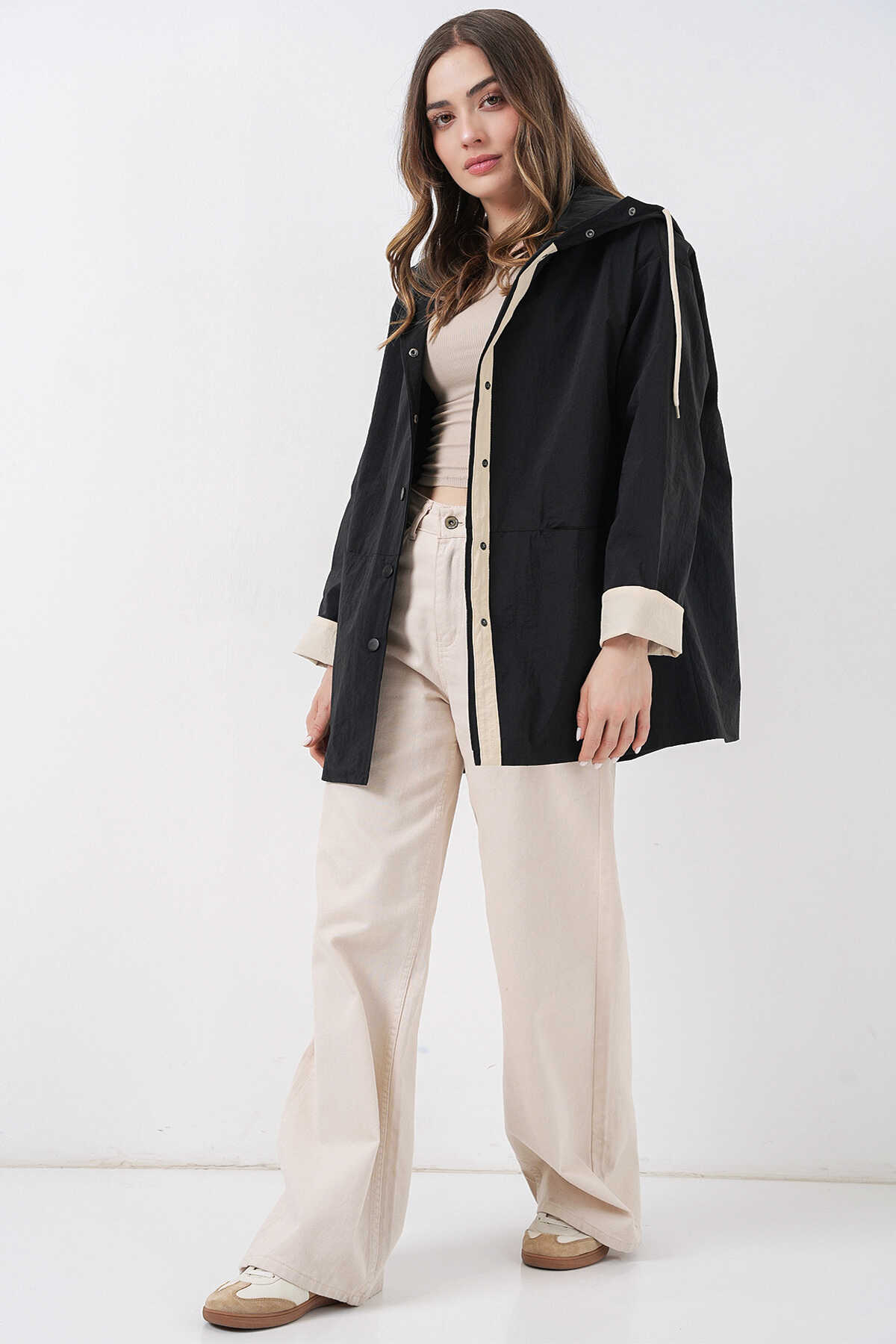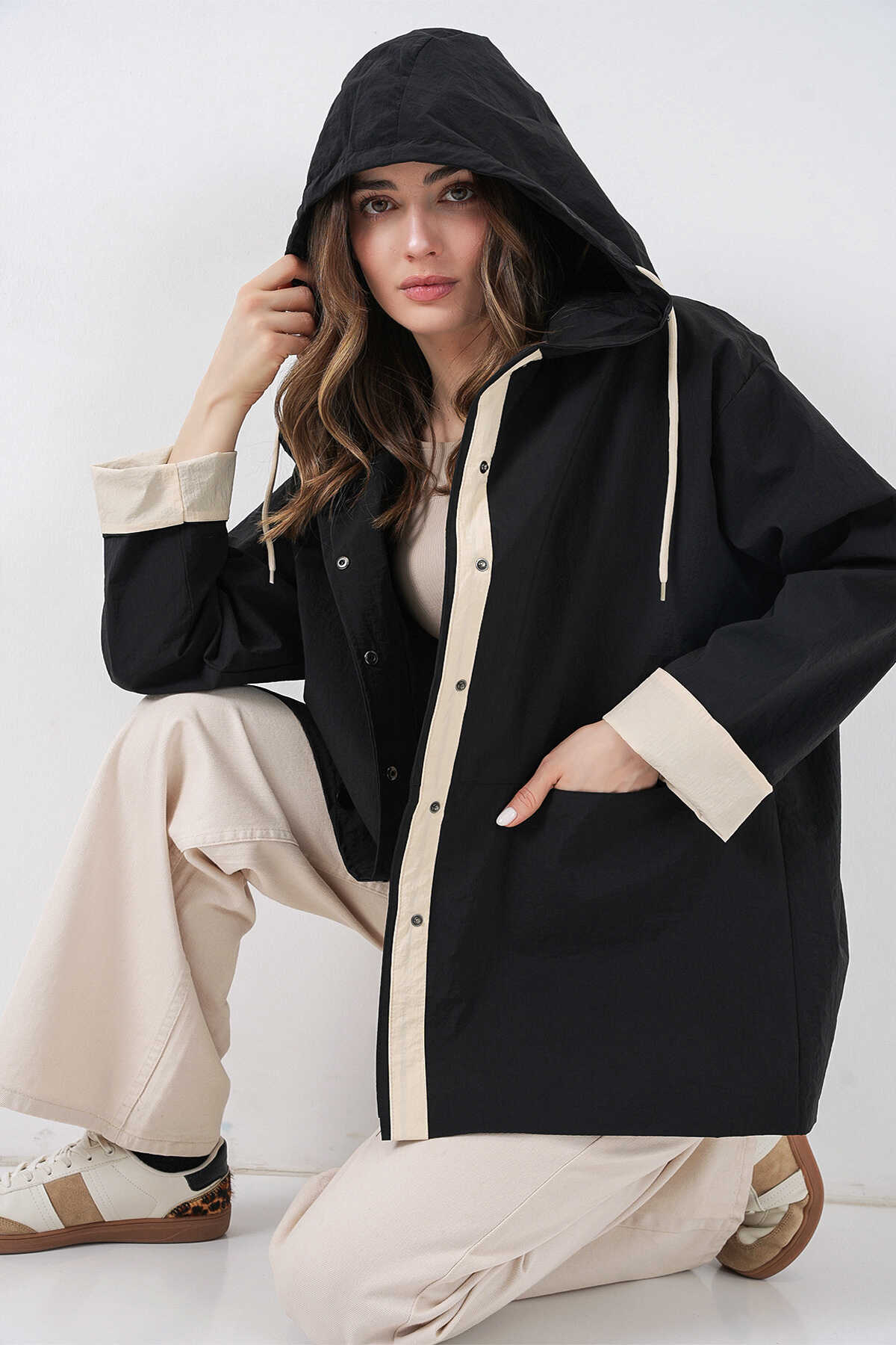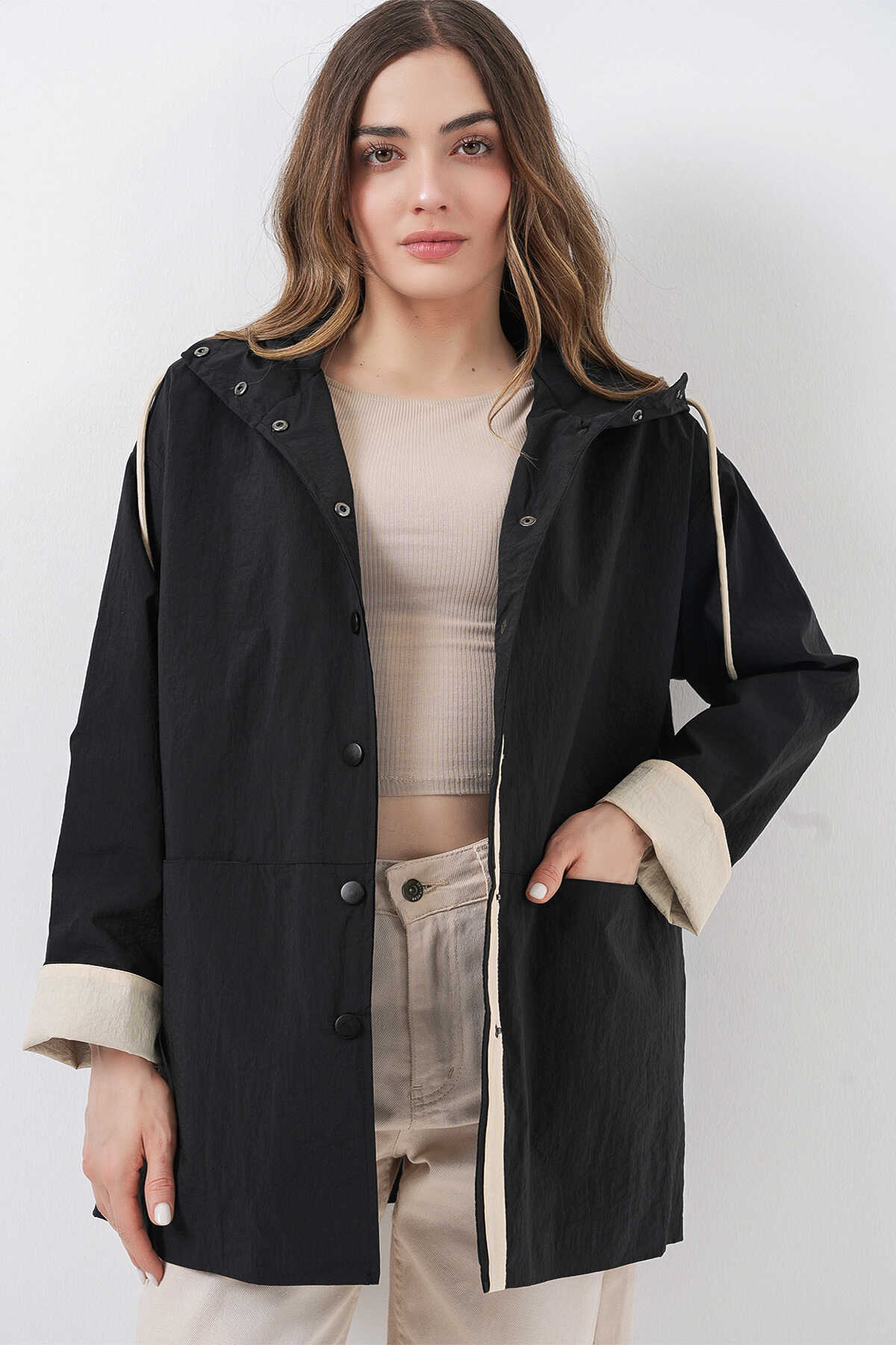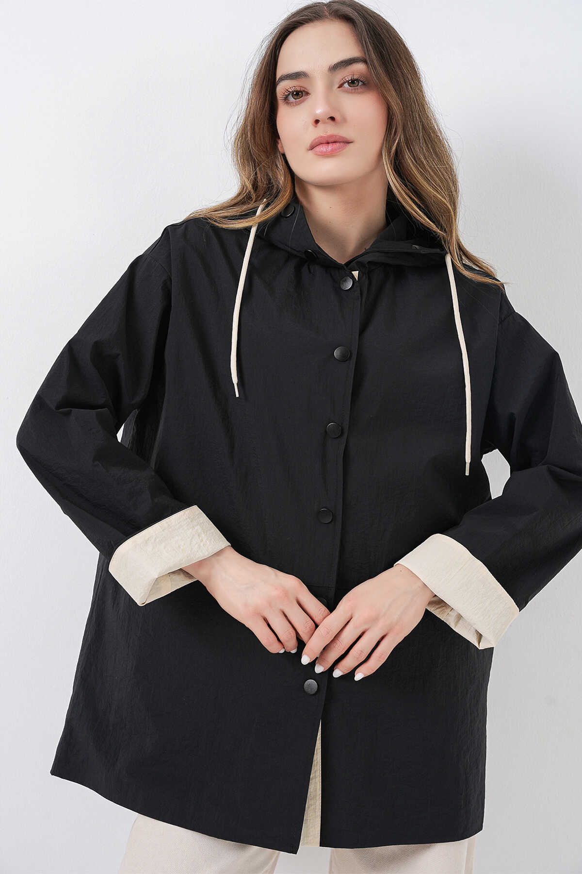 Kadin Teknik Kumas Parasüt Kumas Kapüsonlu Trençkot