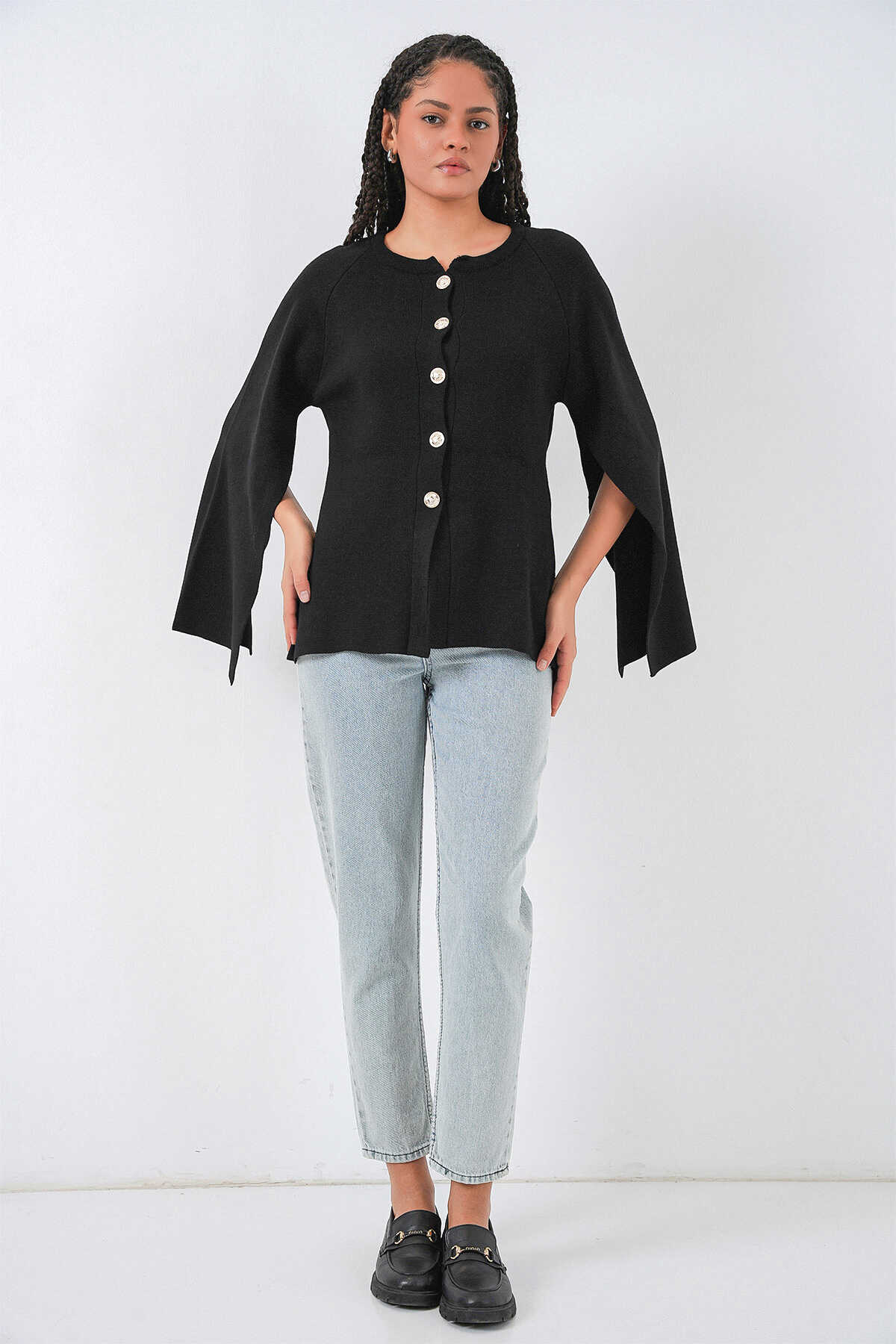 Kadın Triko Panço Hırka 15965 - Siyah - Kombin