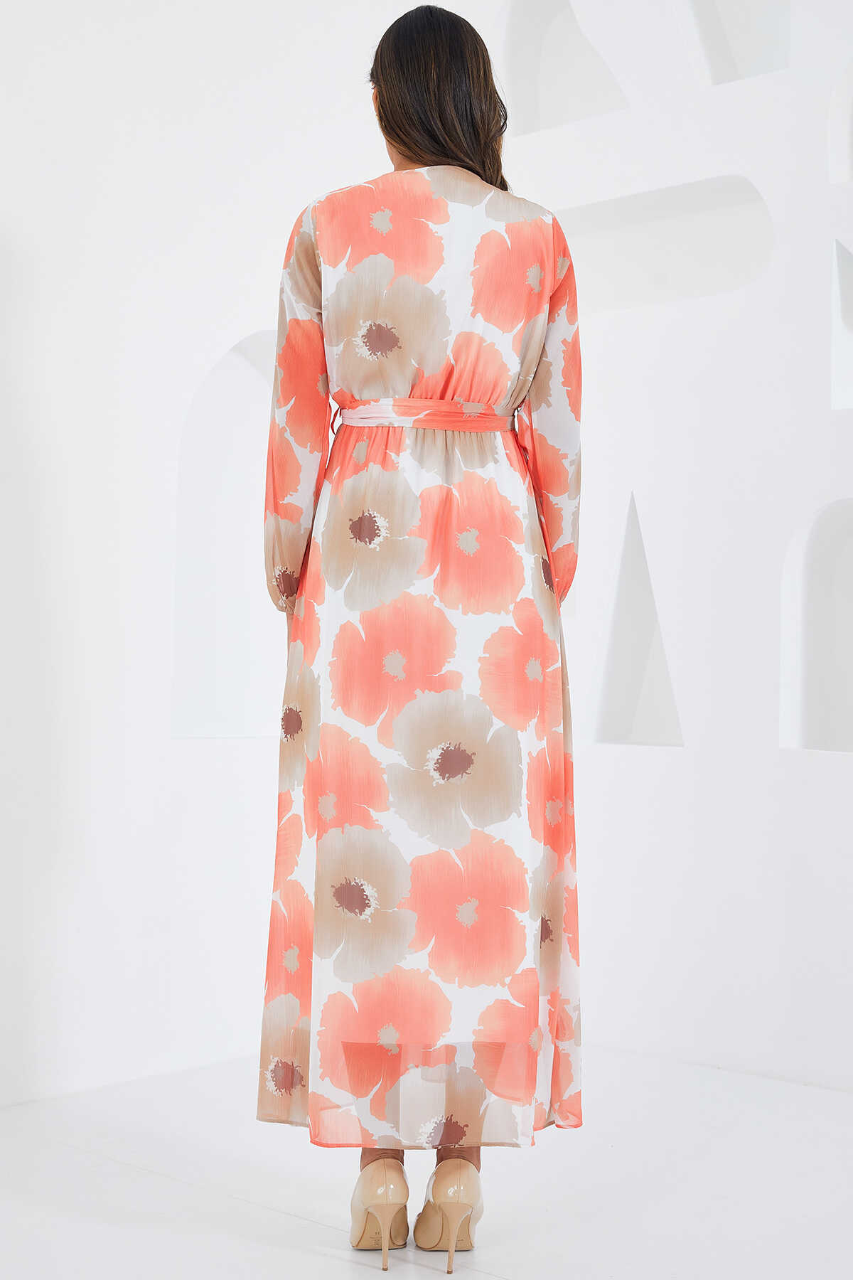 Kadın Turuncu Bej Çiçek Desenli Şifon Elbise 2134