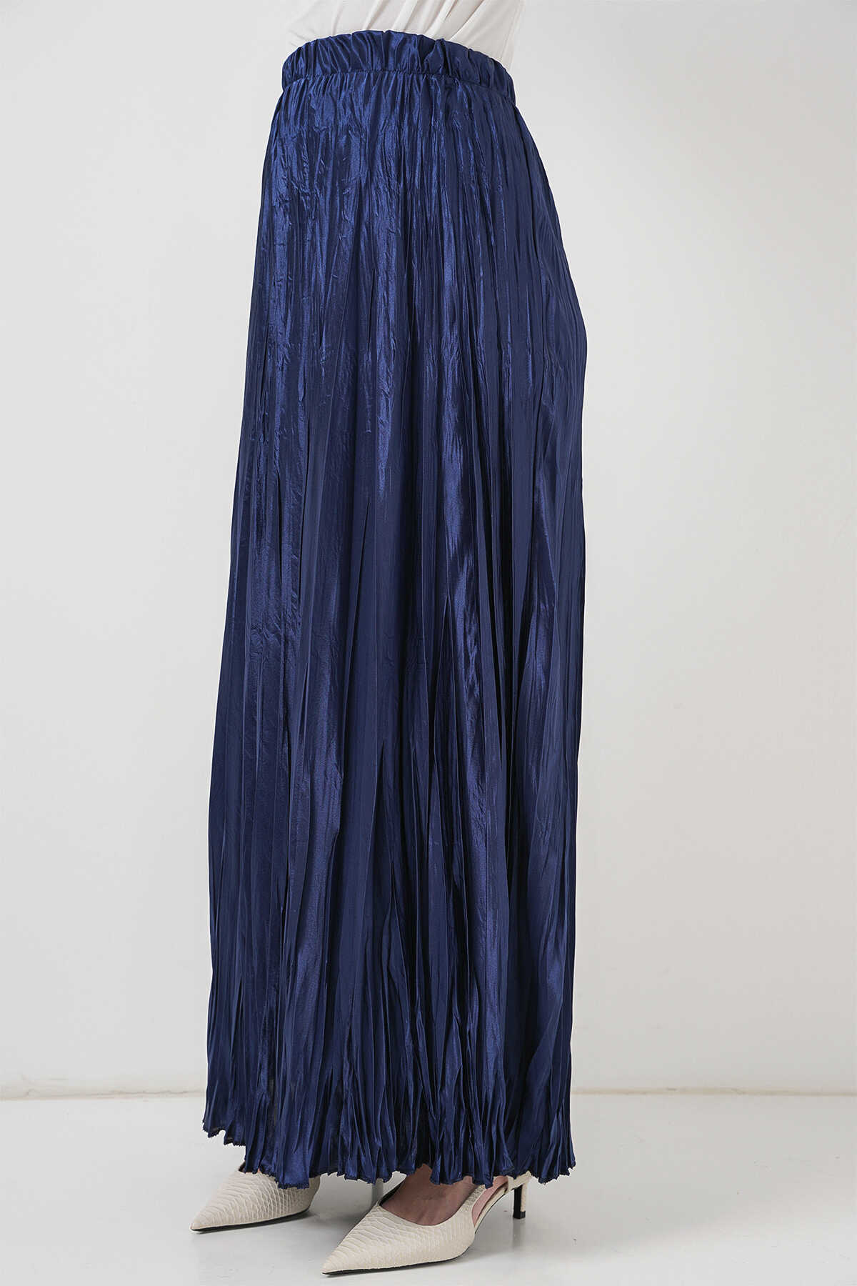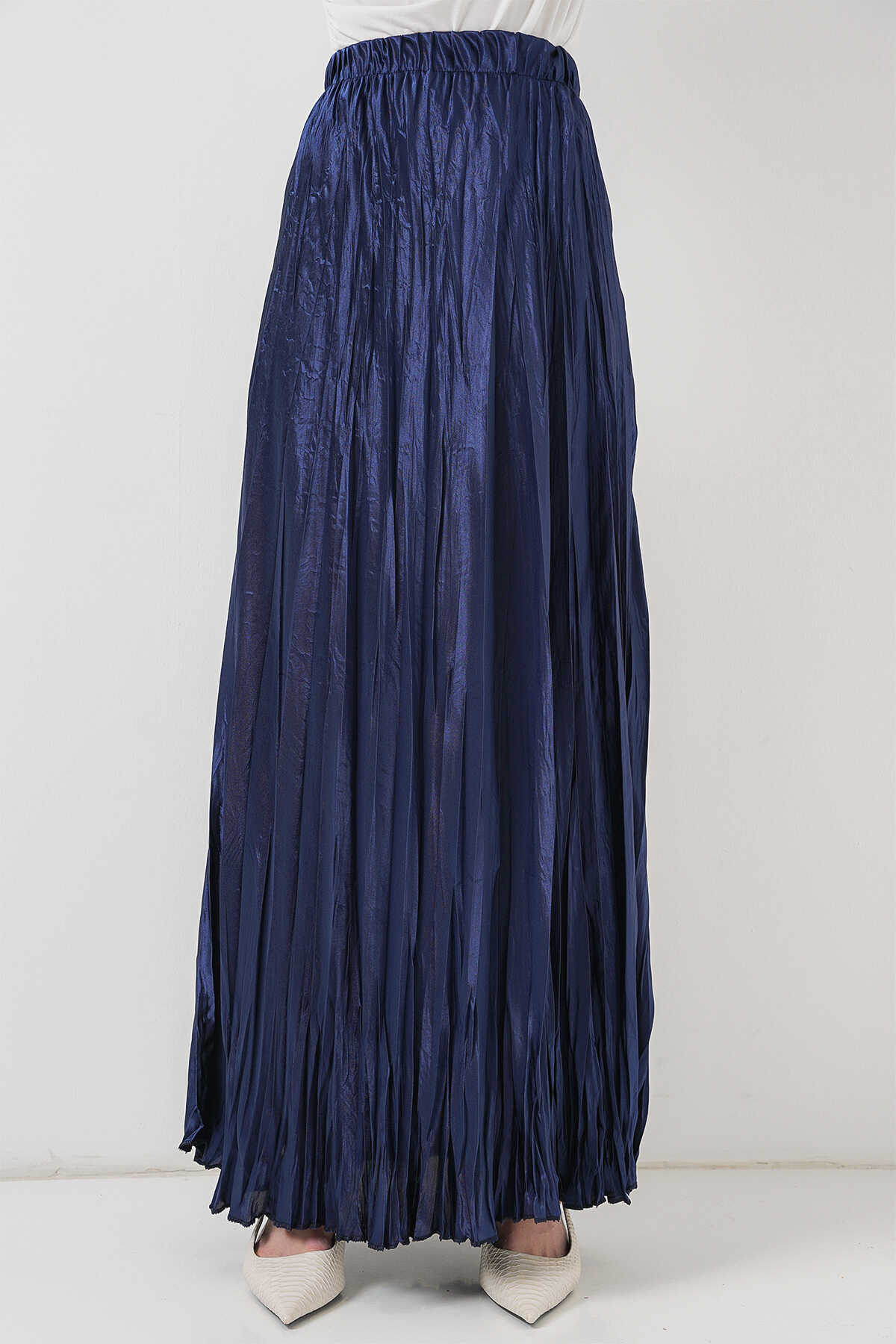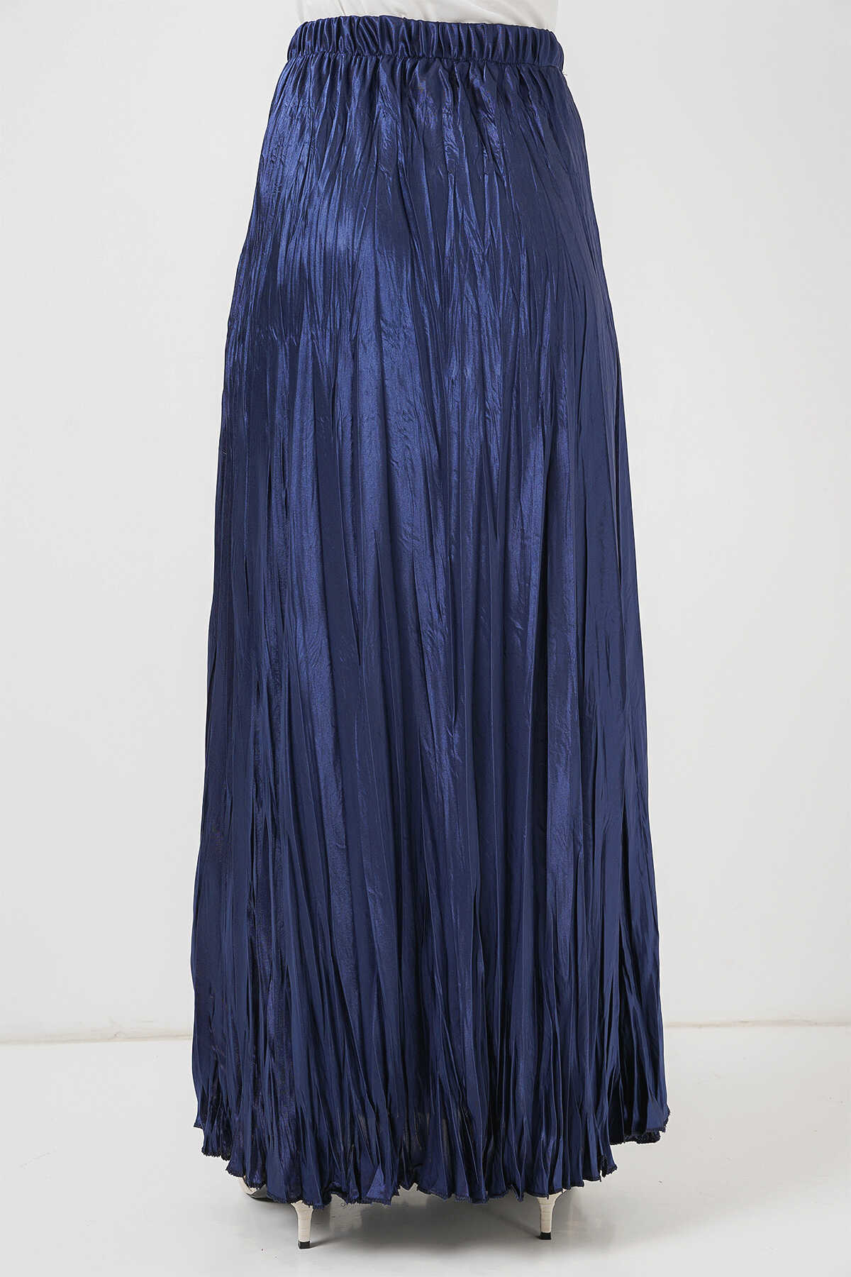 Kadın Uzun Kırışık Parlak Etek 8034 - D.Lacivert