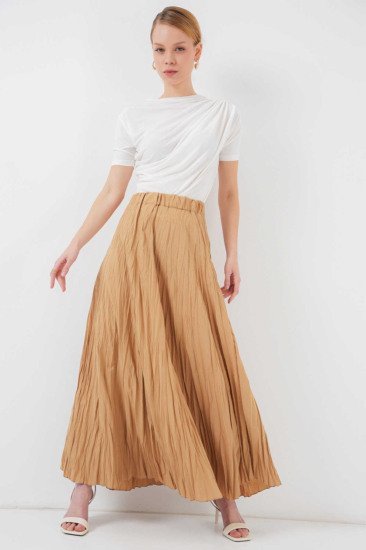 Kadın Uzun Kırışık Etek 8042 - Bisküvi - Kombin