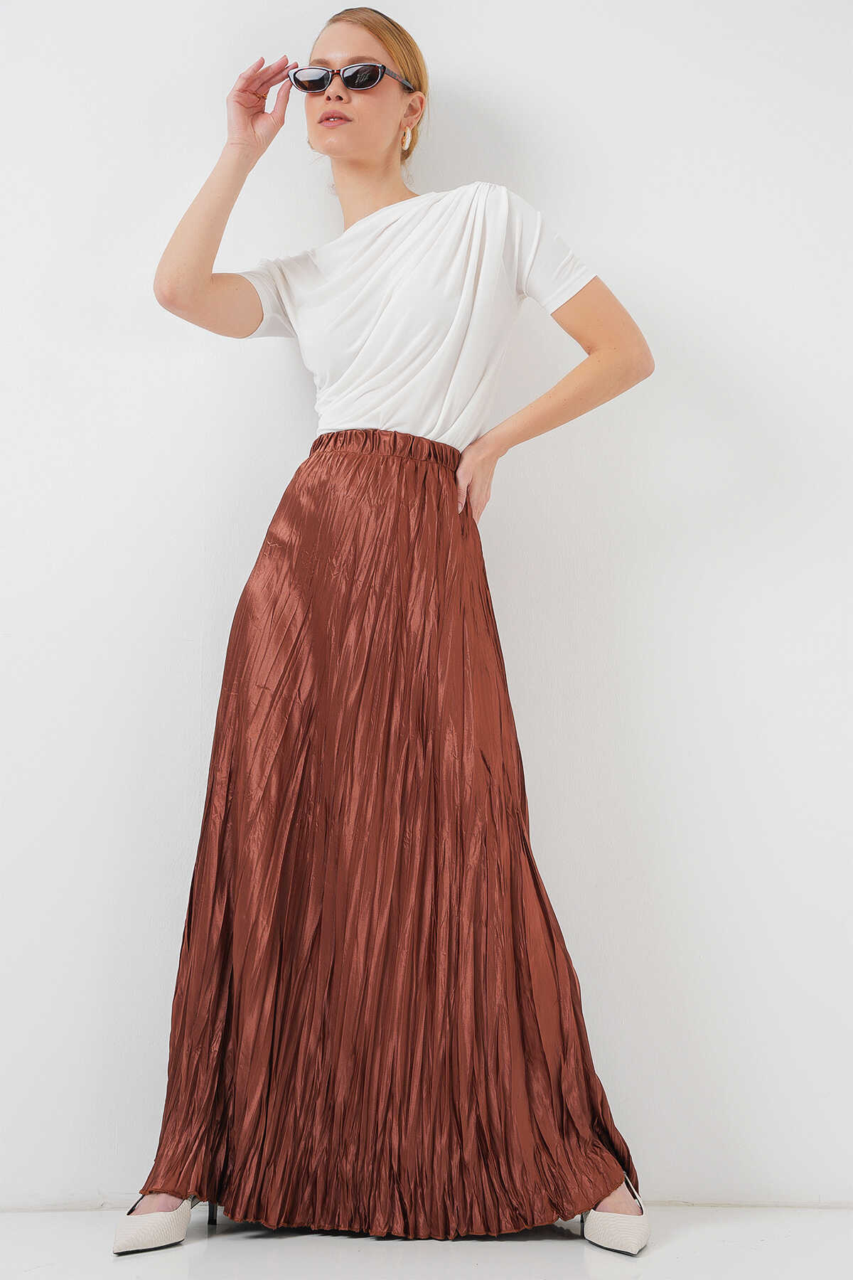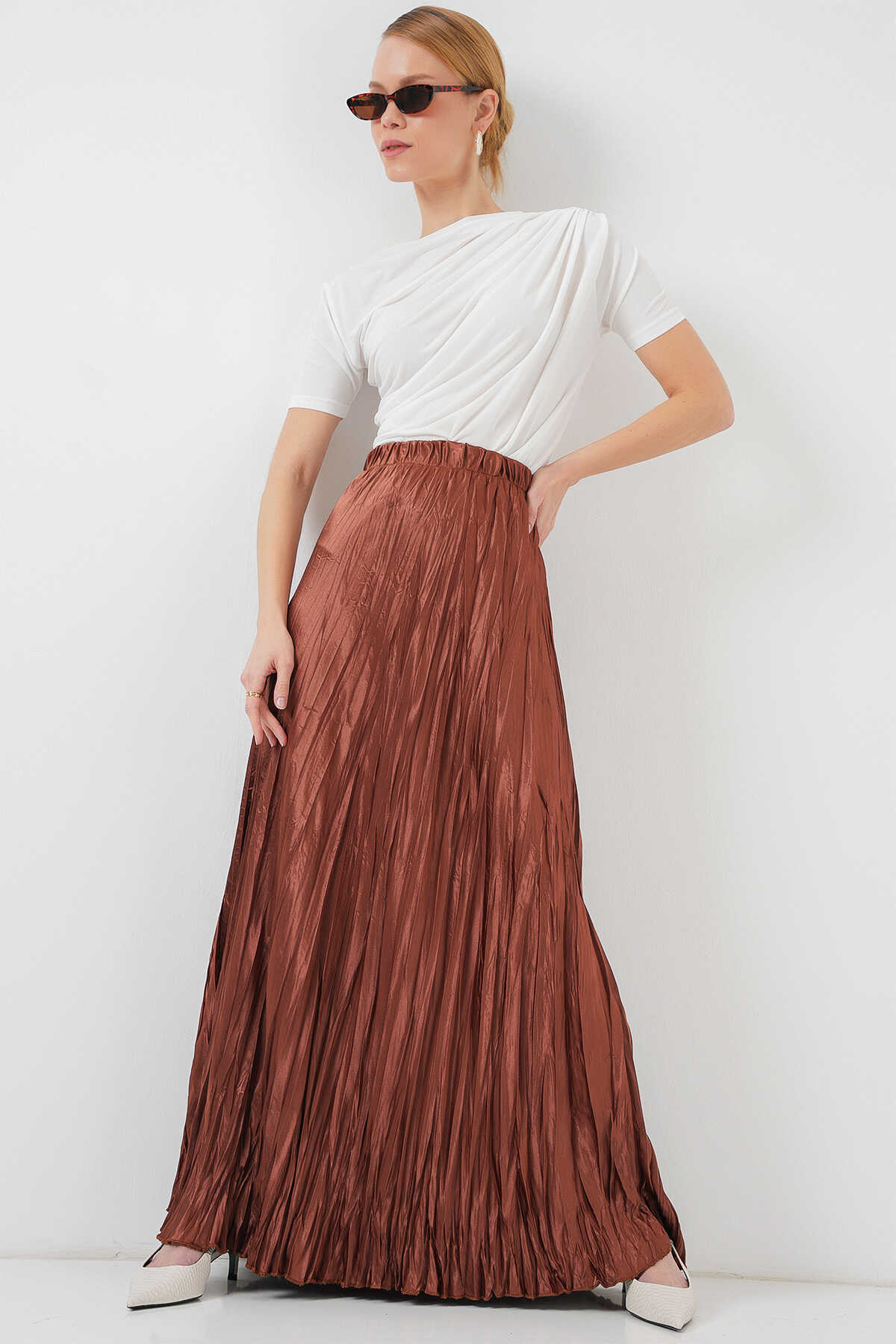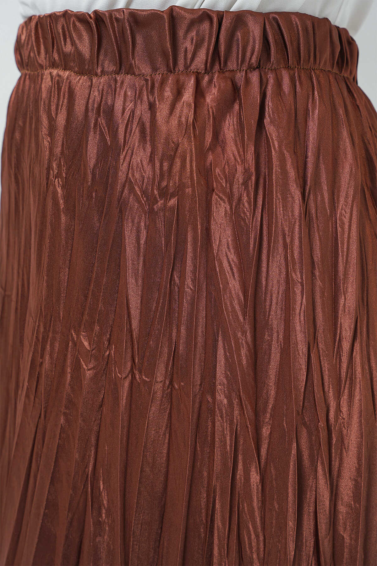 Kadın Uzun Kırışık Parlak Etek 8034 - Taba - Kombin