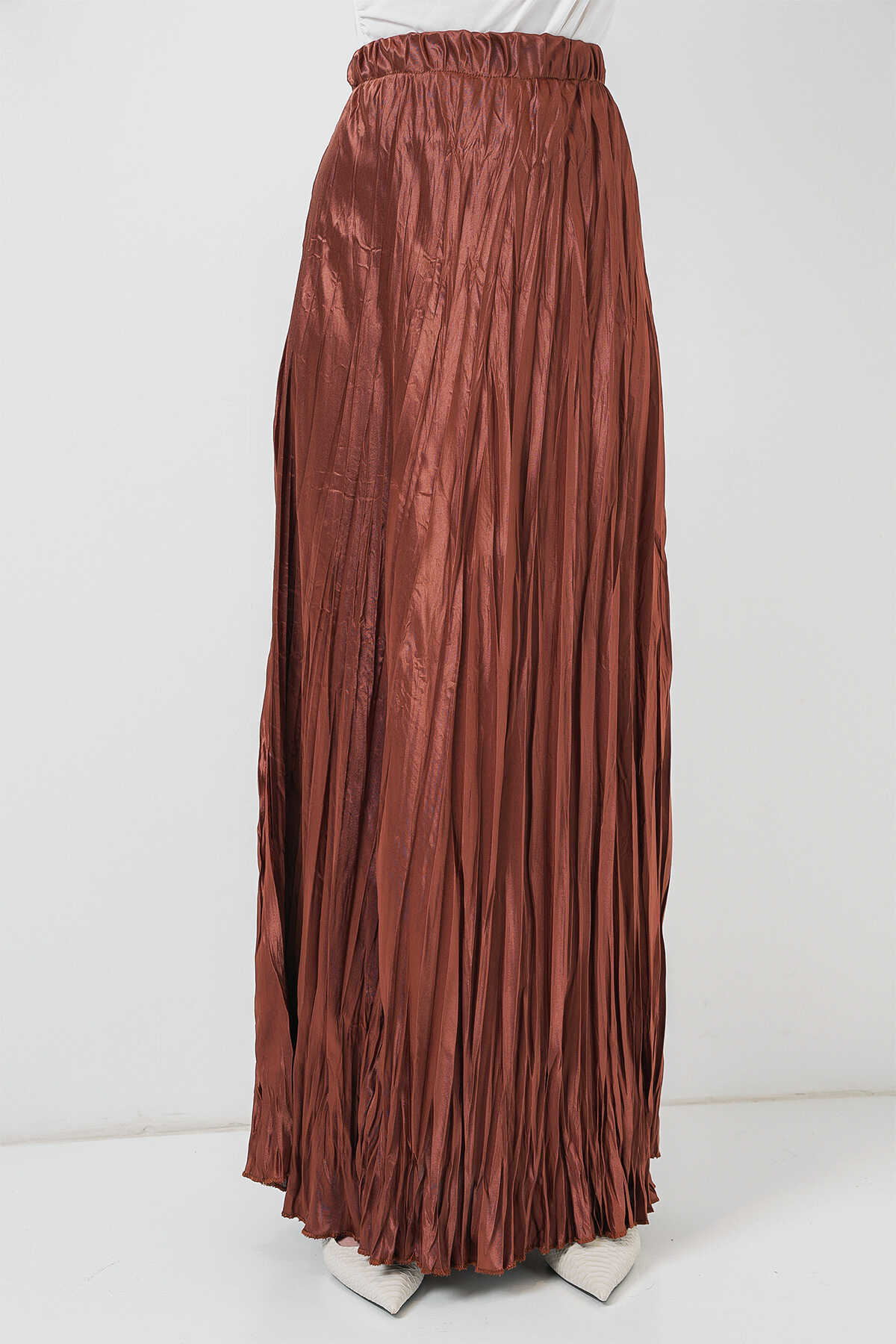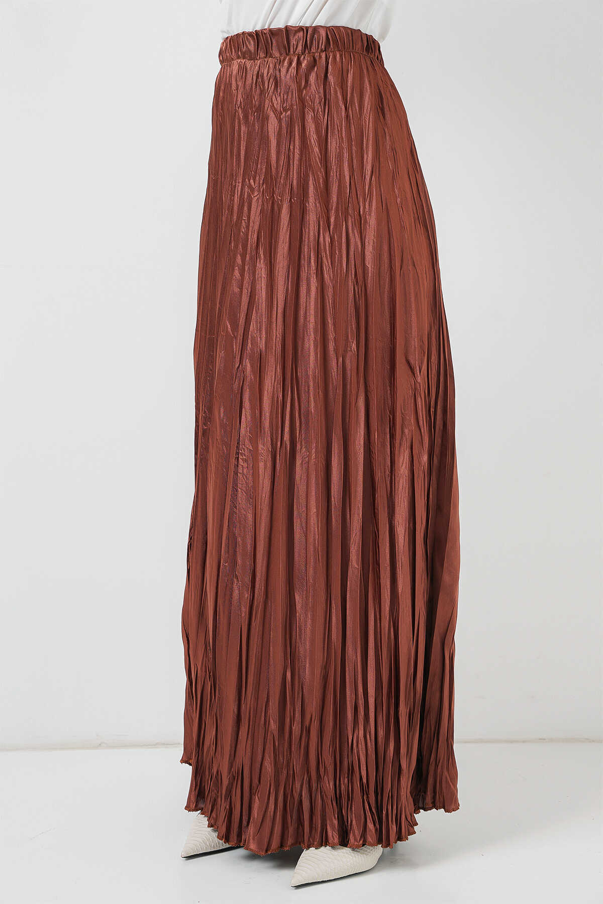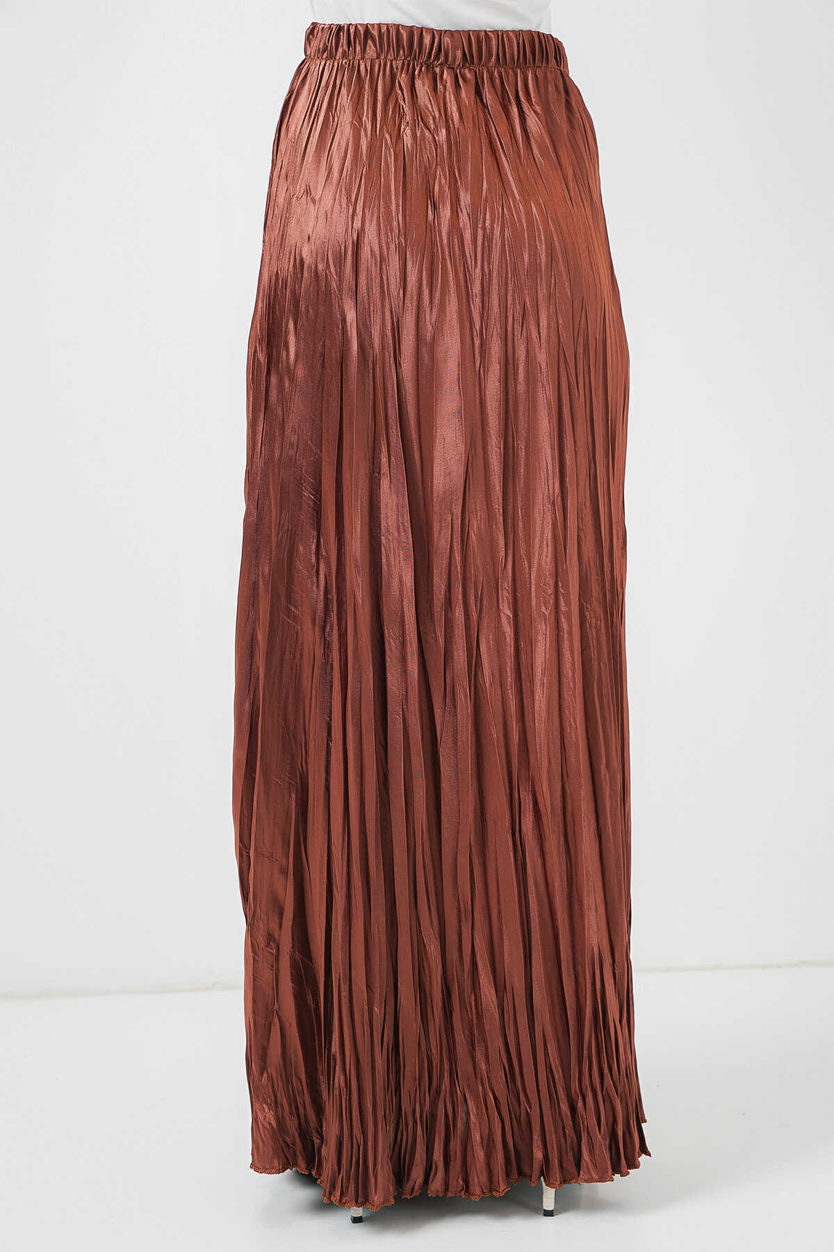 Kadın Uzun Kırışık Parlak Etek 8034 - Taba