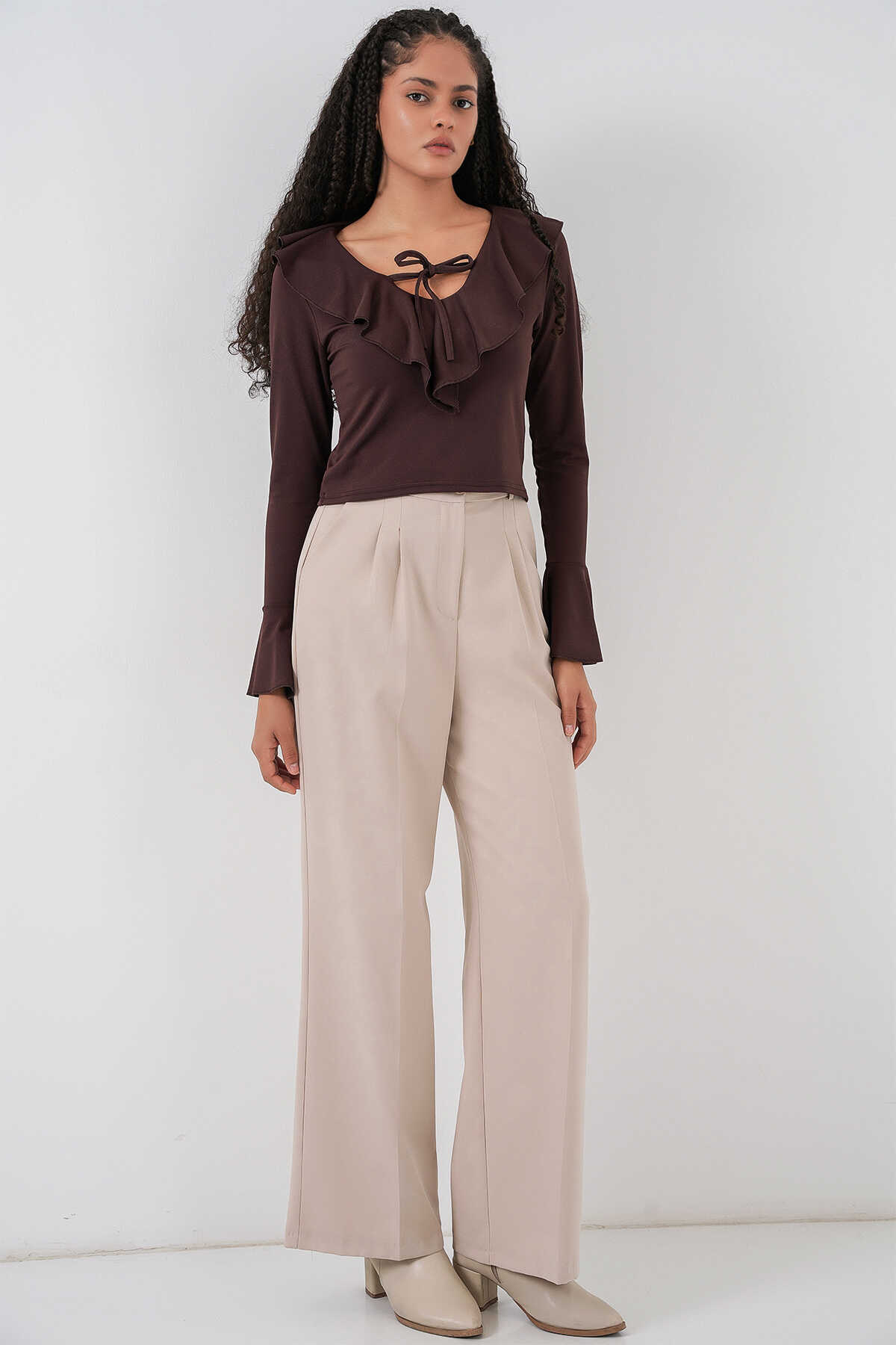 Kadın Uzun Kol Crop Bluz 979 - Kahverengi - Kombin