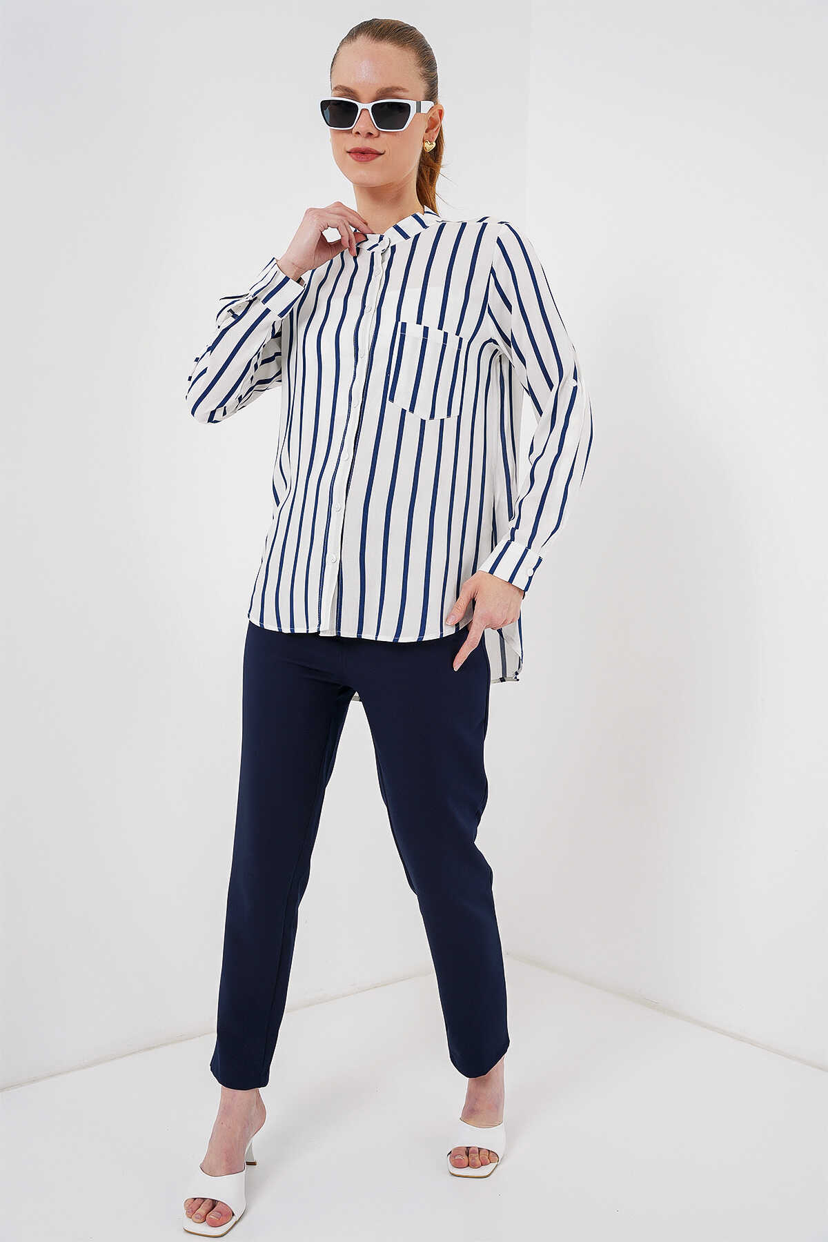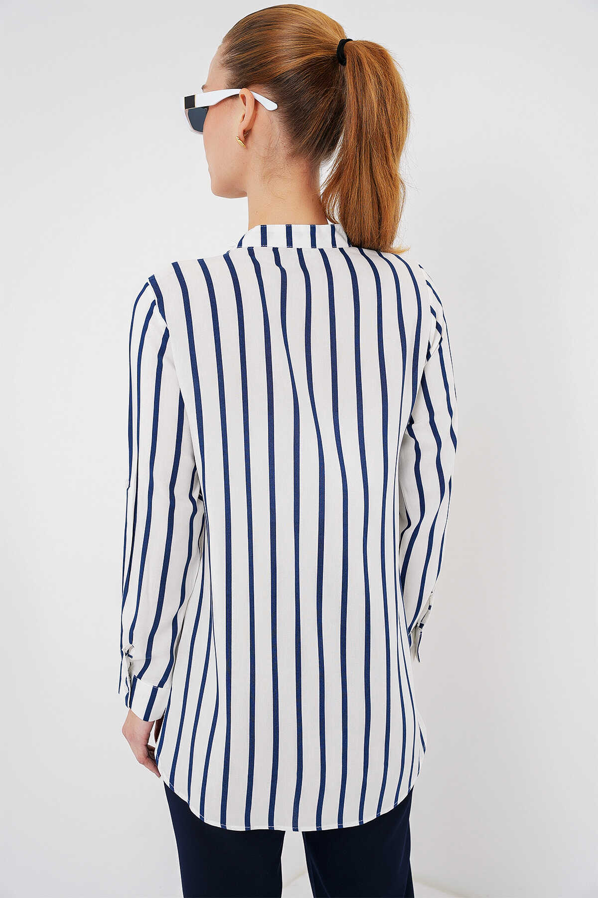 Kadın Uzun Kollu Çizgili Gömlek 20283 - B.Lacivert - Kombin