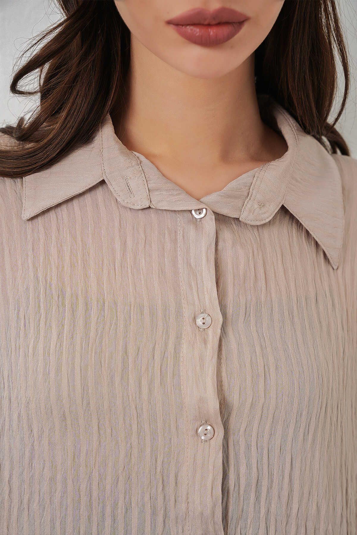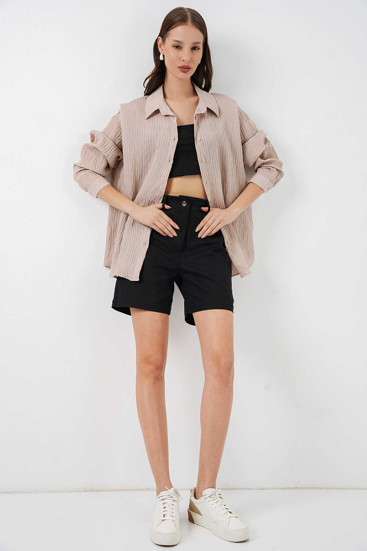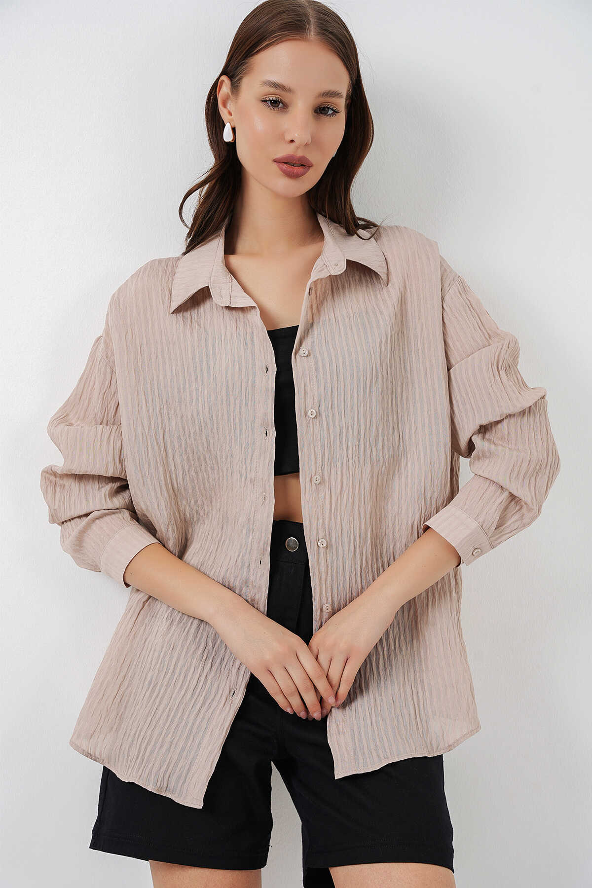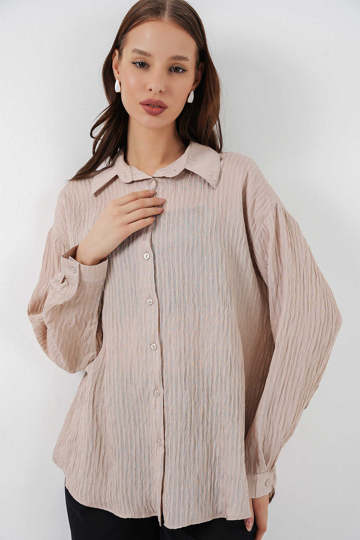 Kadın Uzun Oversize Gömlek 20320 - Bej - Kombin
