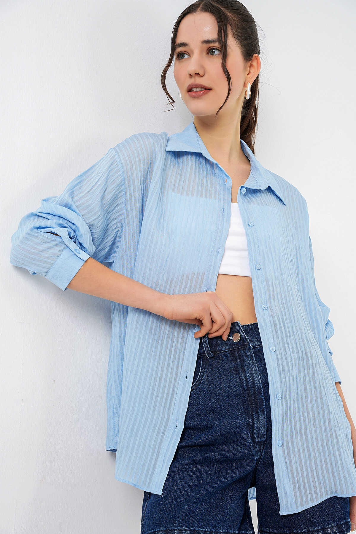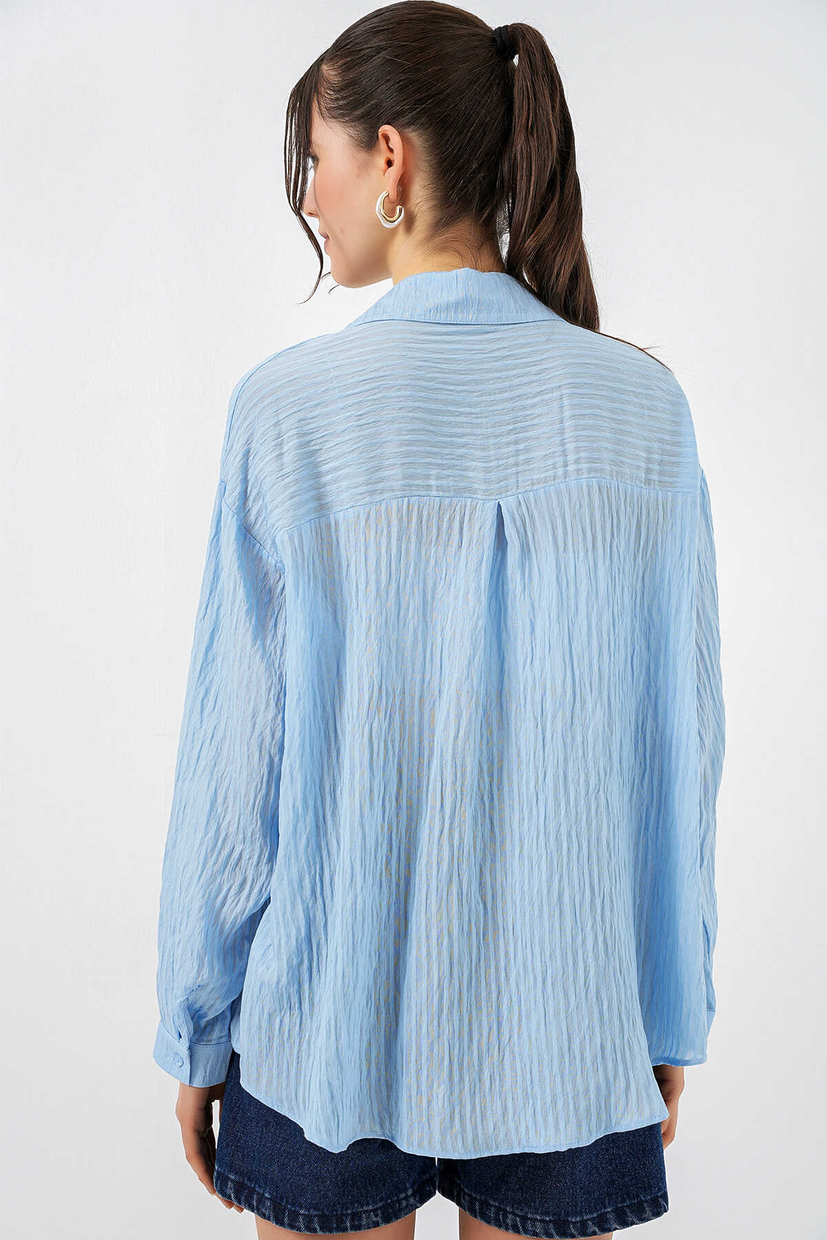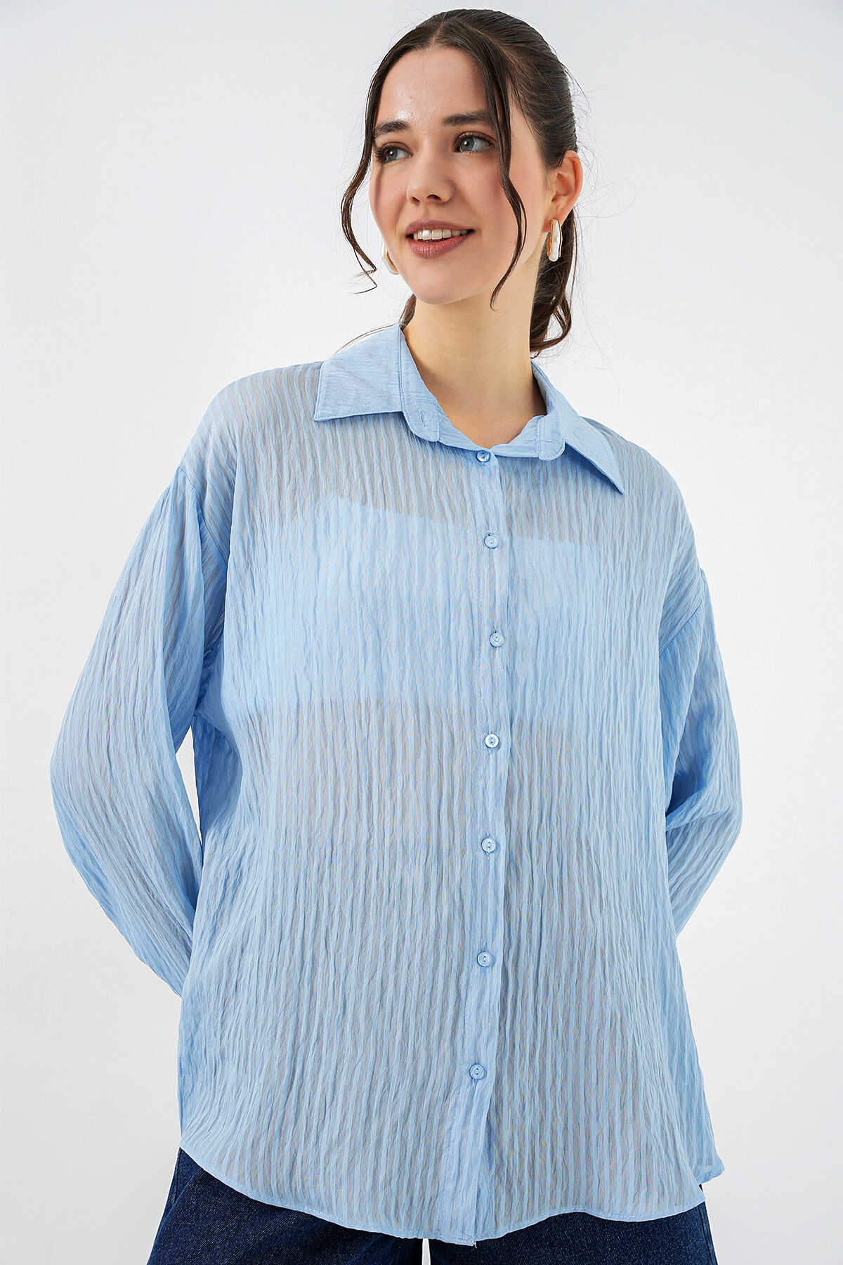 Kadın Uzun Oversize Gömlek 20320 - Mavi - Kombin
