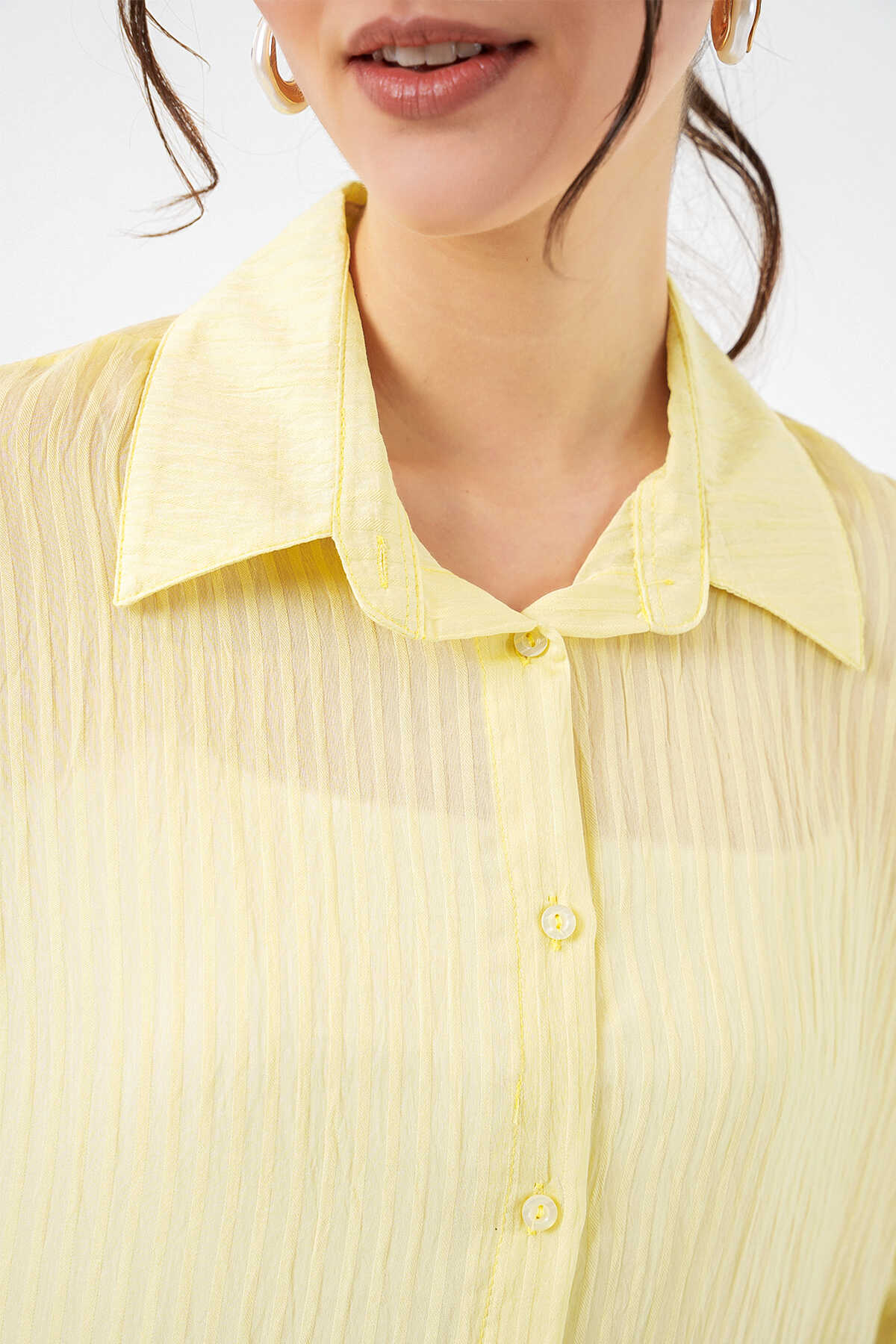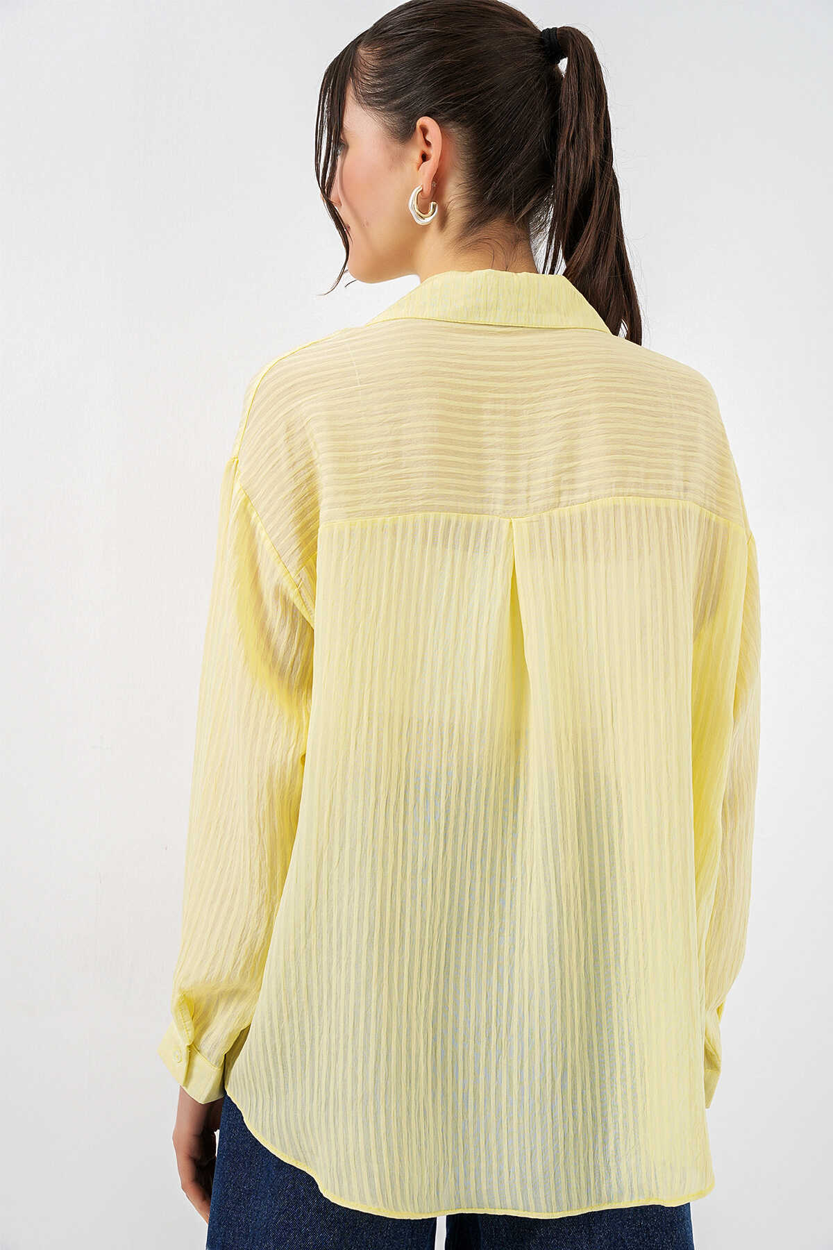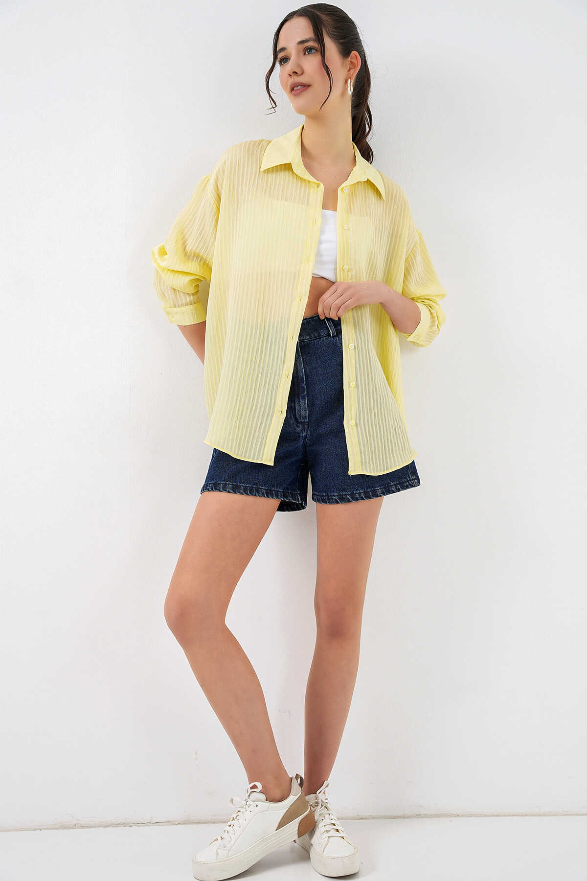 Kadın Uzun Oversize Gömlek 20320 - Sarı - Kombin