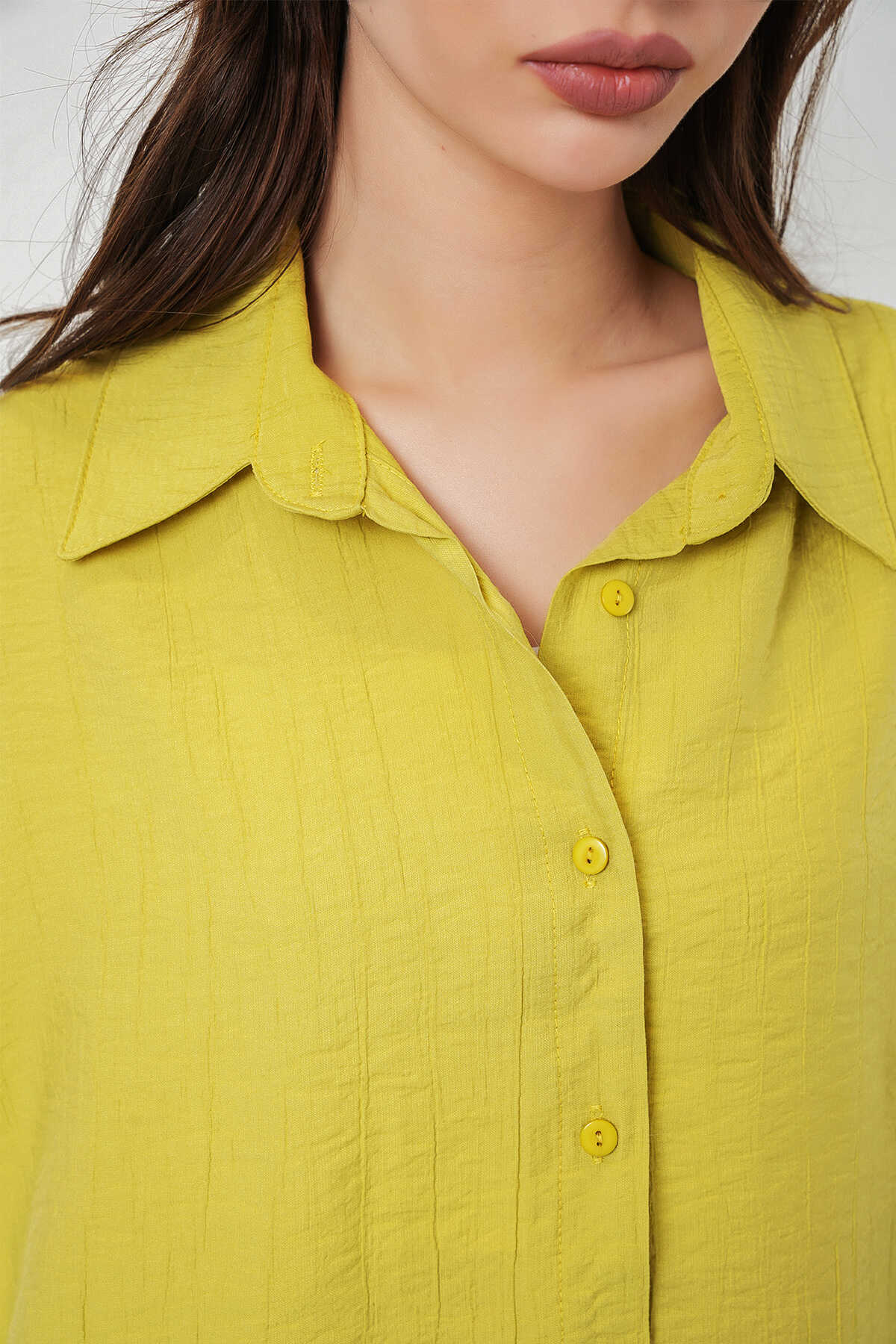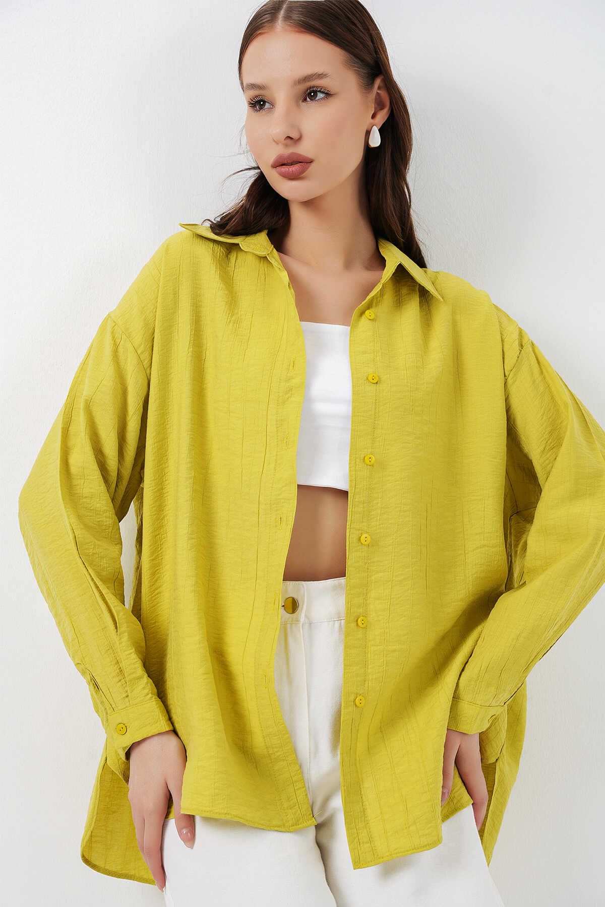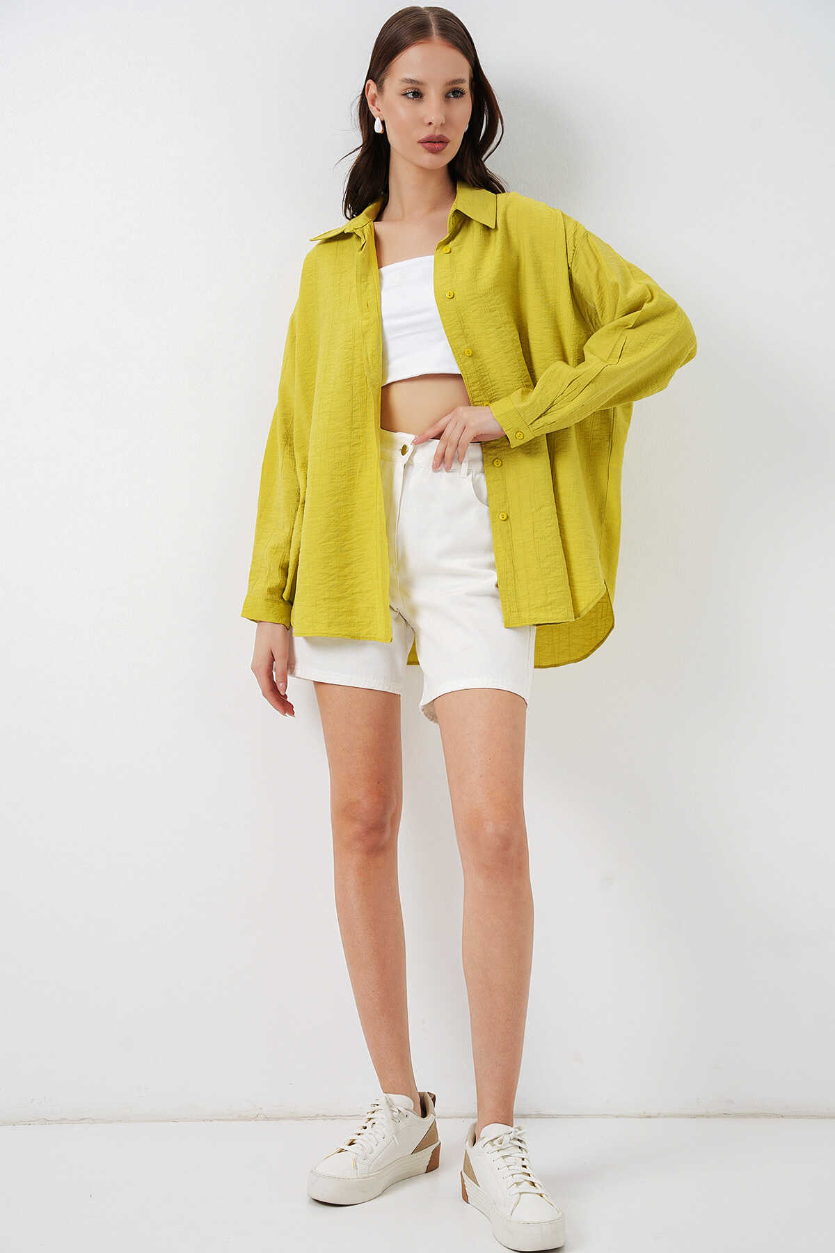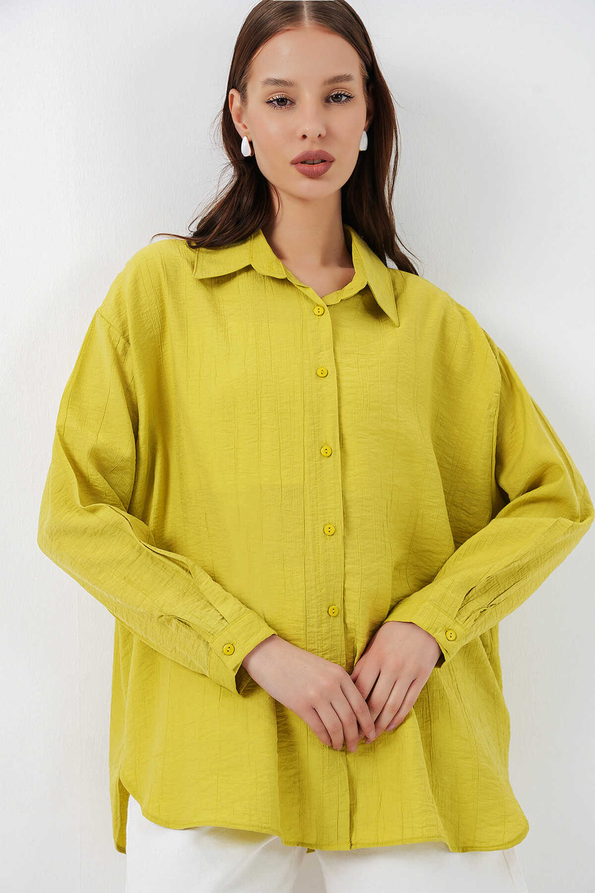 Kadın Uzun Oversize Gömlek 20334 - Hardal - Kombin