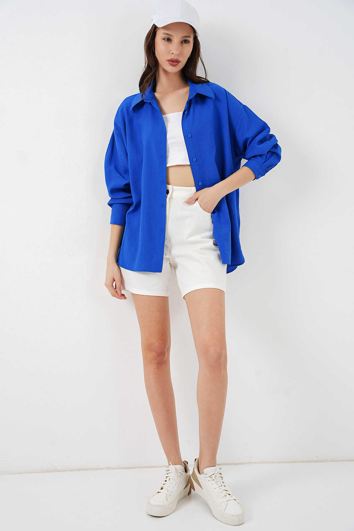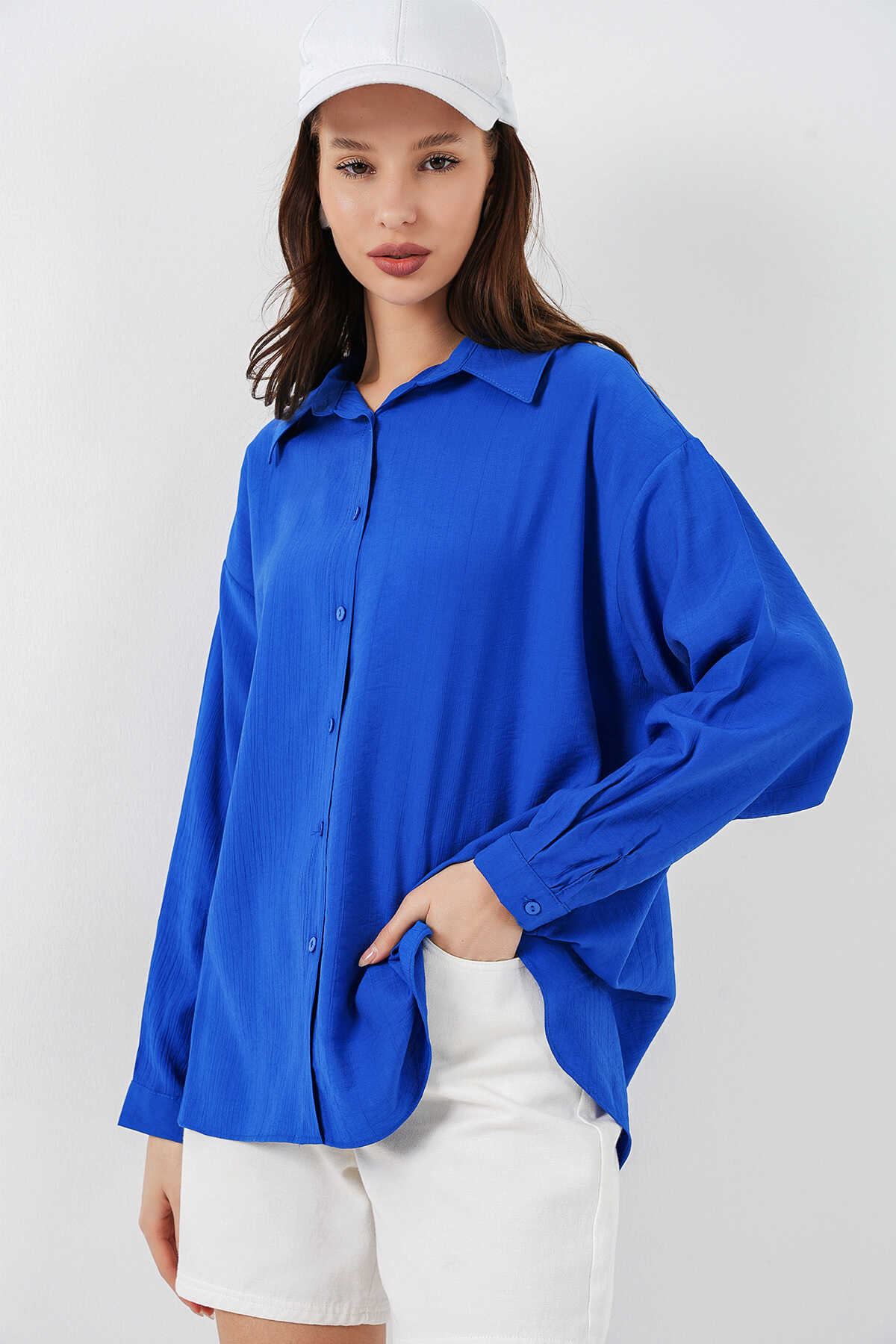 Kadın Uzun Oversize Gömlek 20334 - Saks - Kombin