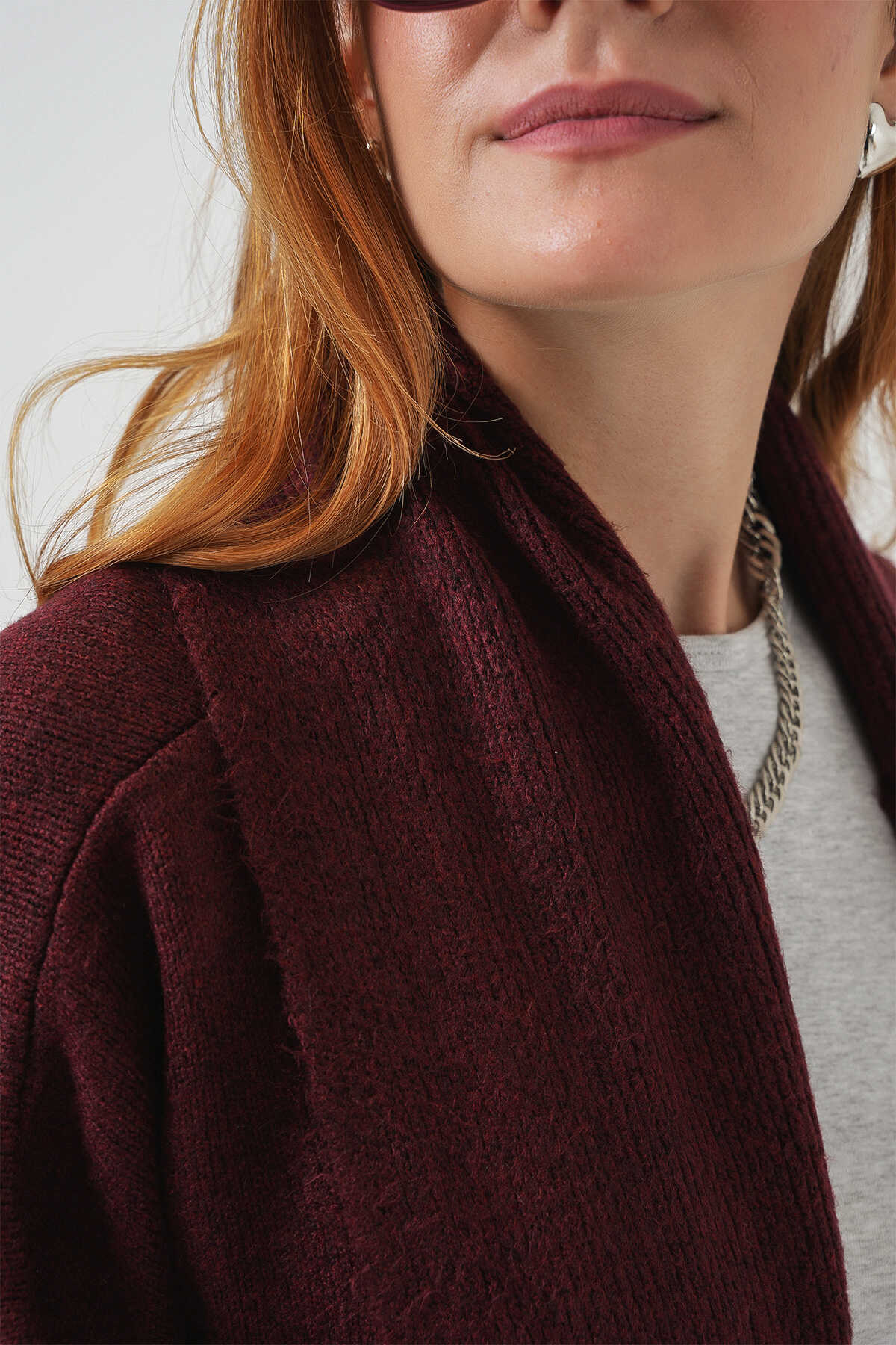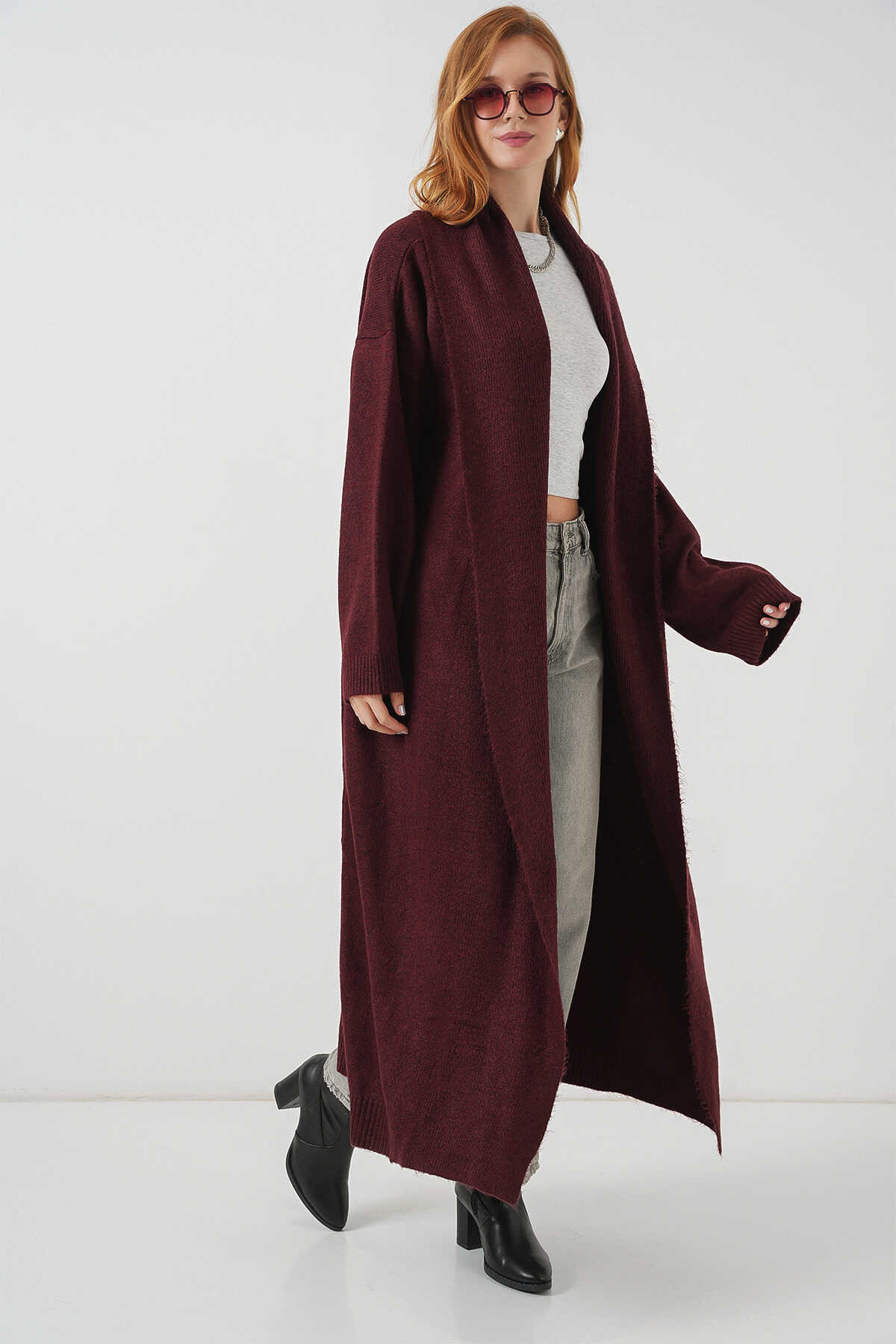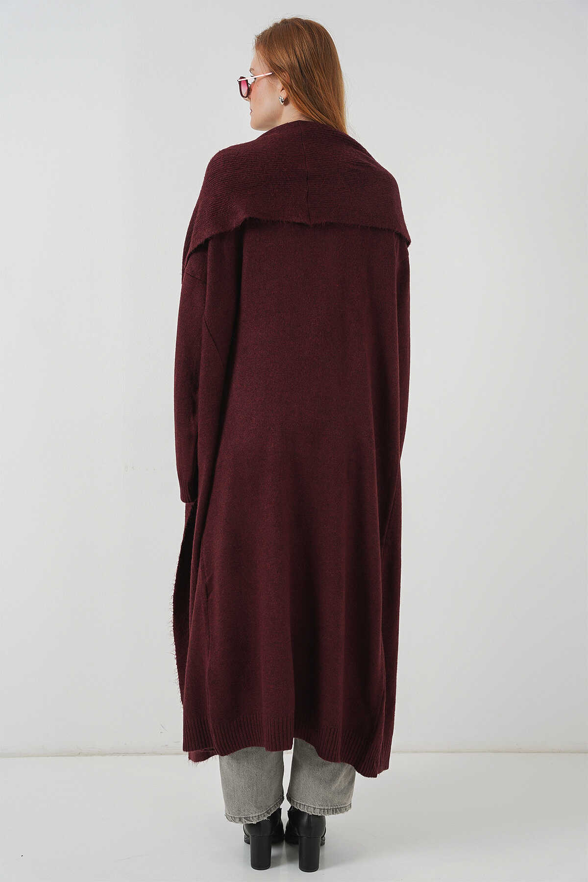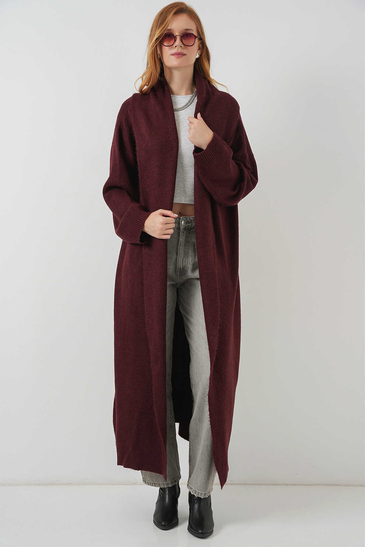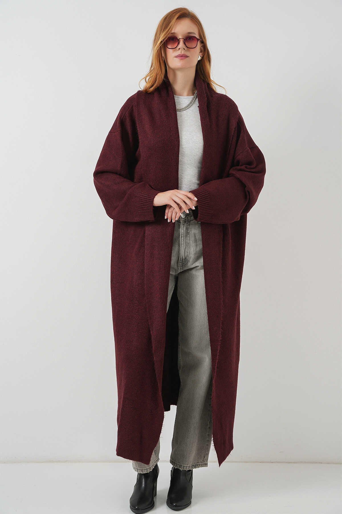 Kadın Uzun Oversize Triko Hırka 15924 - Bordo - Kombin
