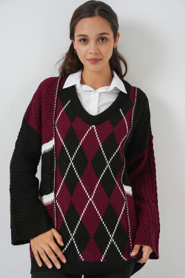 Kadin V Yaka Baklava Desen Örme Triko Kazak