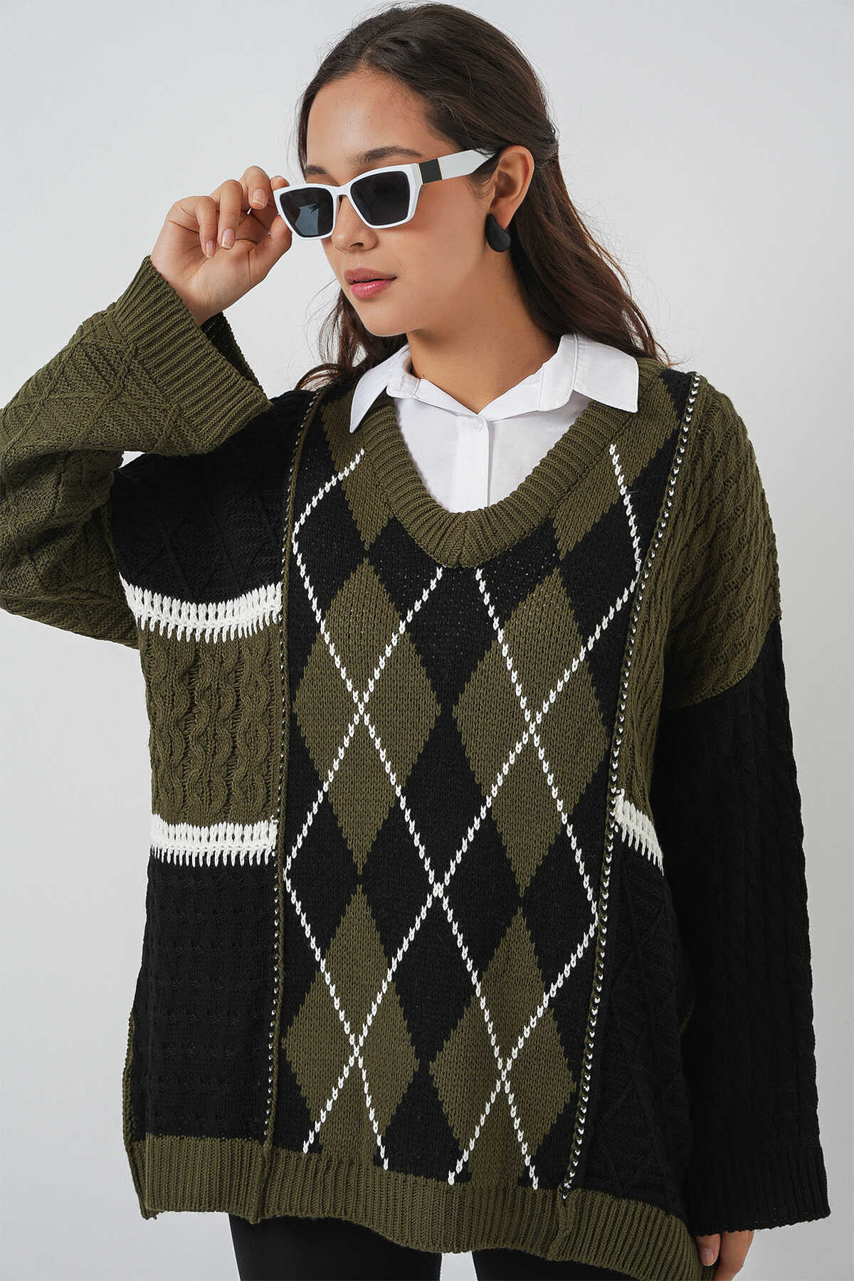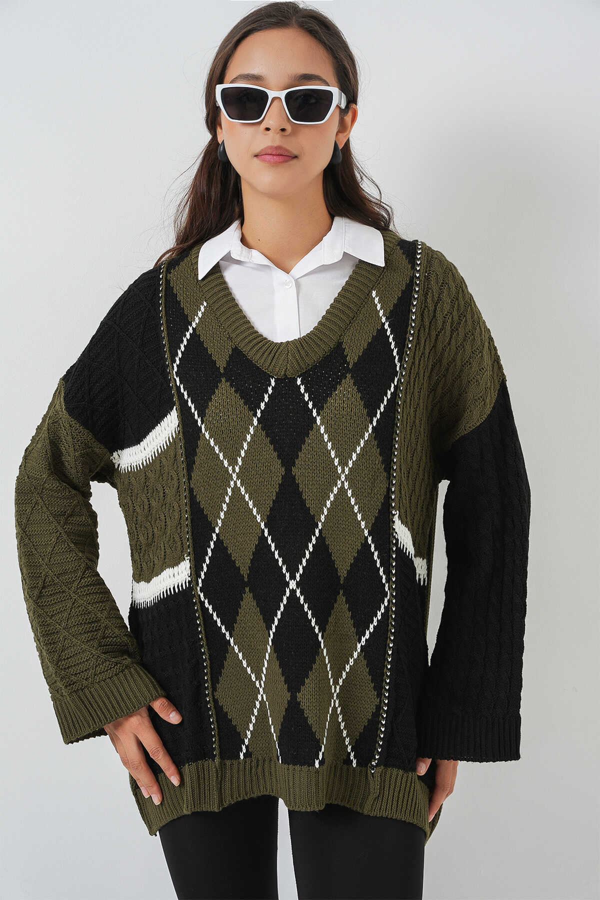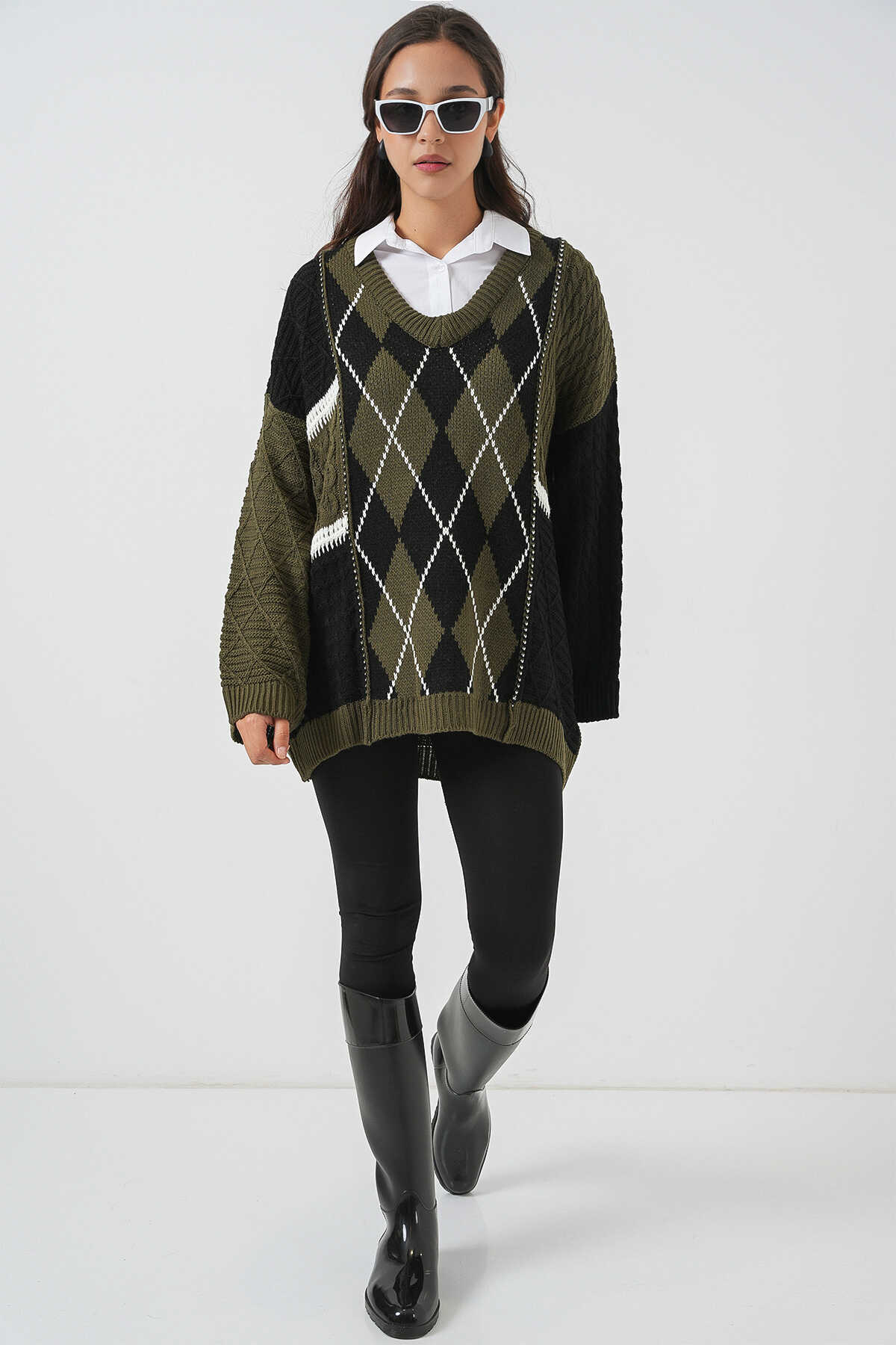 Kadin V Yaka Baklava Desen Örme Triko Kazak