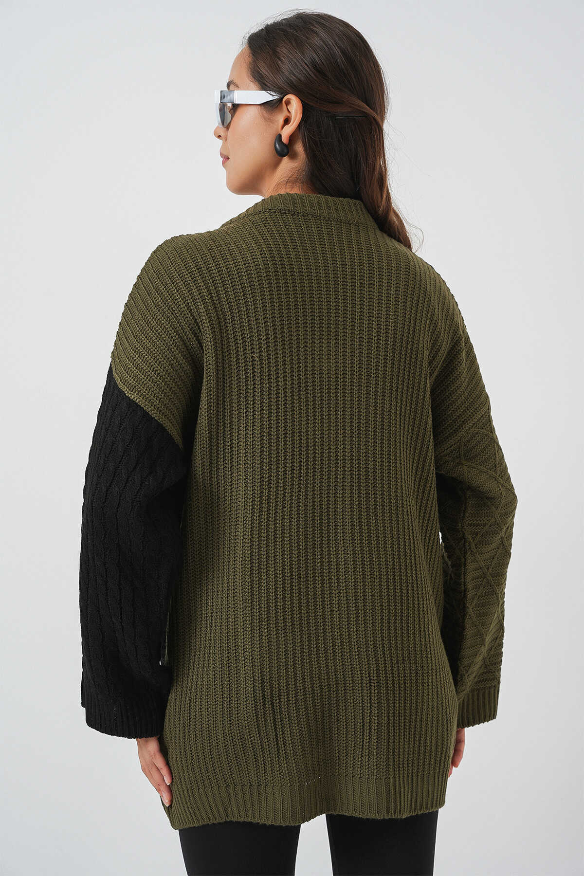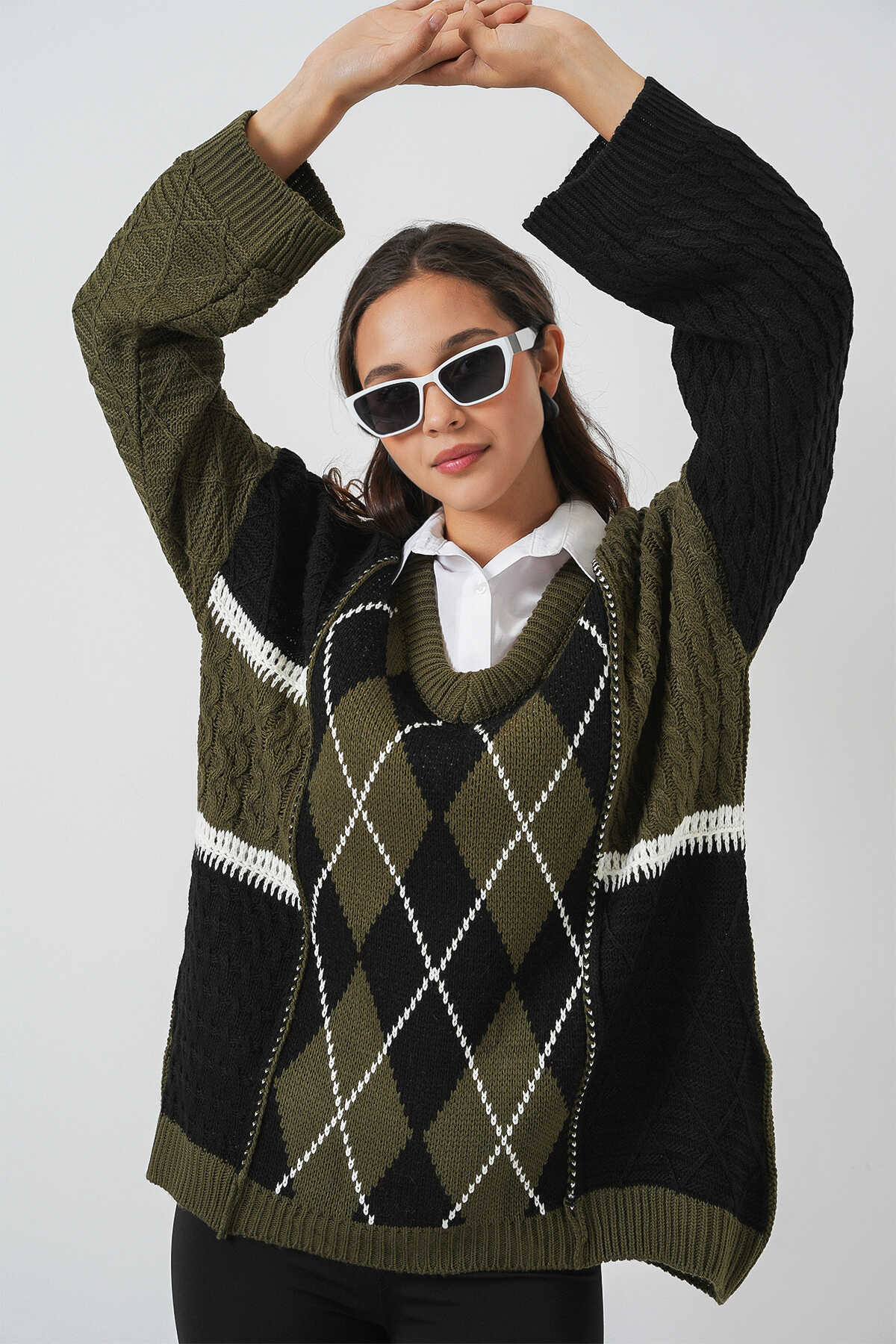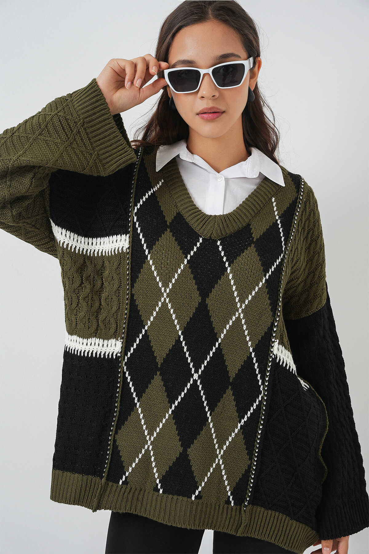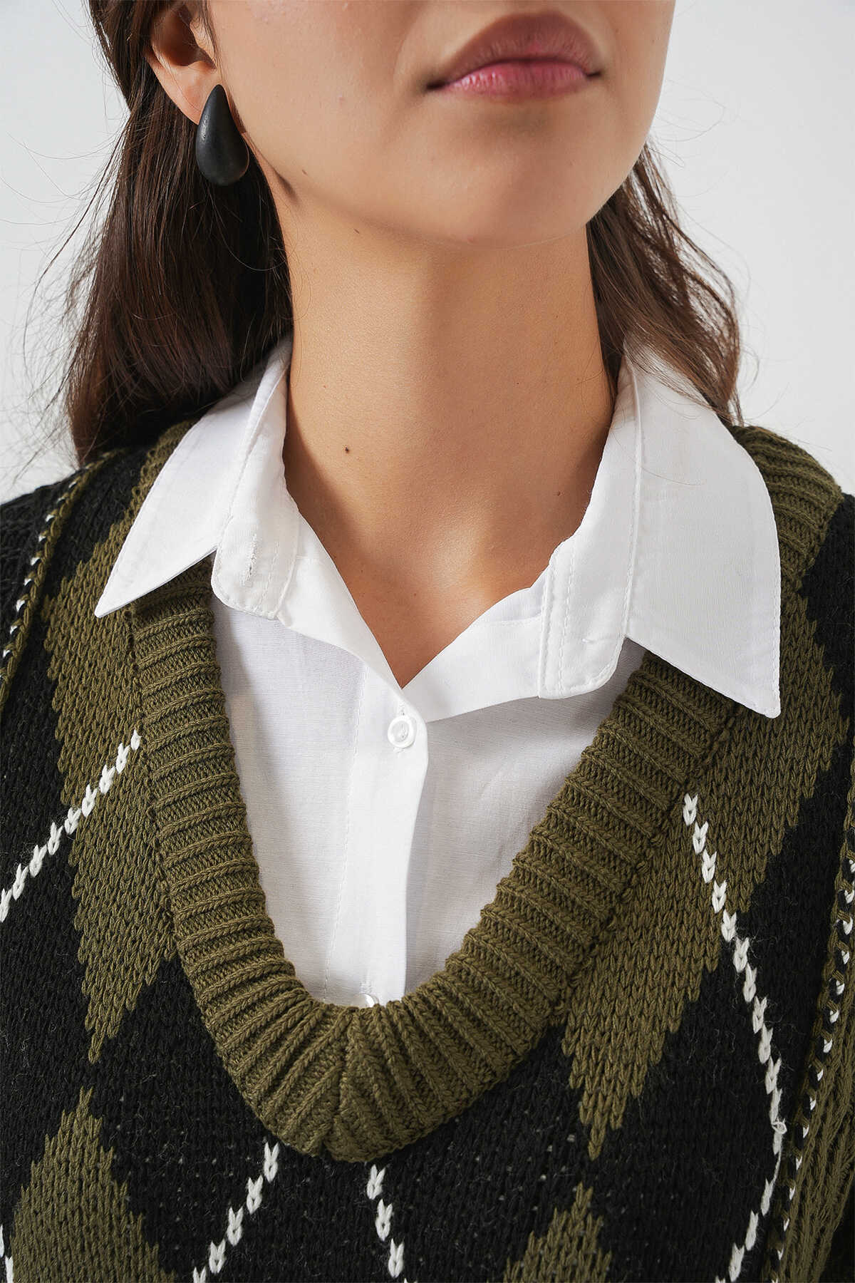 Kadin V Yaka Baklava Desen Örme Triko Kazak