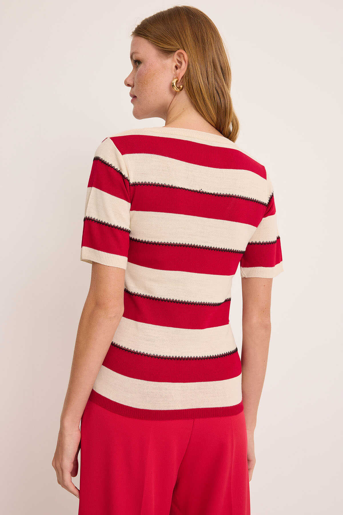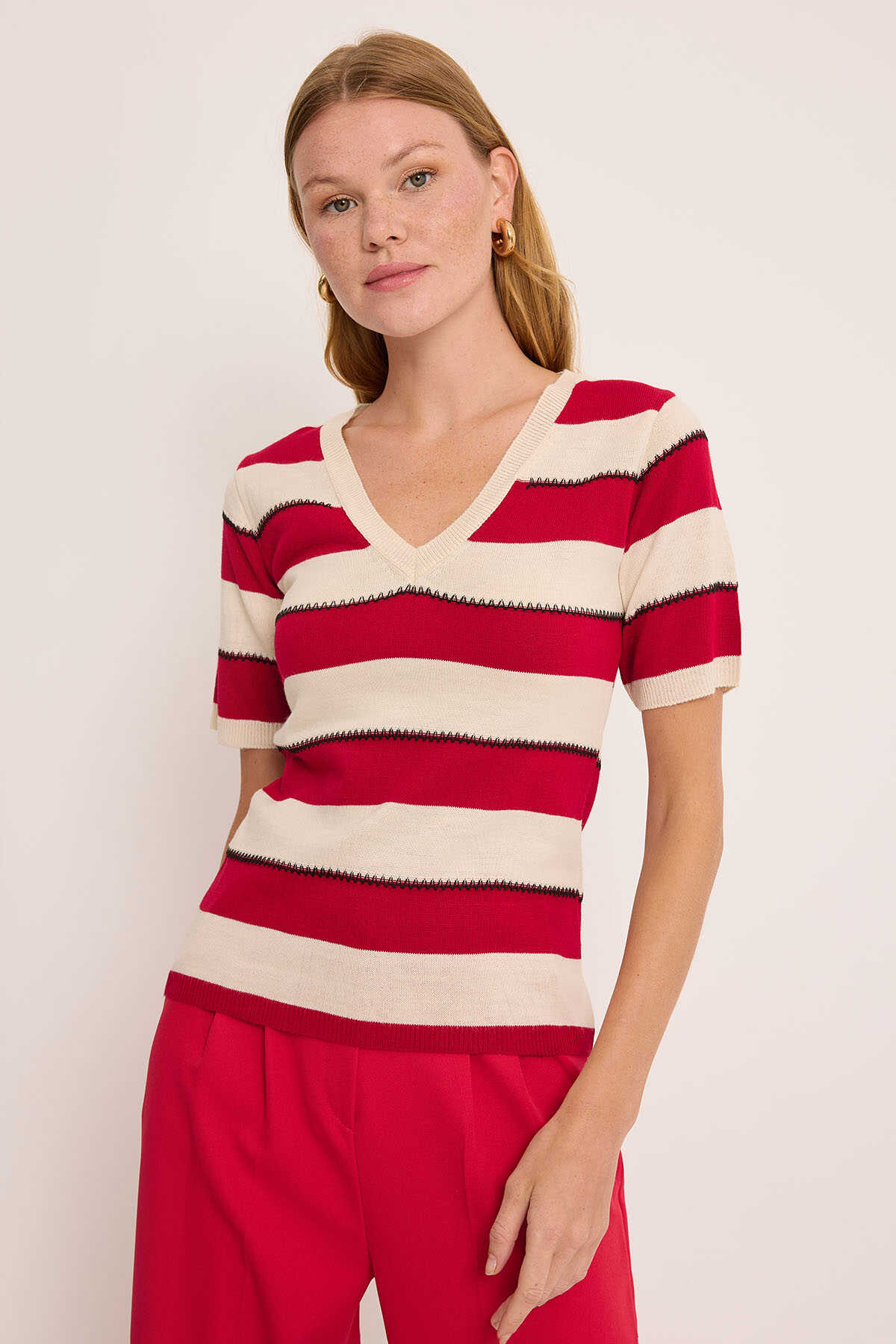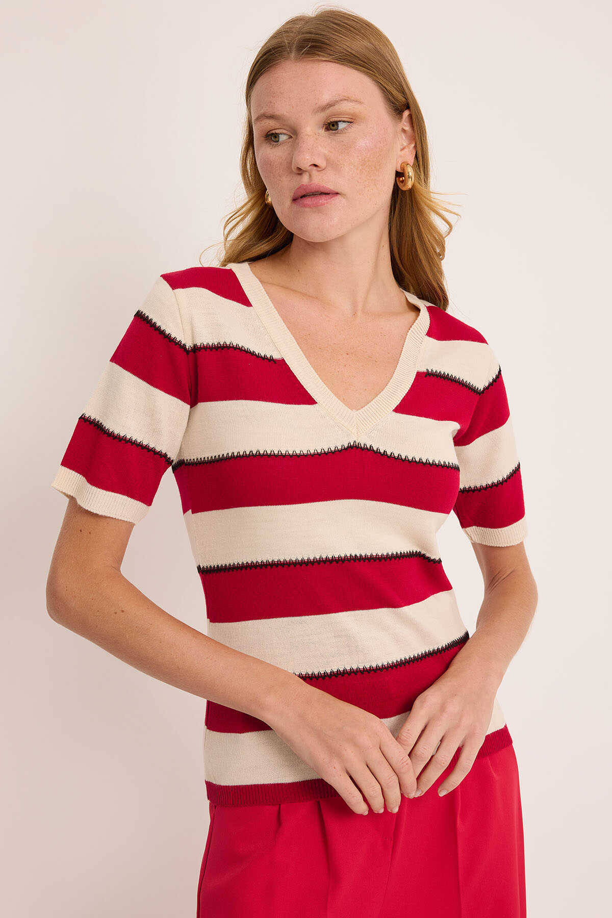 Kadın V Yaka Kırmızı Beyaz Çizgili Bluz 15869 - Kombin