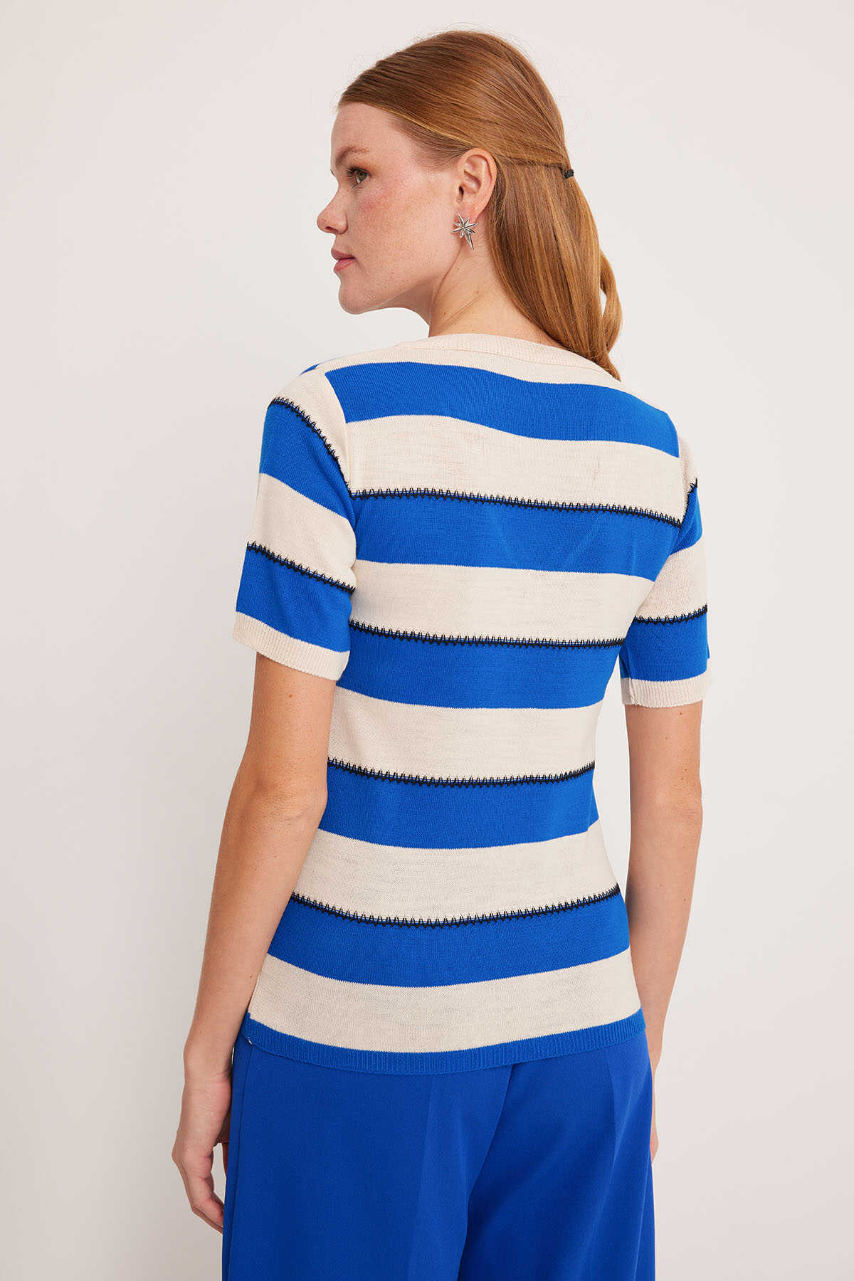 Kadın V Yaka Mavi Beyaz Çizgili Bluz 15869 - Kombin