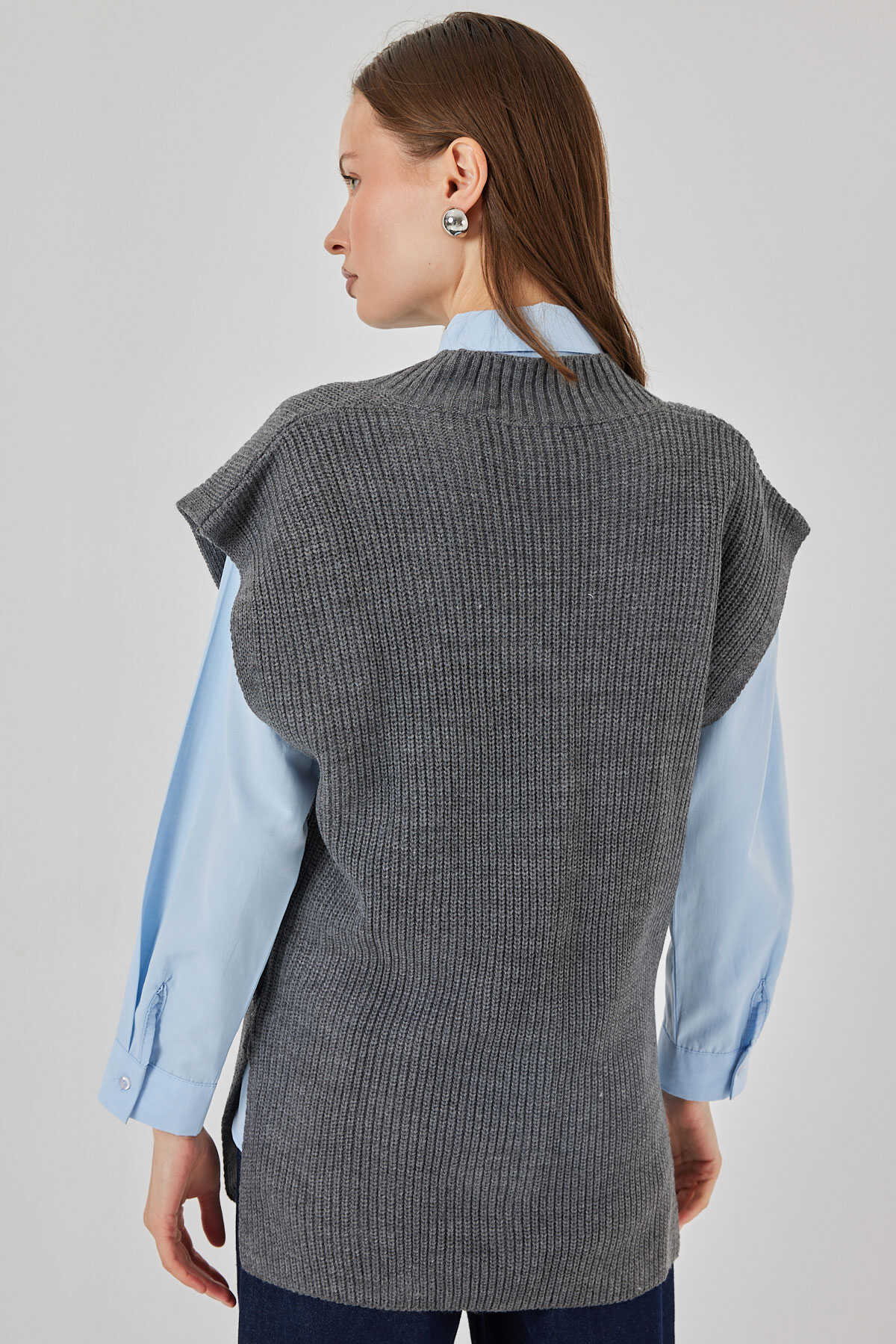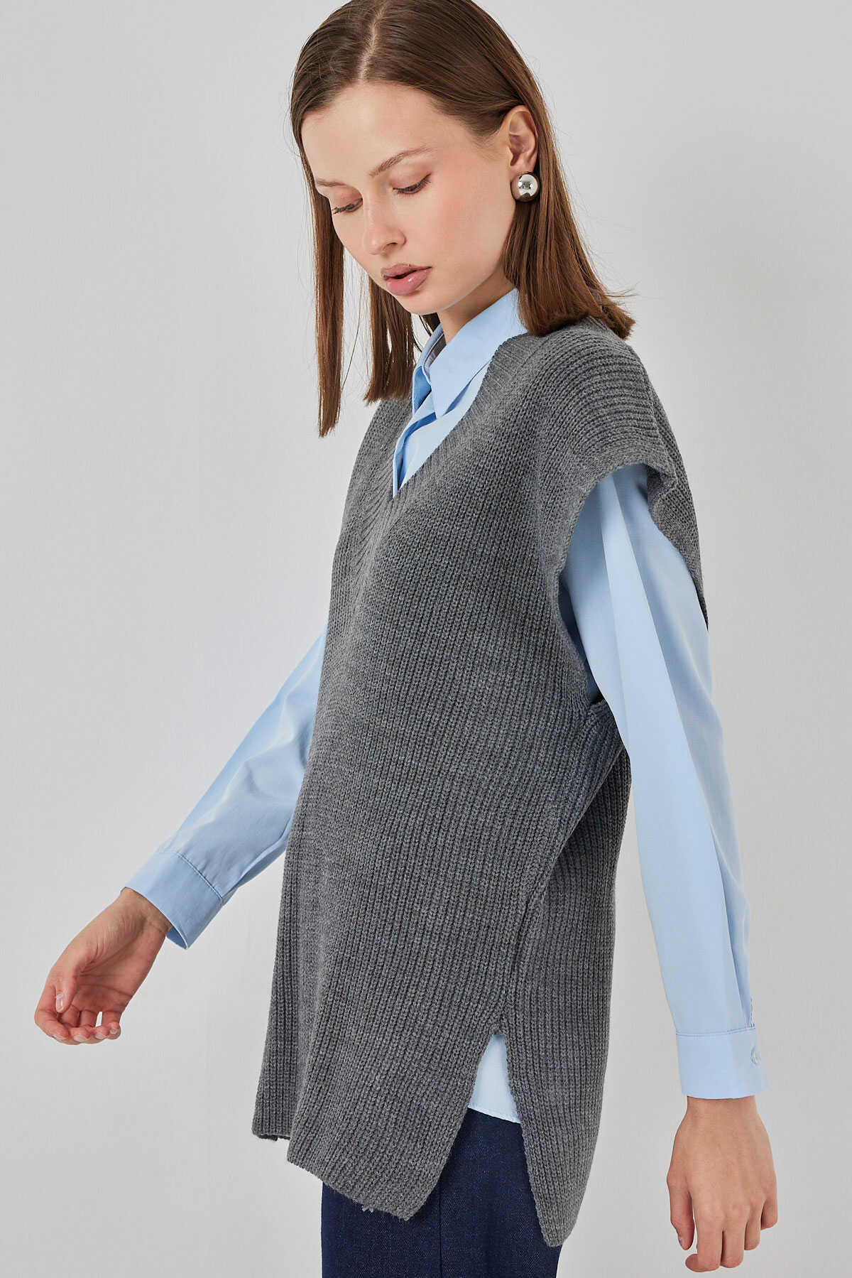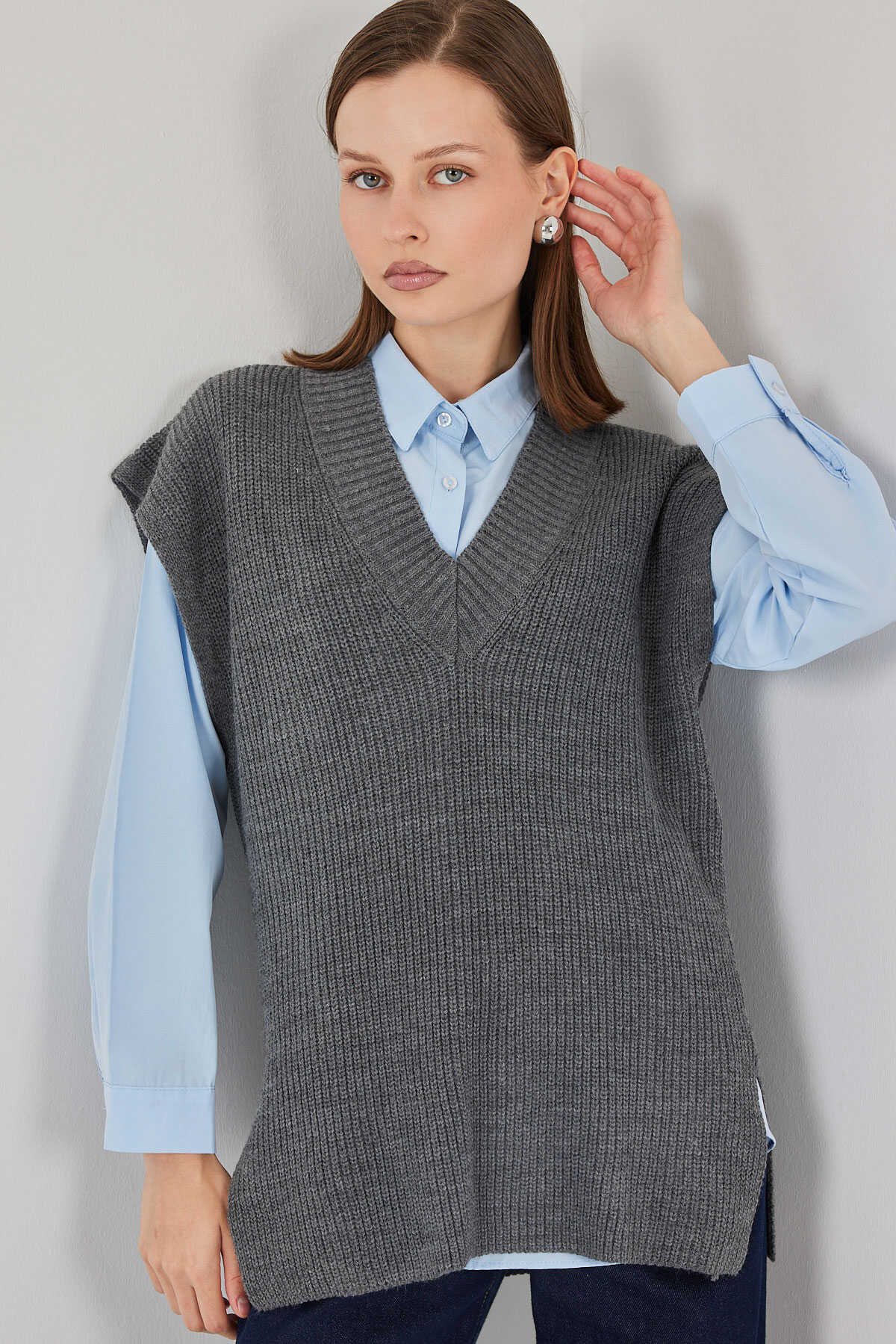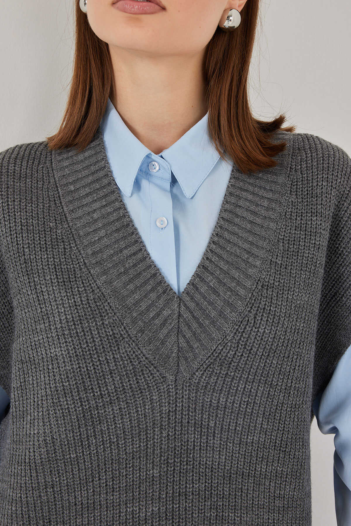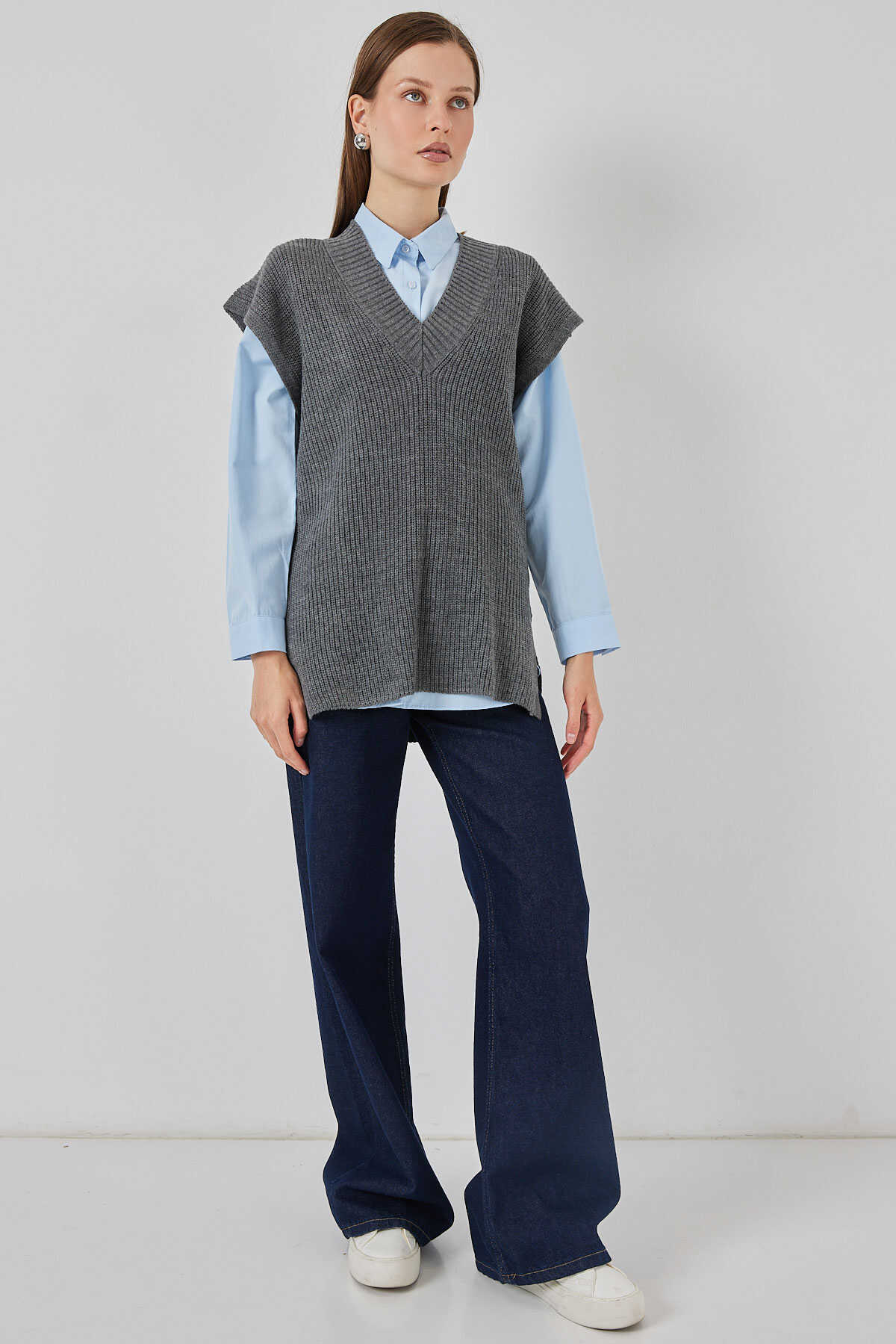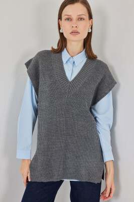 Kadın V Yaka Triko Süveter 15925 - Gri - Kombin