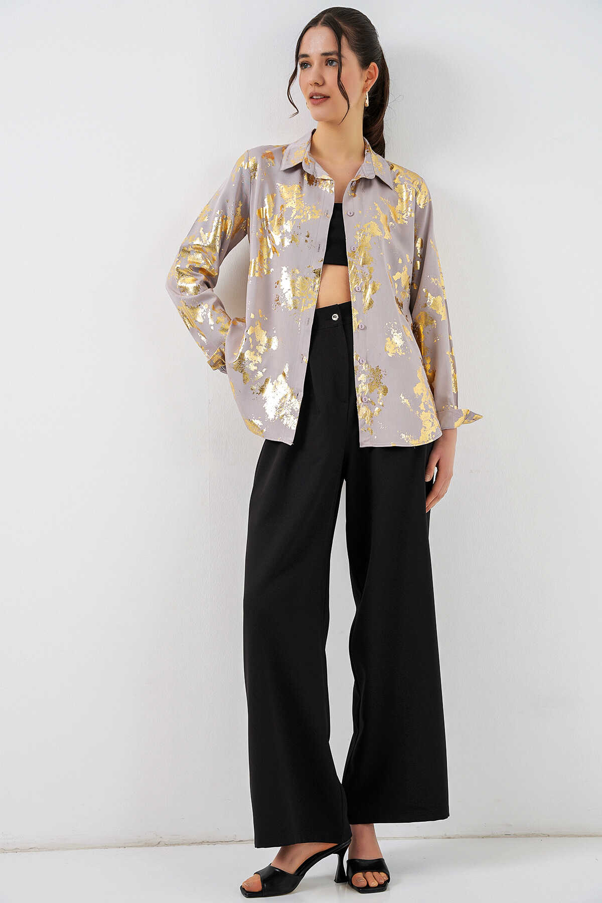 Kadın Varak Desenli Gömlek 20253 - Altın Sarısı - Kombin
