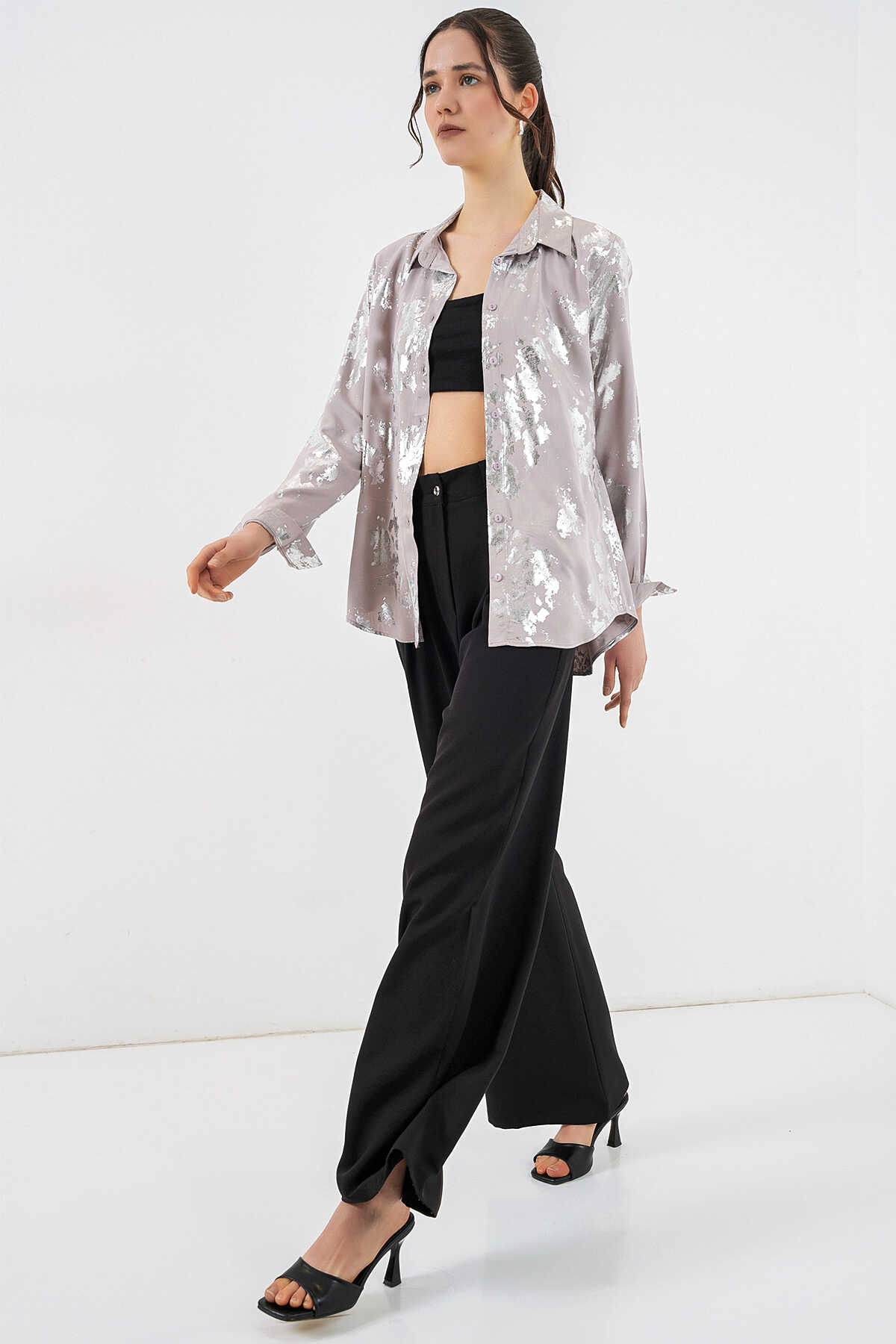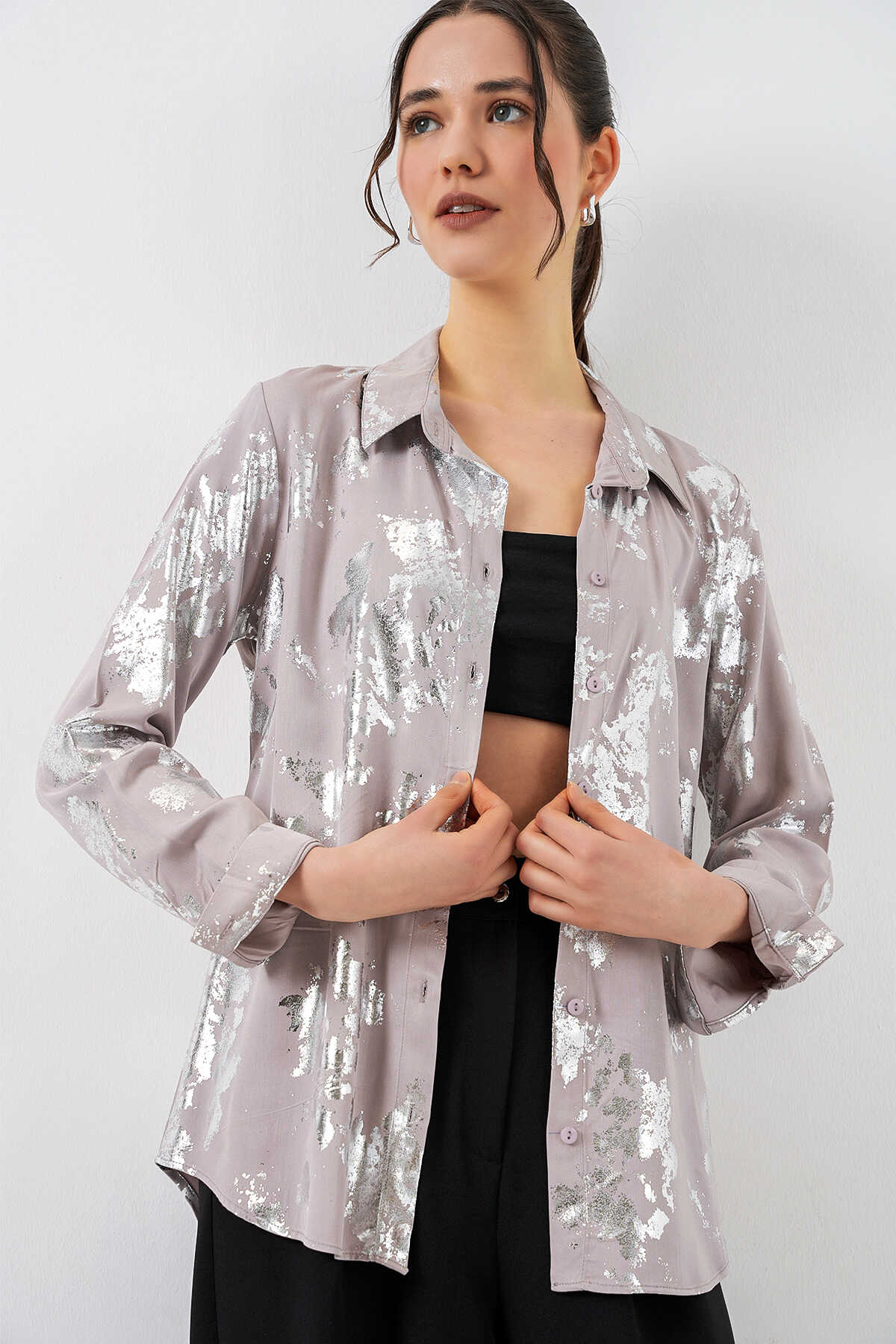 Kadın Varak Desenli Gömlek 20253 - Gümüş - Kombin