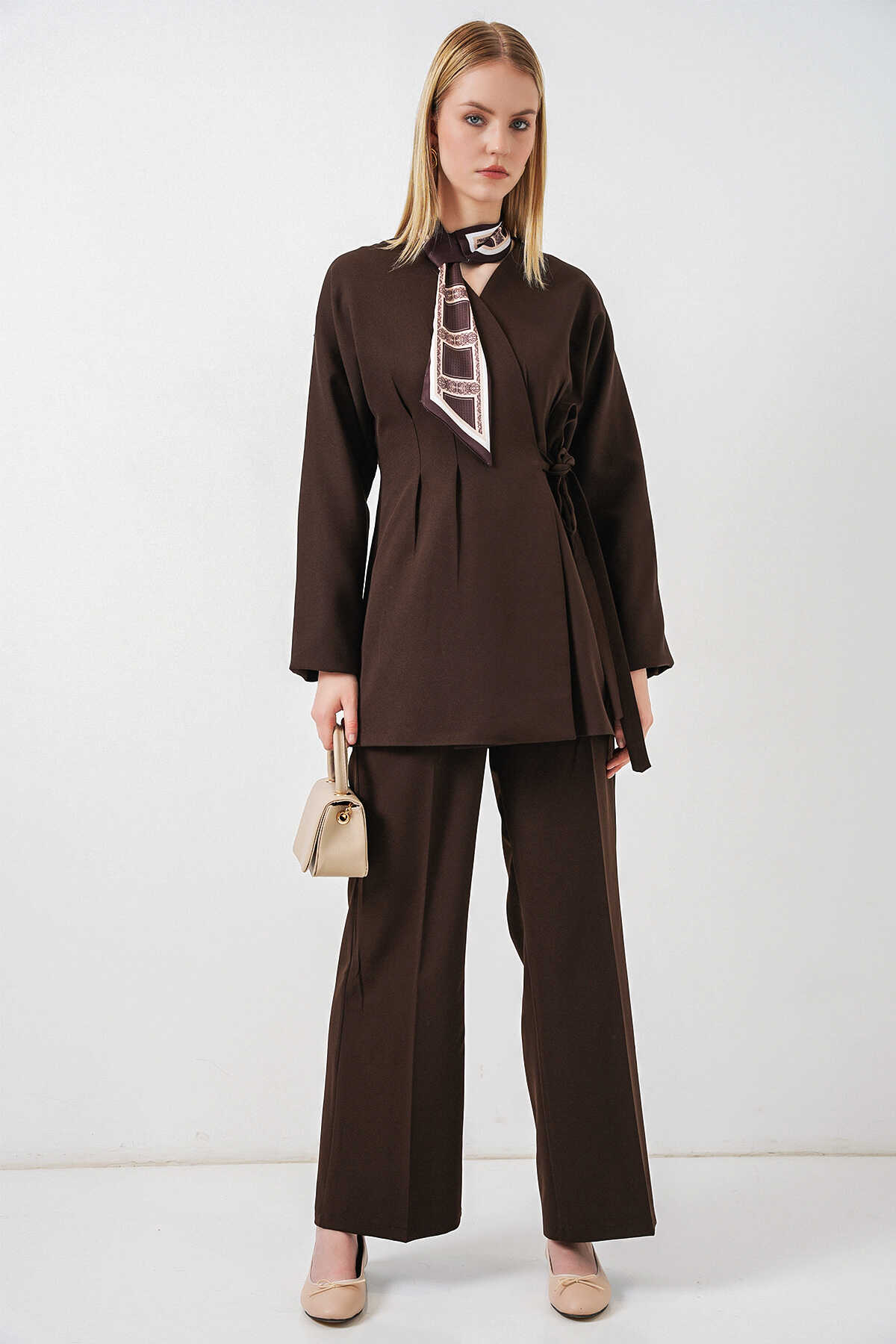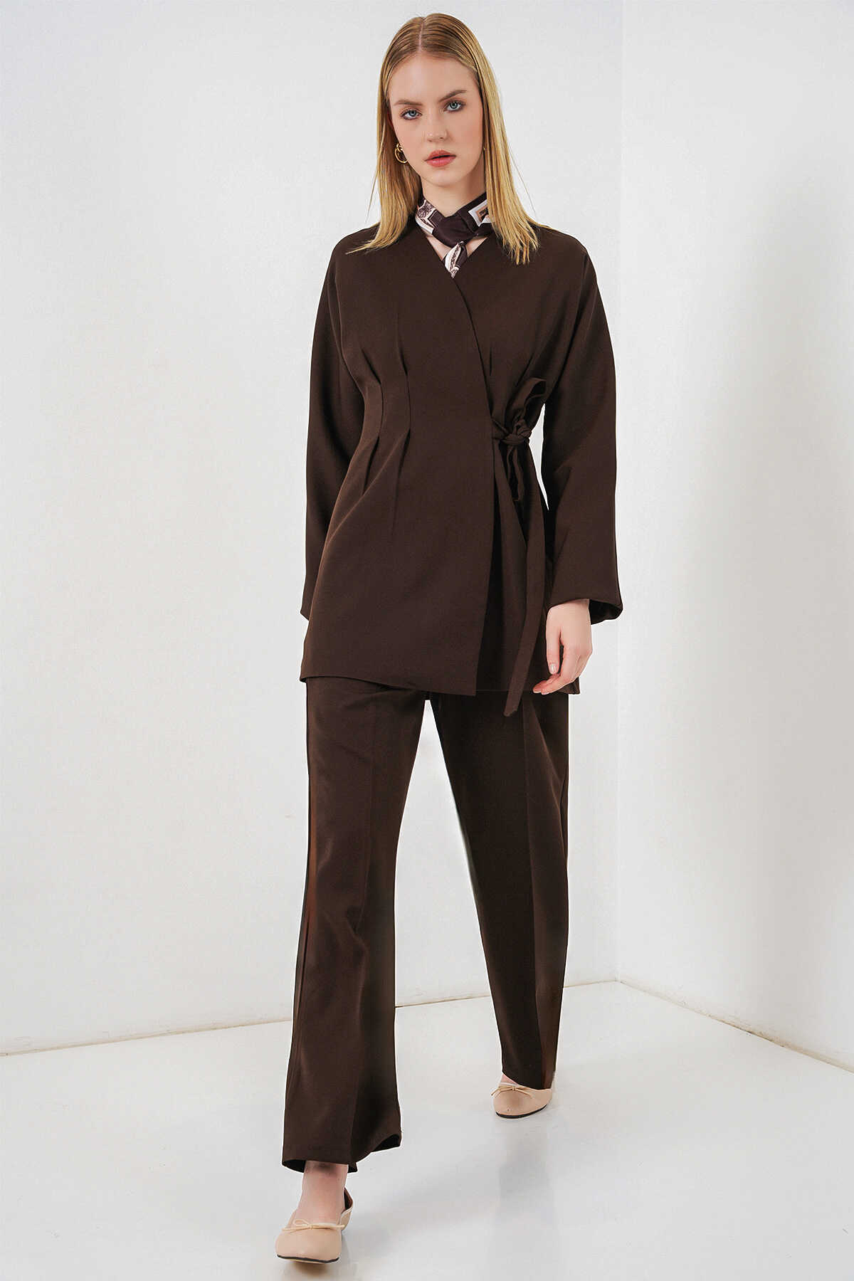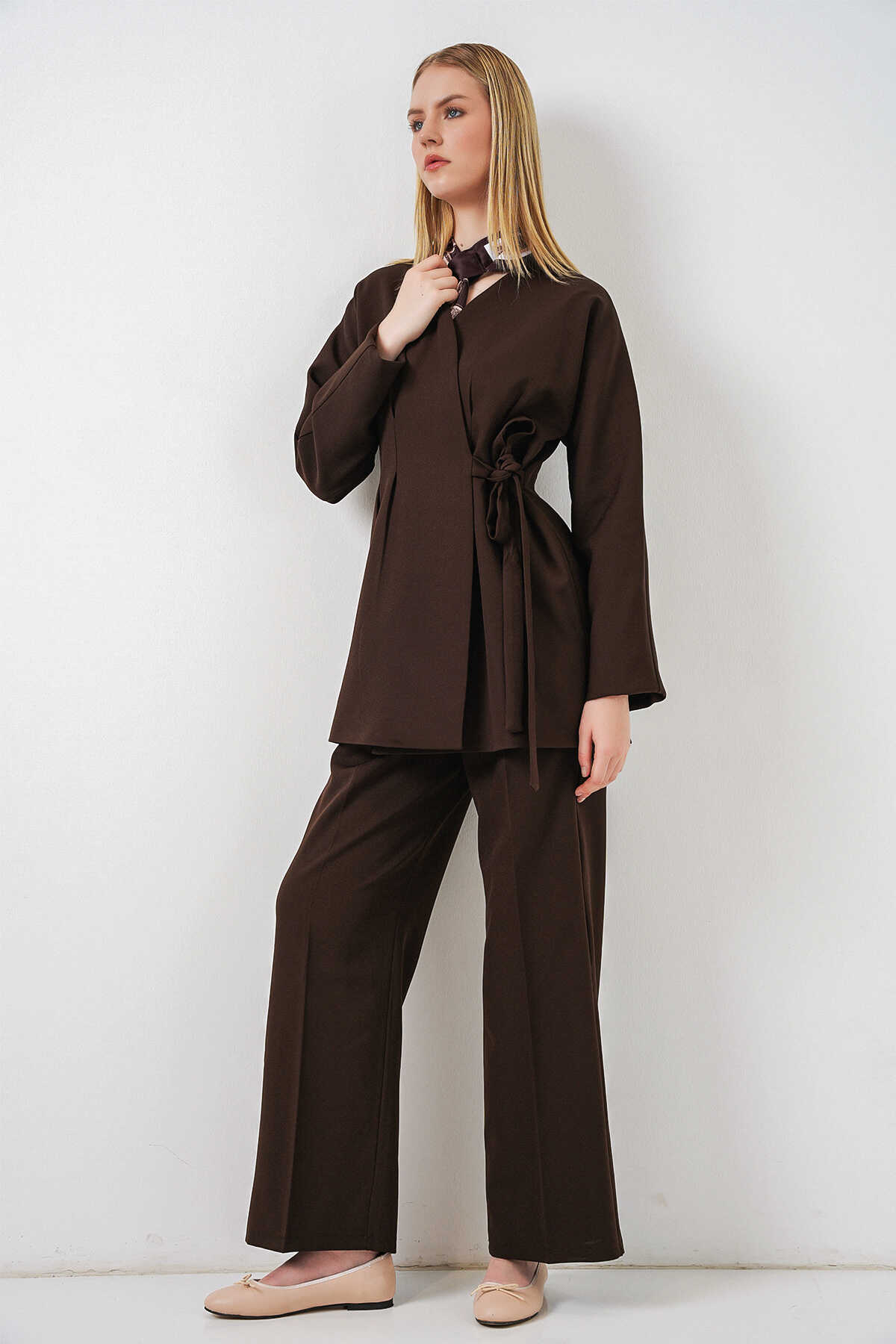 Kadın Yandan Bağlamalı Ceket Pantolon İkili Takım 30099 - Kahverengi - Kombin