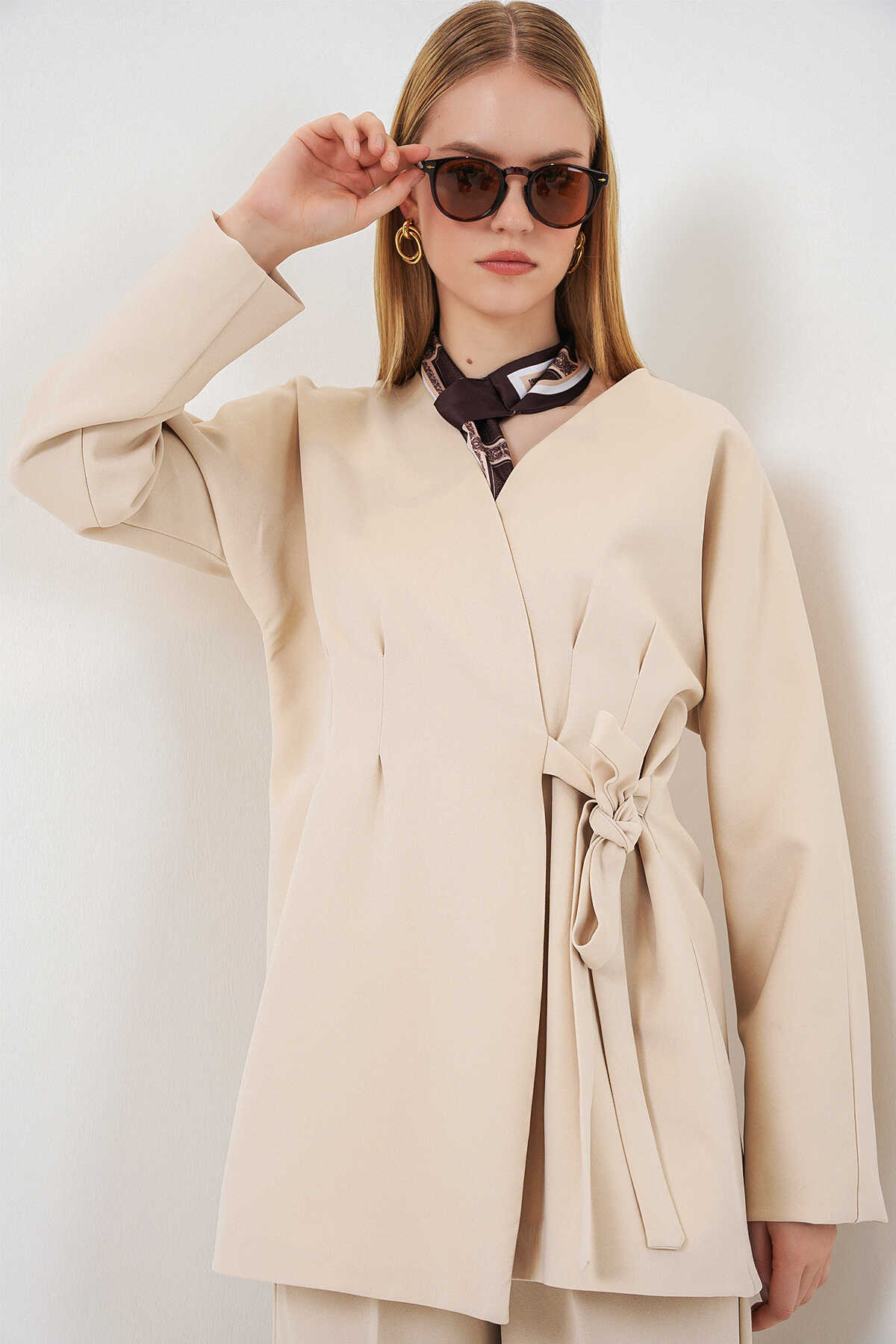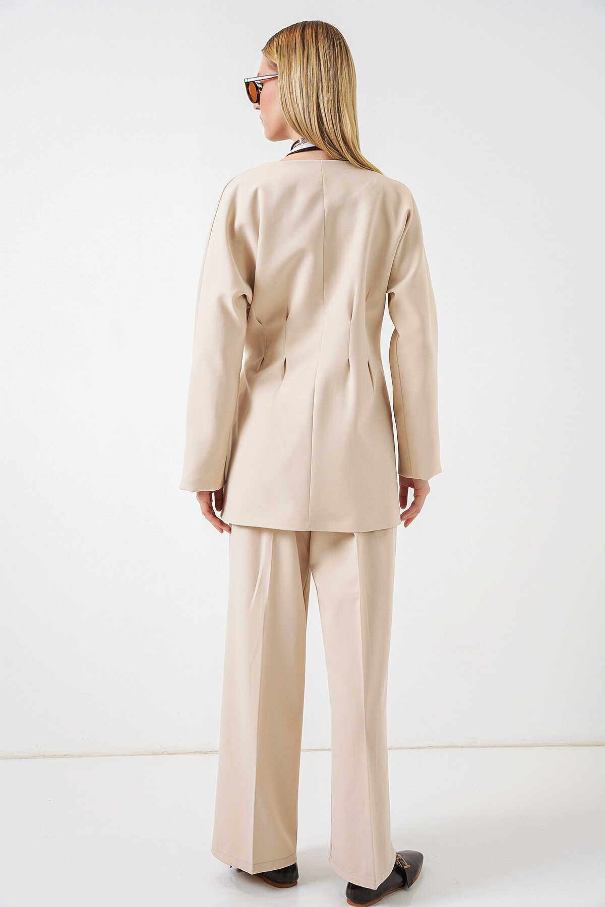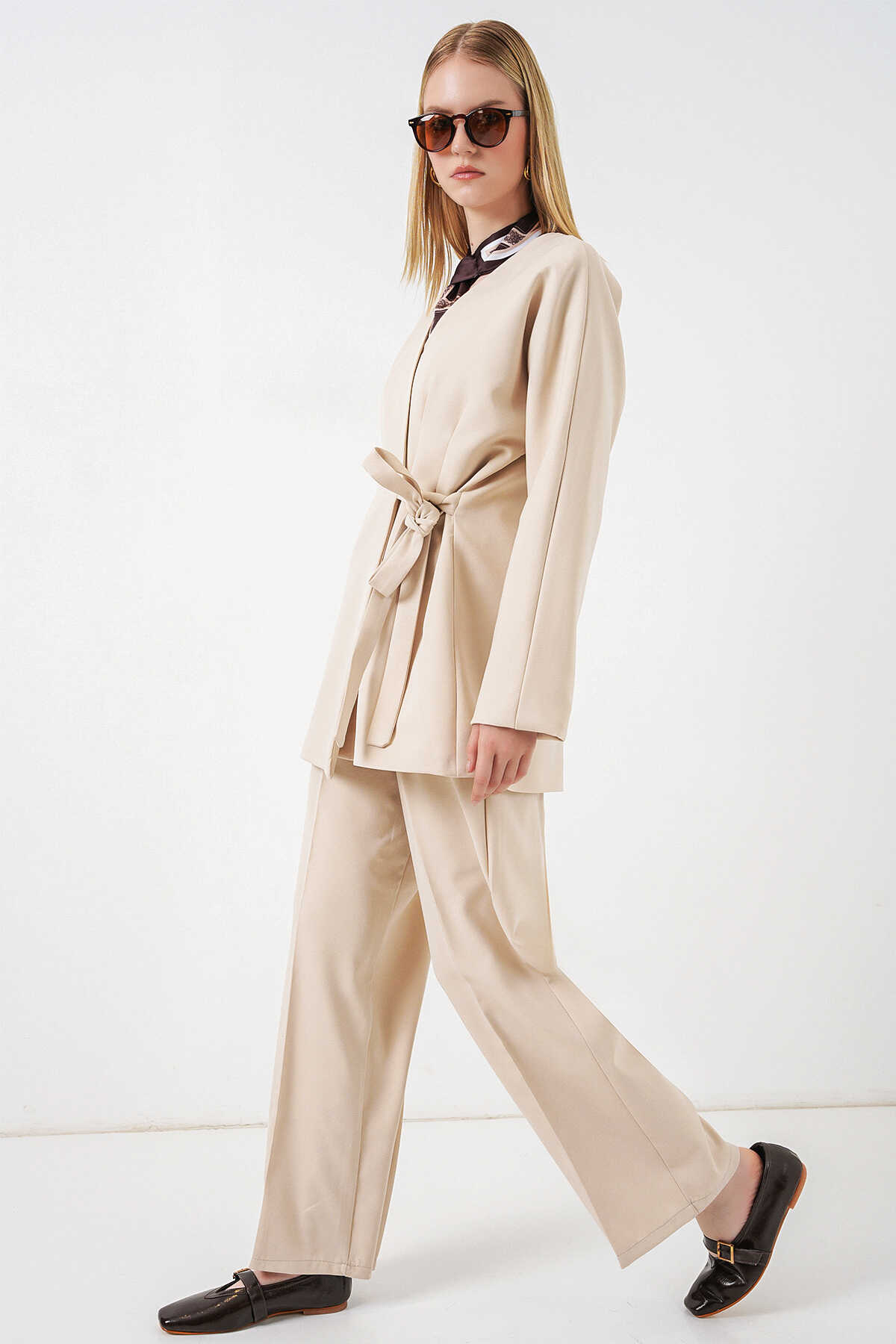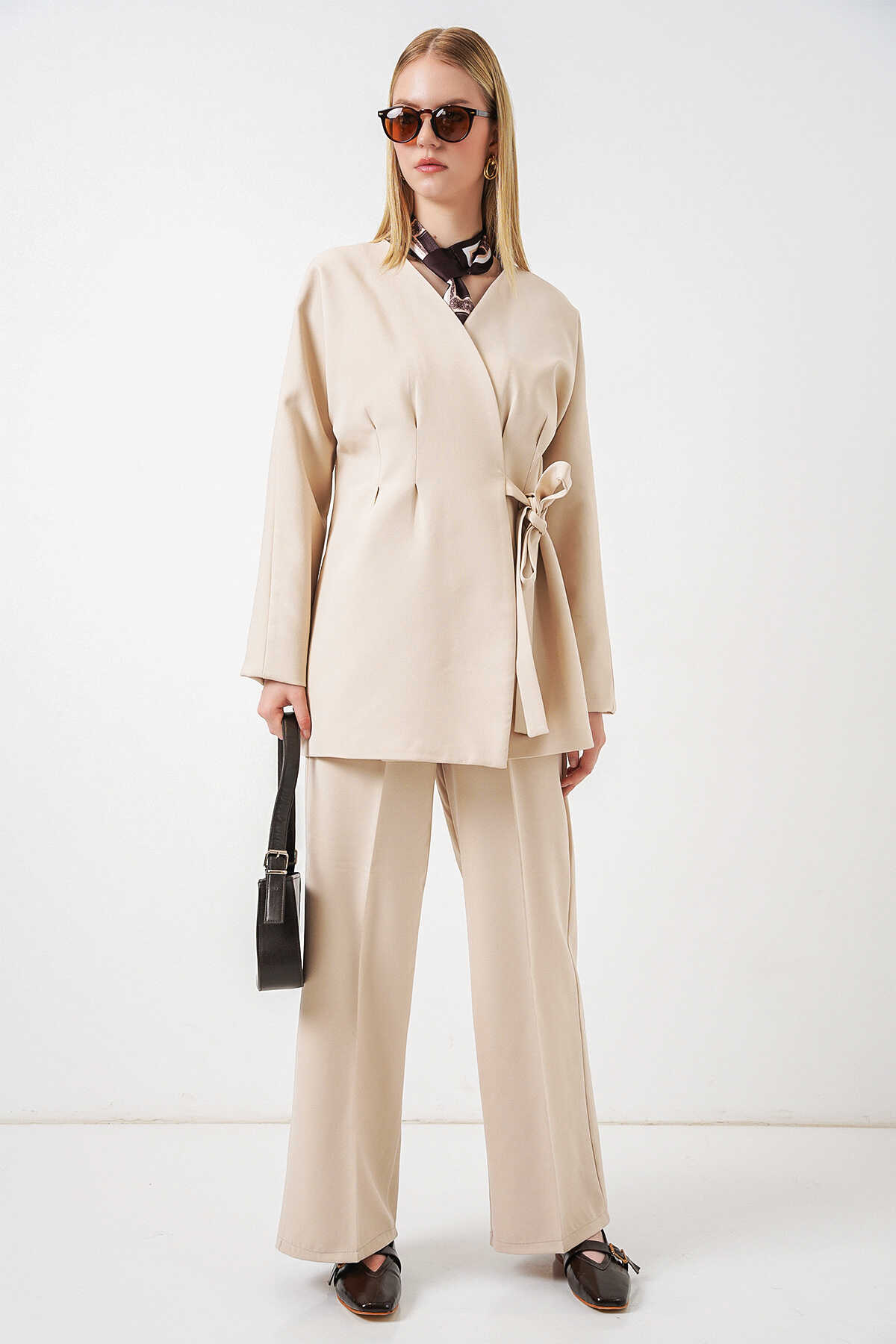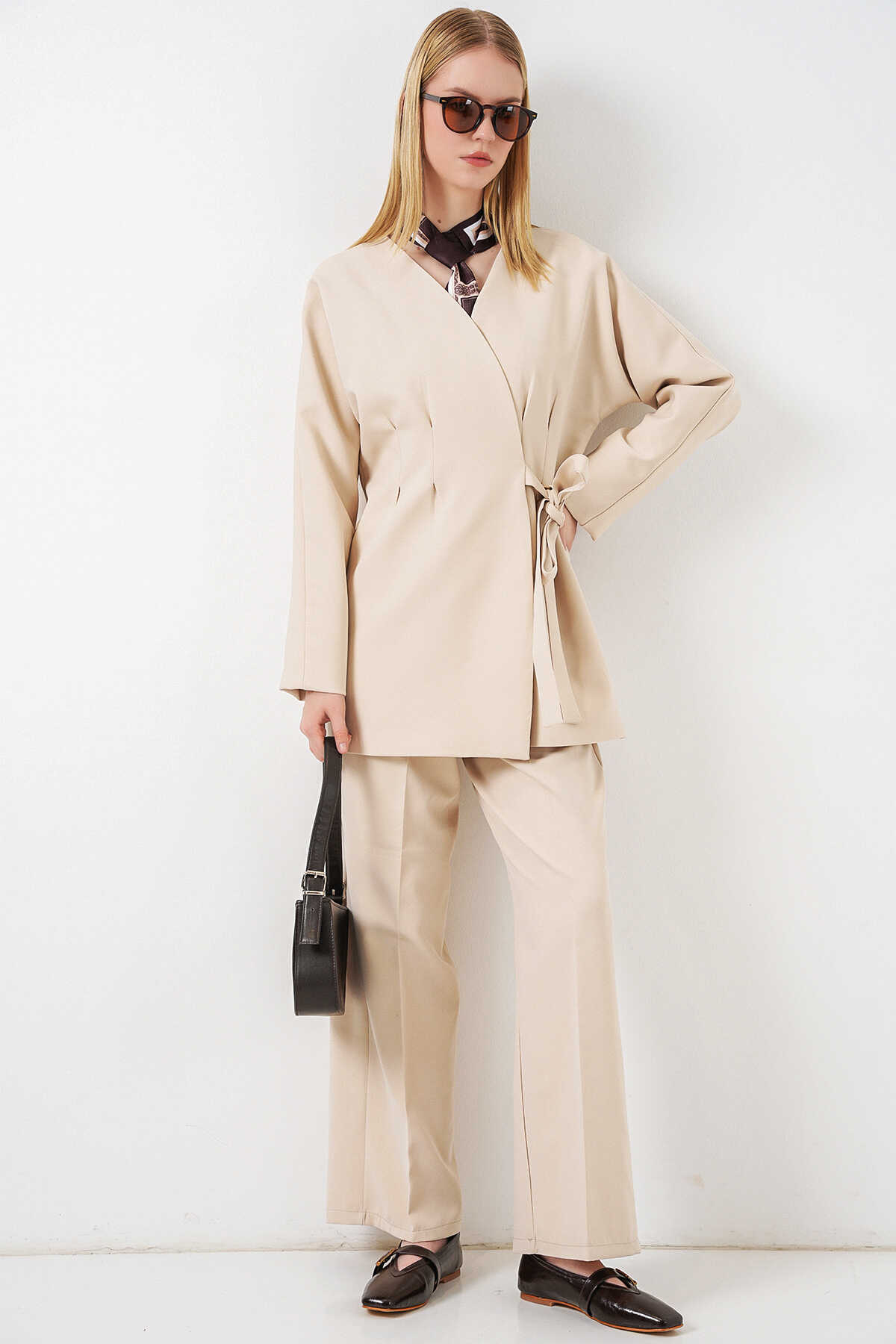 Kadın Yandan Bağlamalı Ceket Pantolon İkili Takım 30099 - Krem - Kombin