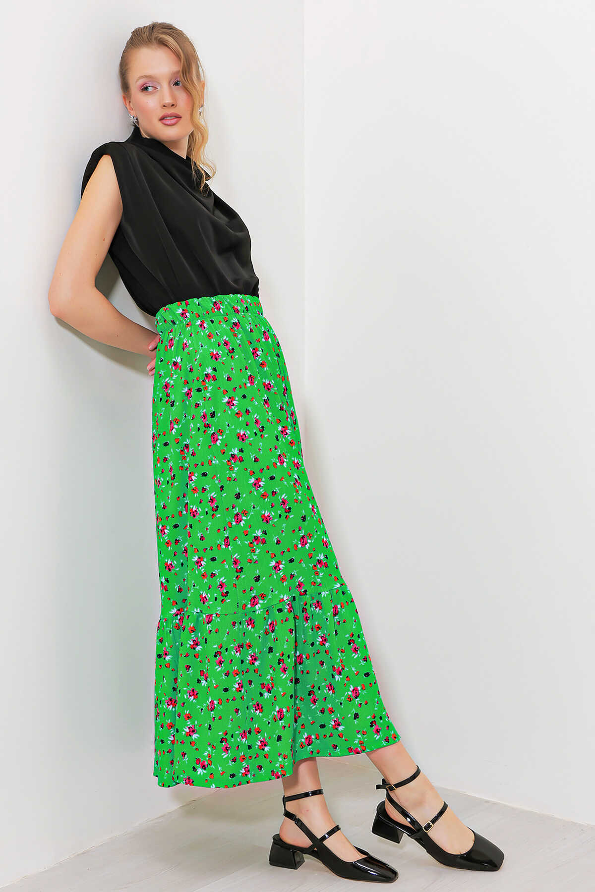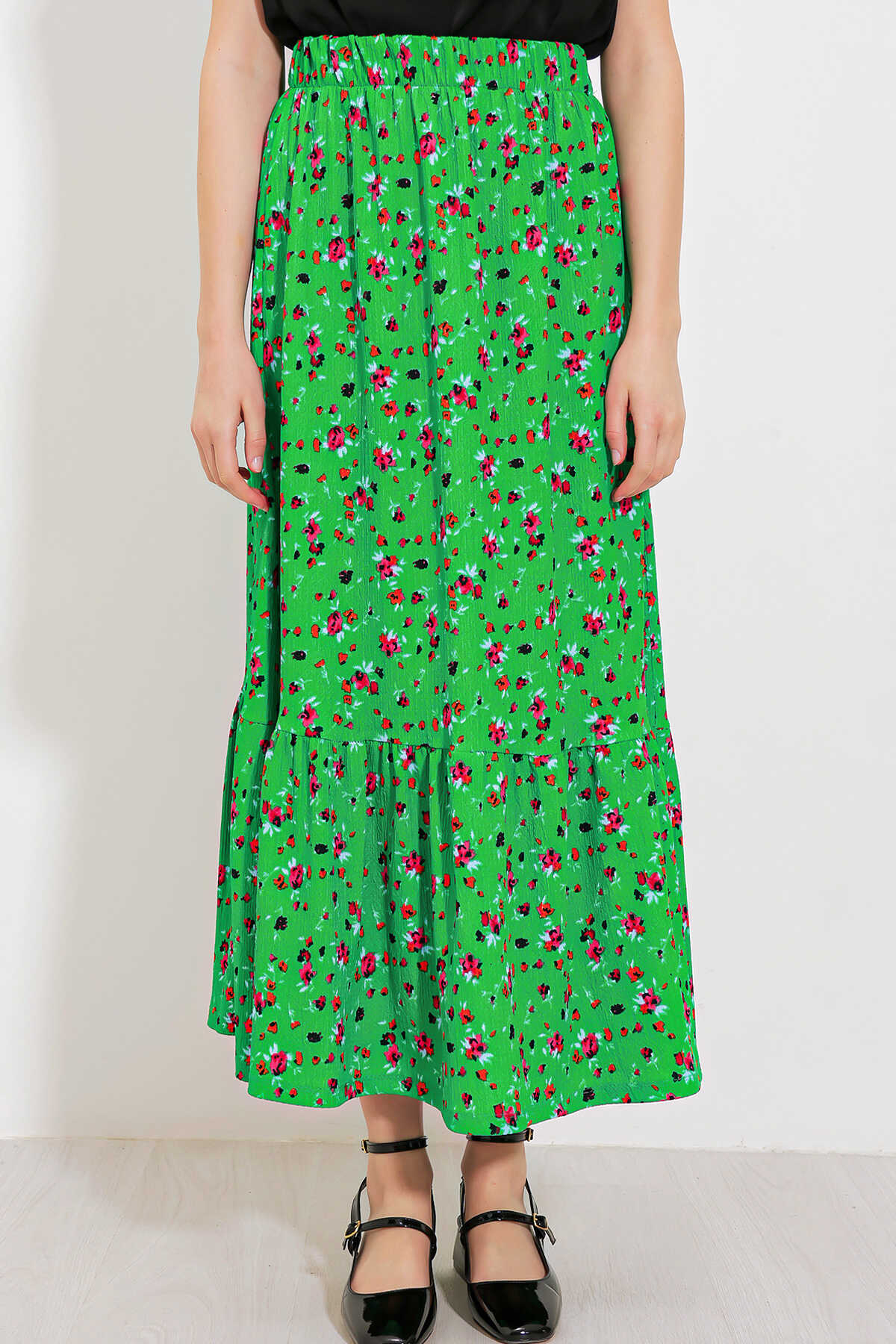 Kadın Yeşil Çiçek Desenli Uzun Örme Etek 1886 - Kombin