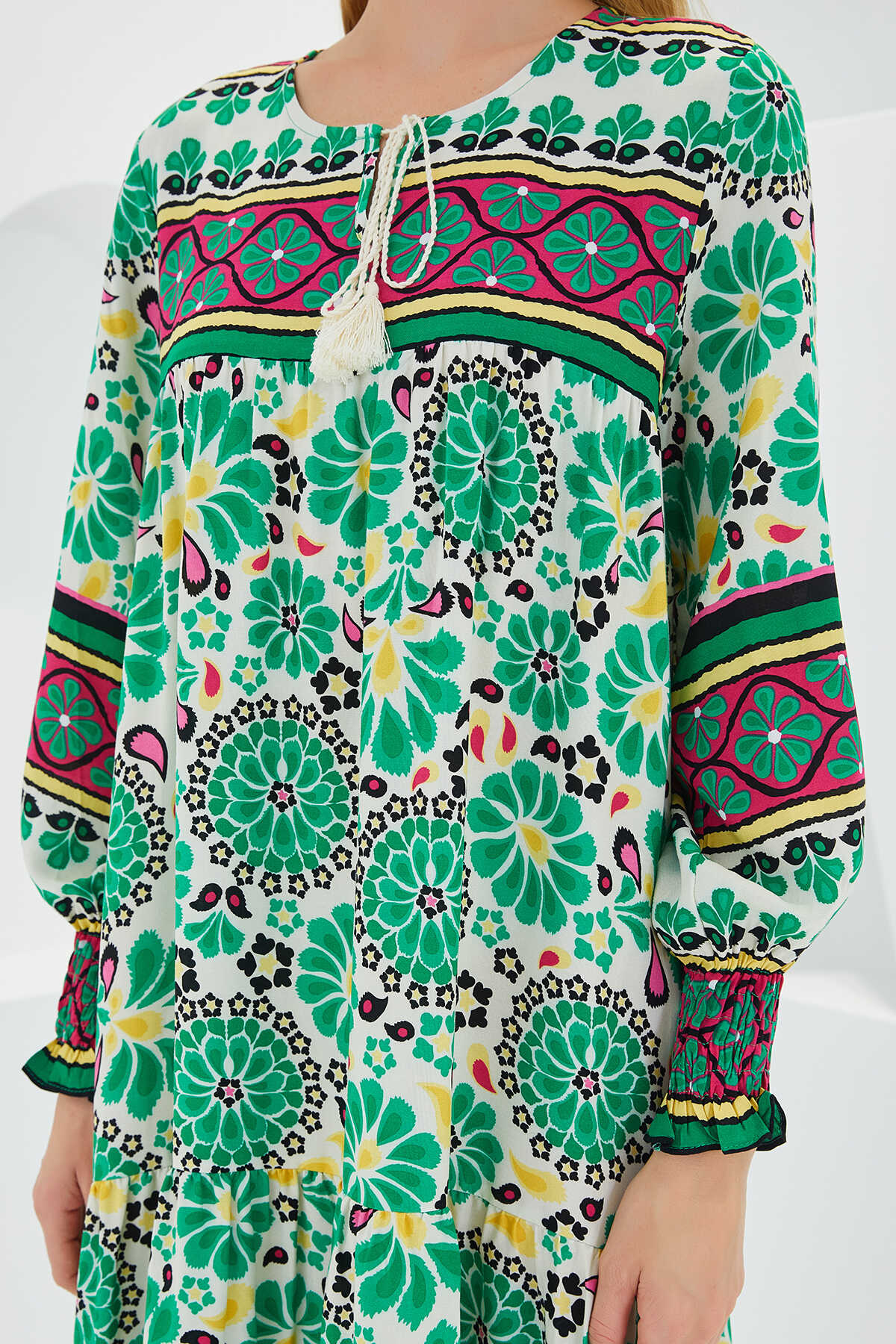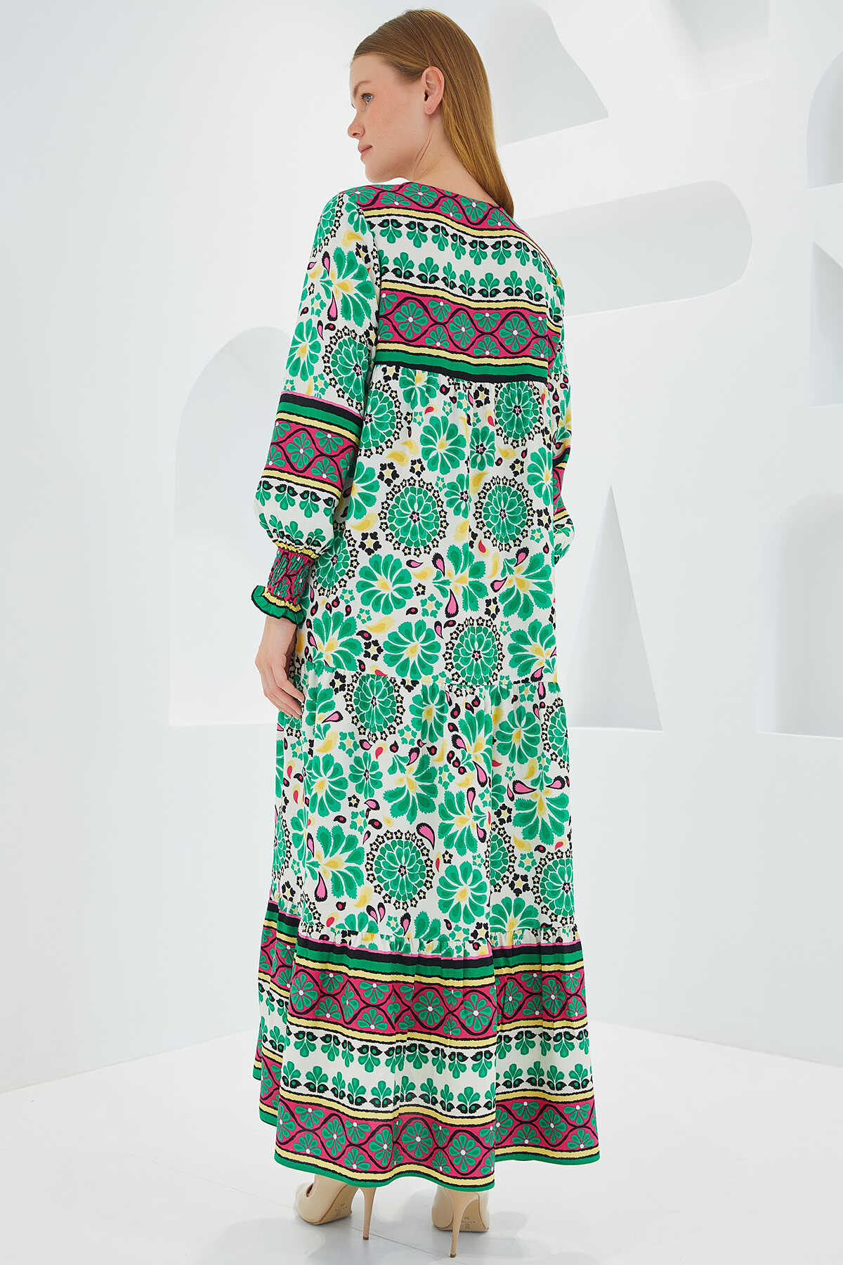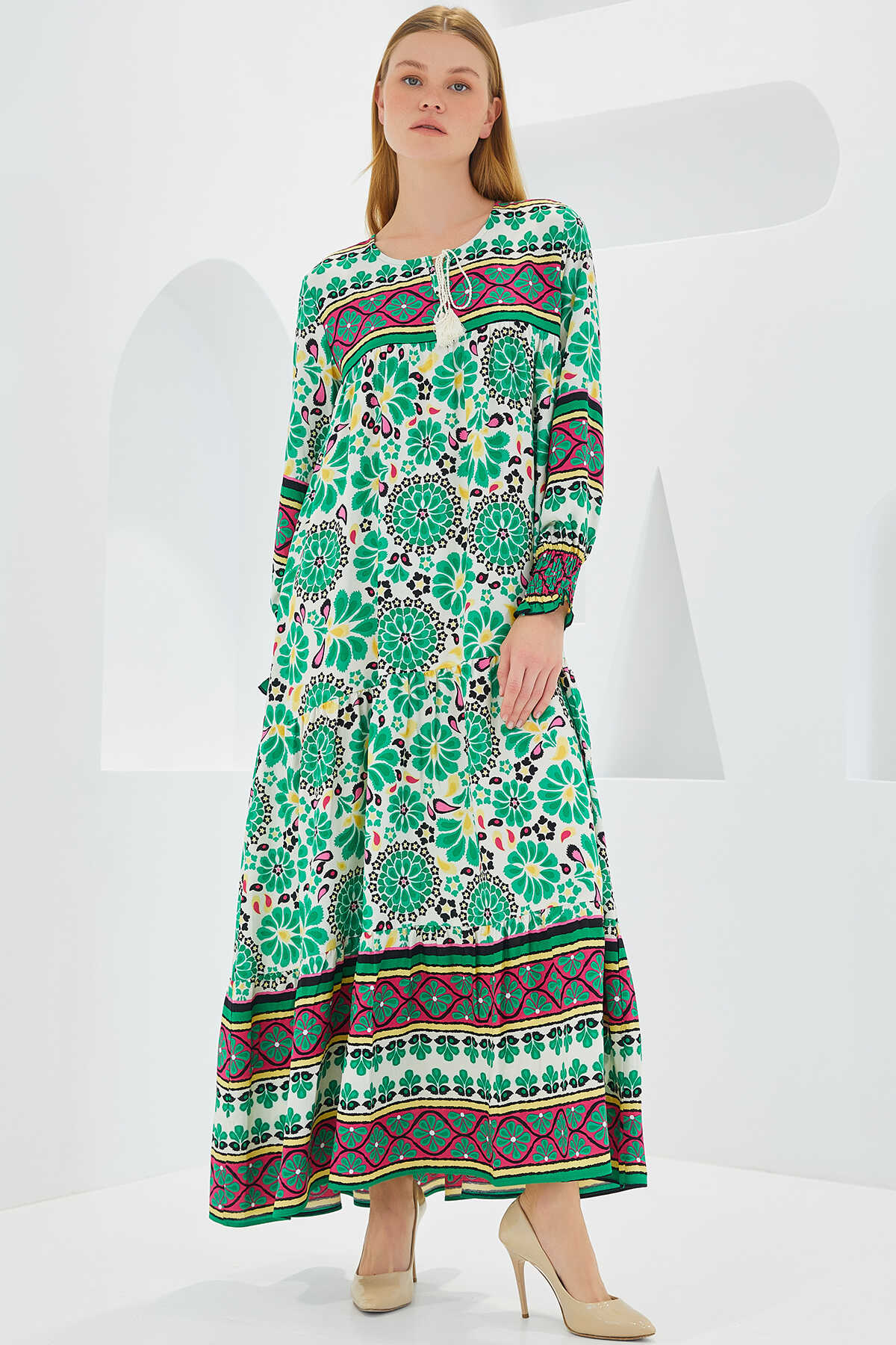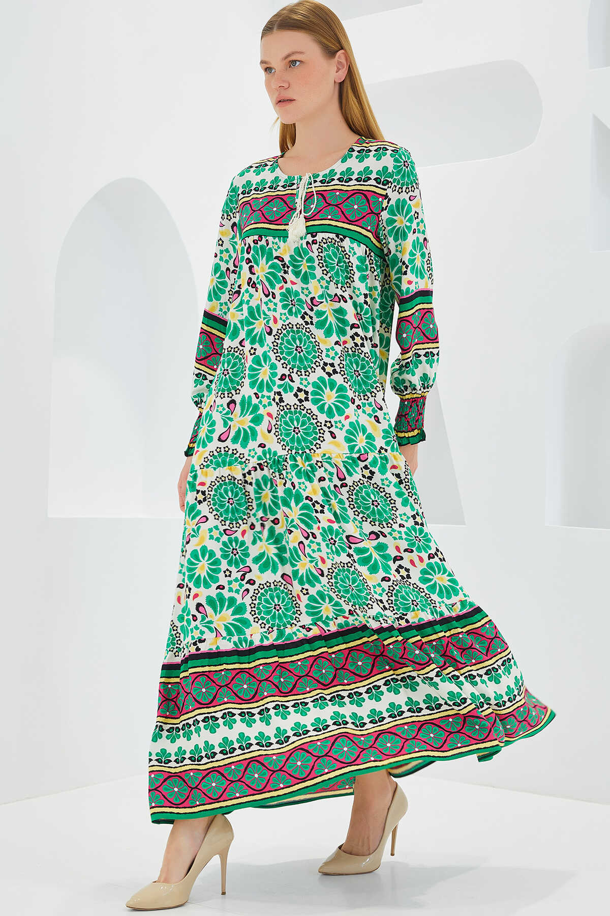 Kadın Yeşil Kırmızı Desenli Uzun Viskon Elbise 1947