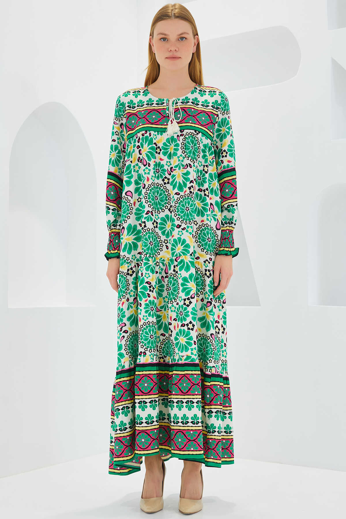 Kadın Yeşil Kırmızı Desenli Uzun Viskon Elbise 1947 - Kombin