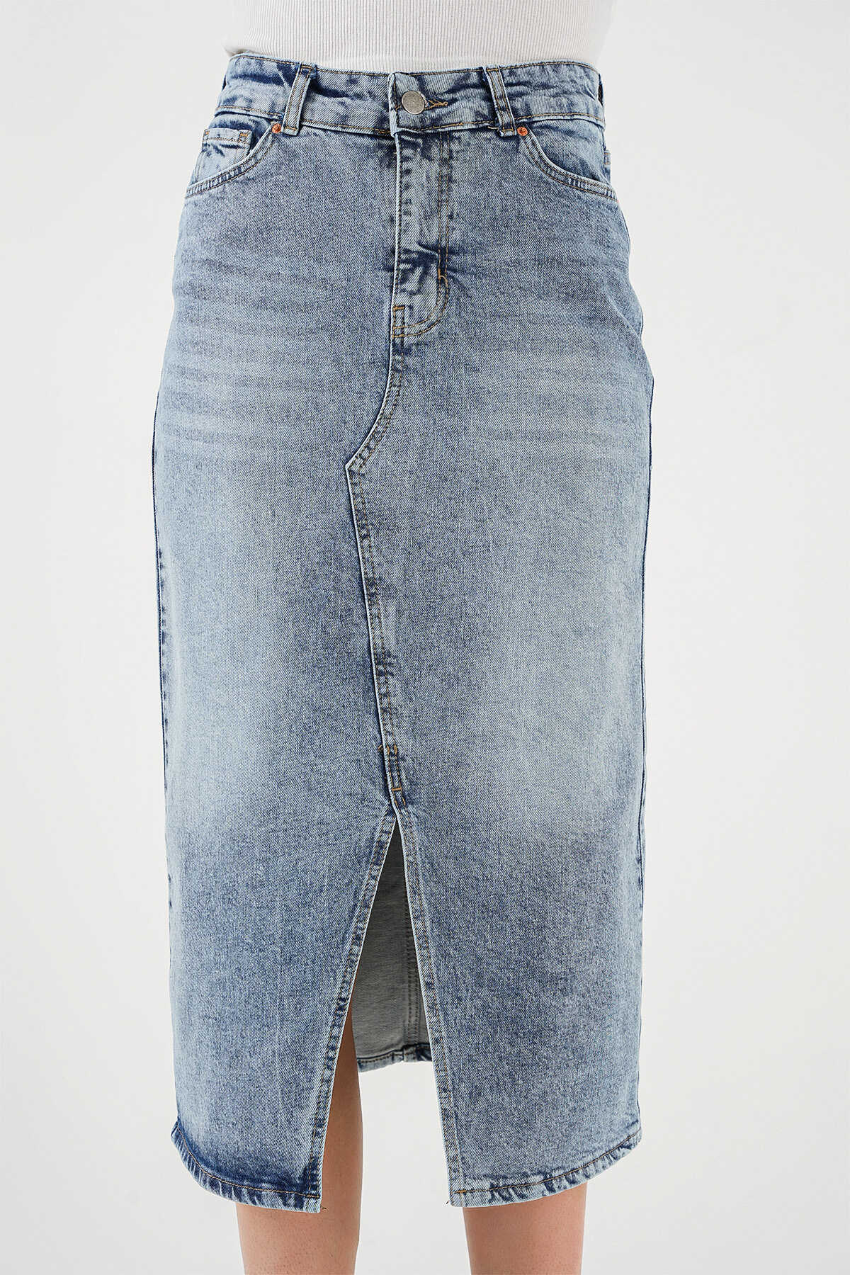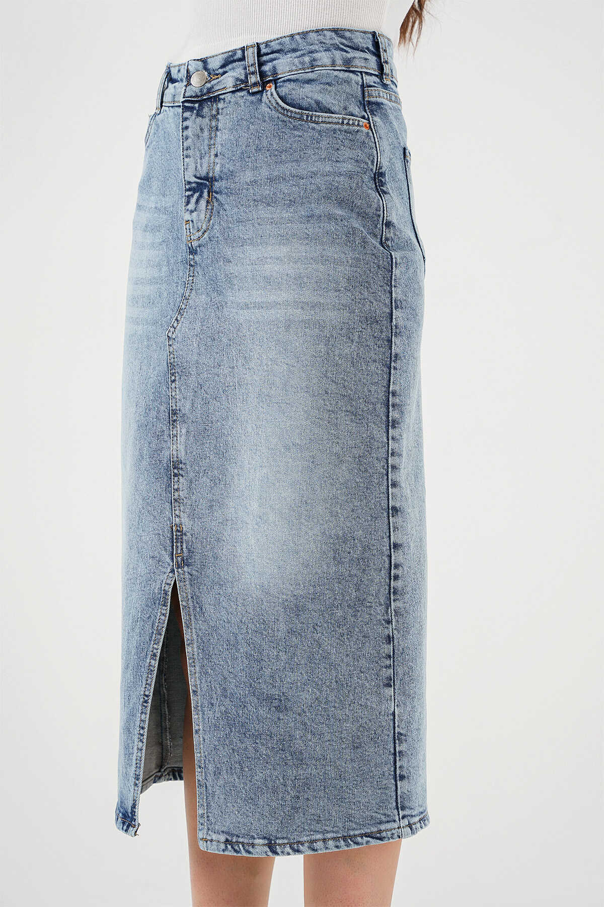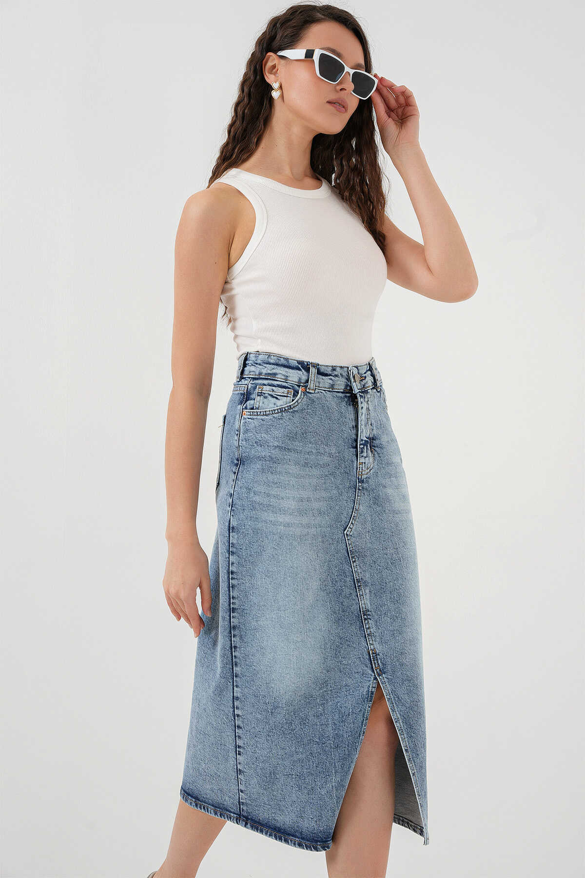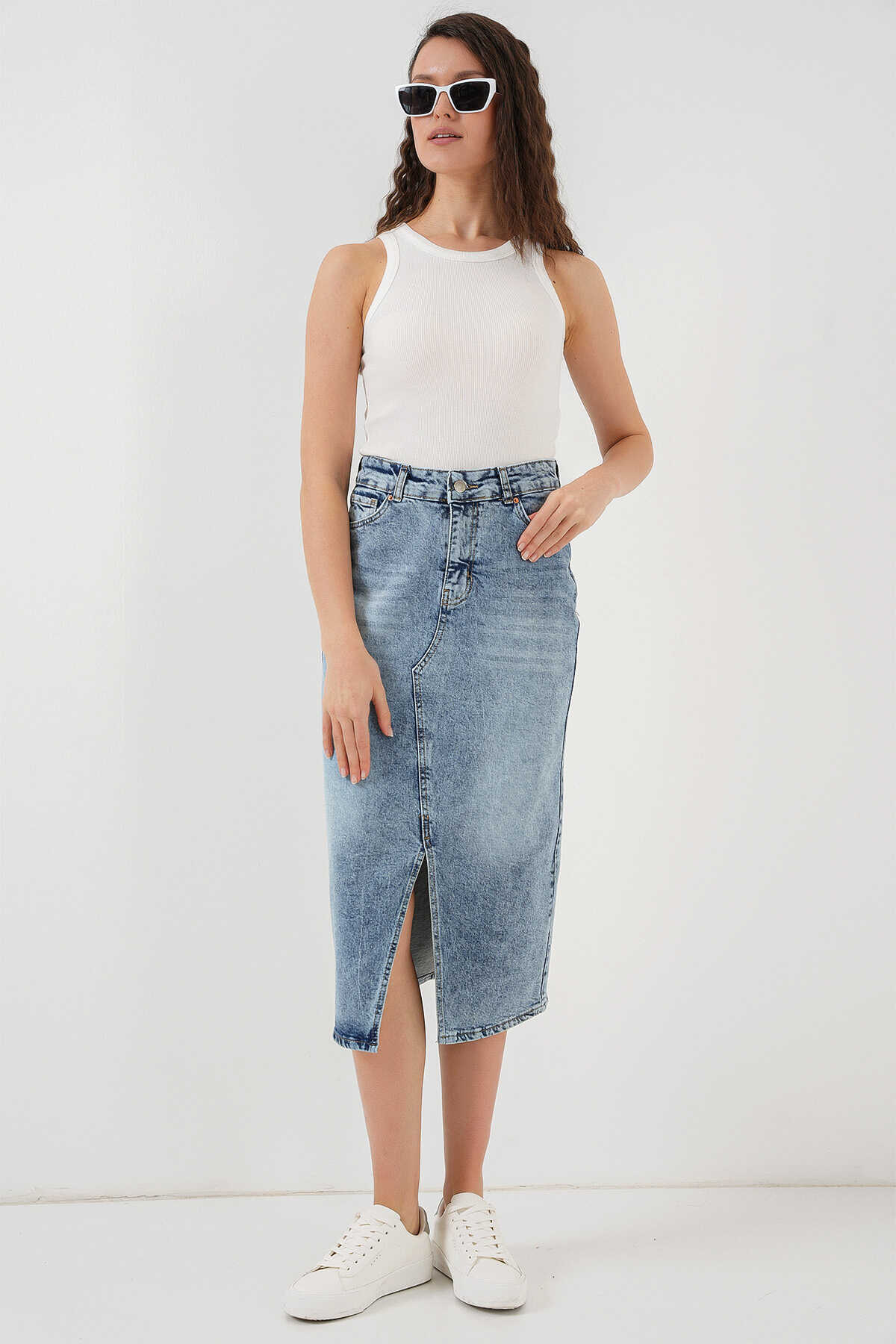 Kadın Yırtmaçlı Midi Kot Etek 8038 - Mavi - Kombin
