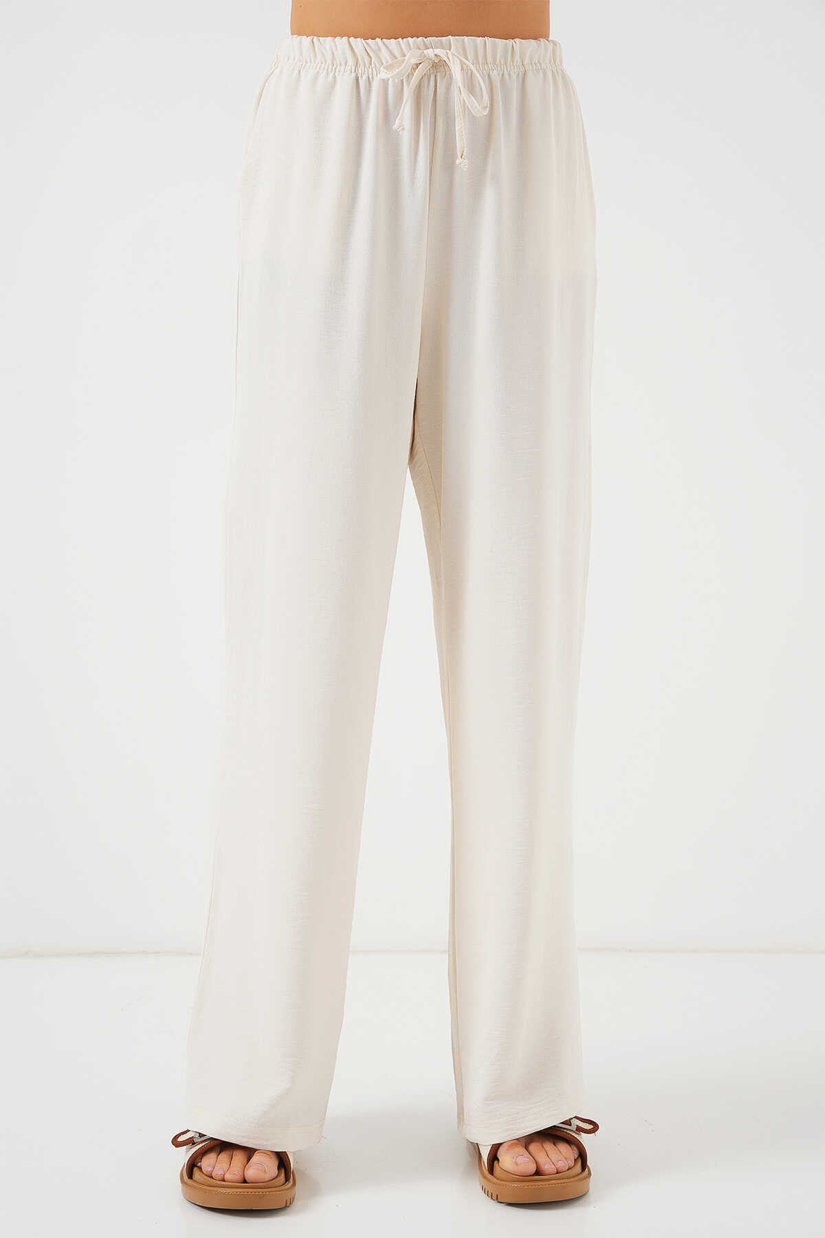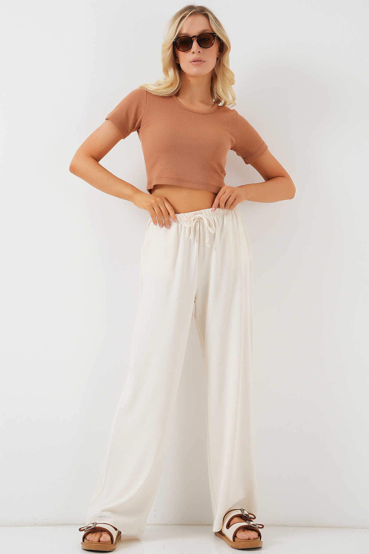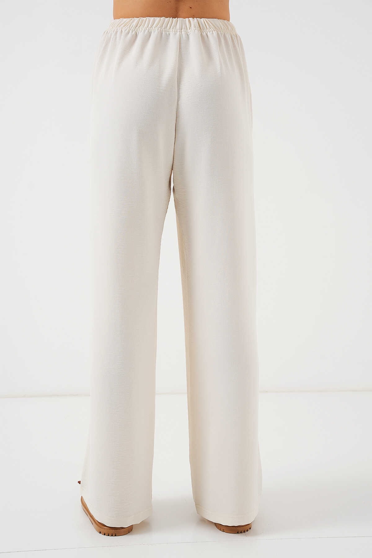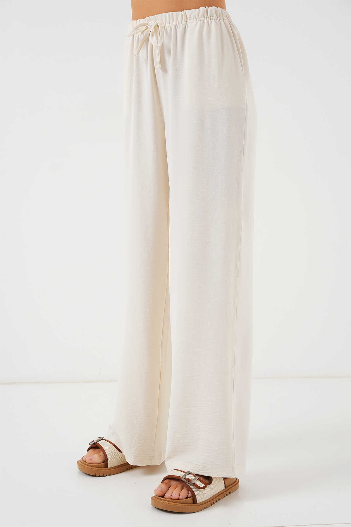 Kadın Yüksek Bel Bol Paça Pantolon - Krem - Kombin