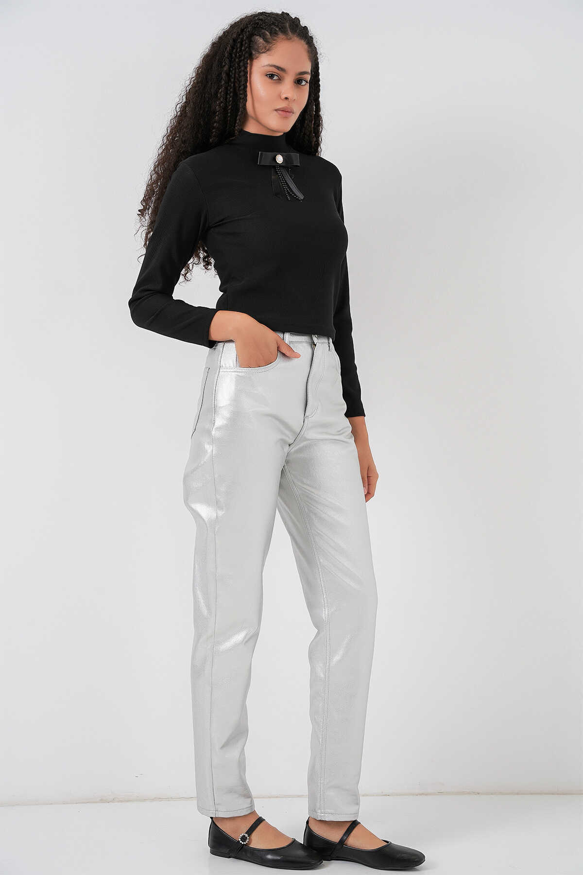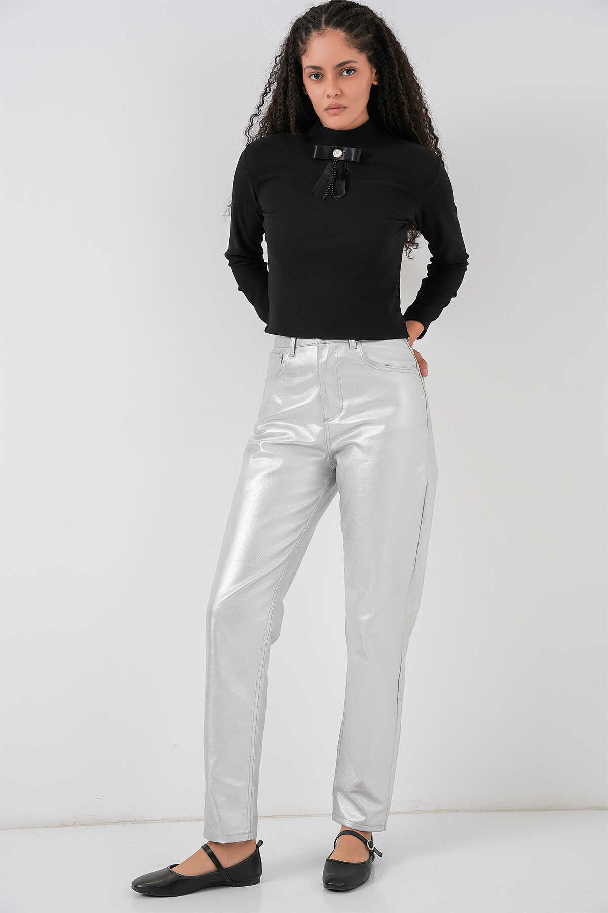 Kadın Yüksek Bel Parlak Pantolon 6738 - Gümüş - Kombin