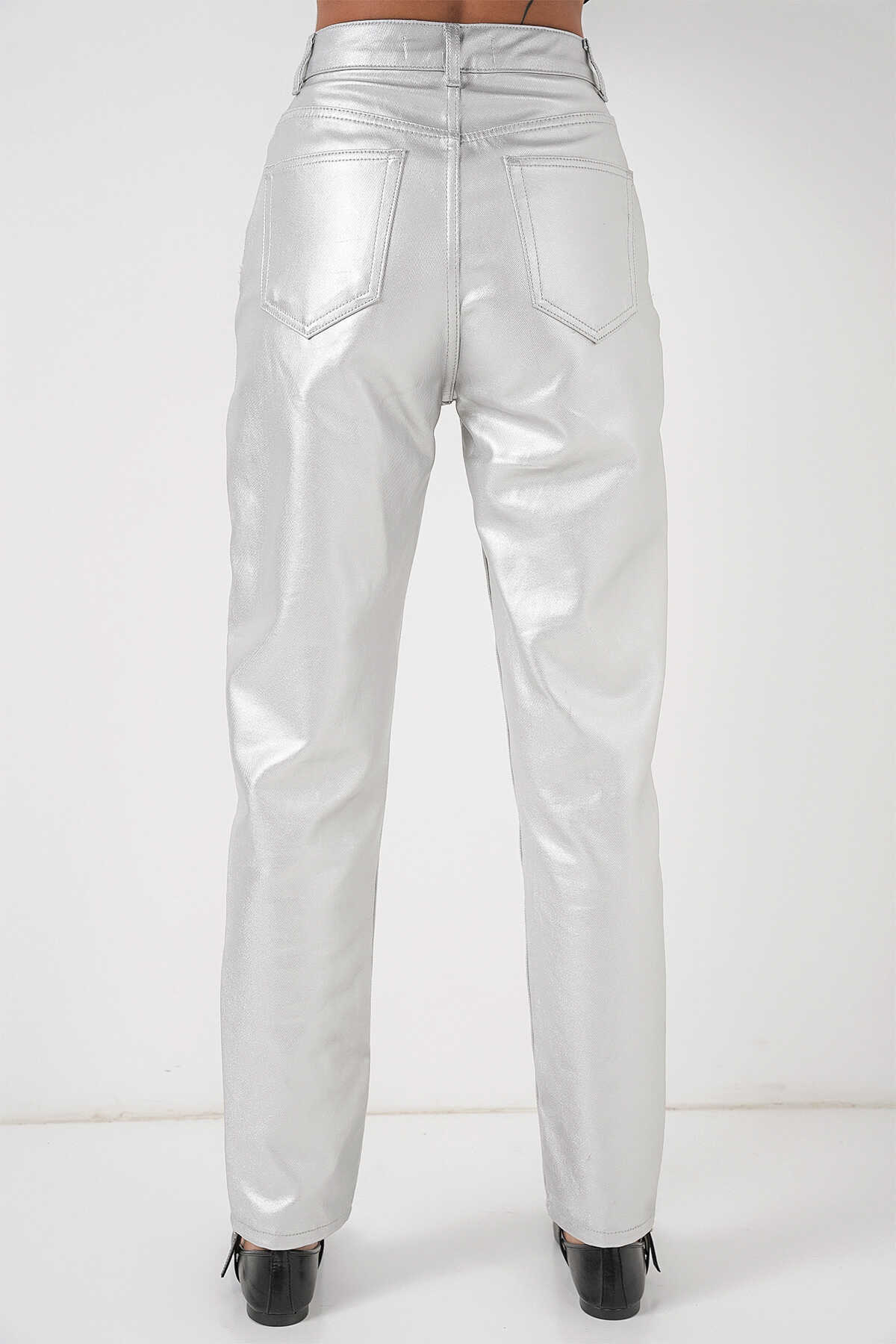 Kadın Yüksek Bel Parlak Pantolon 6738 - Gümüş