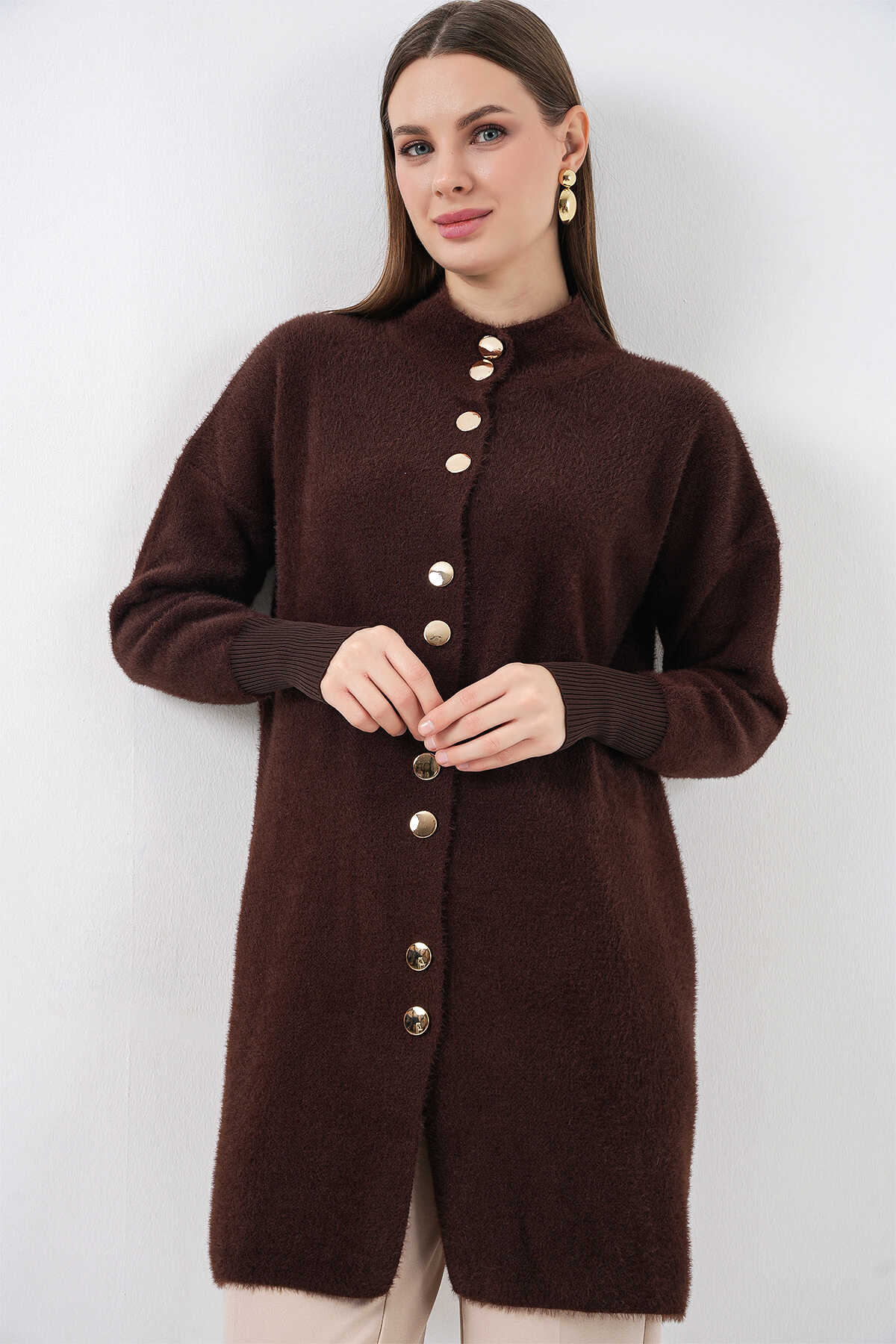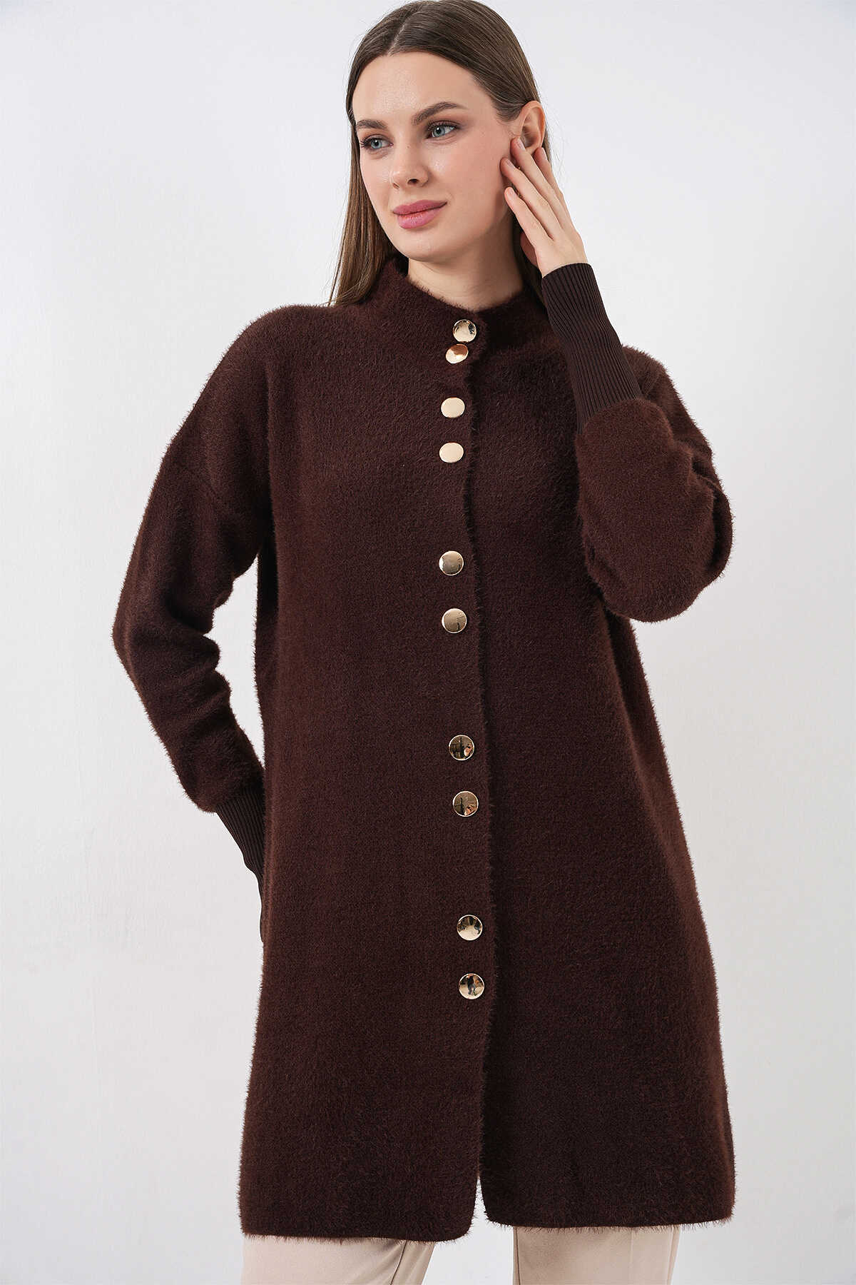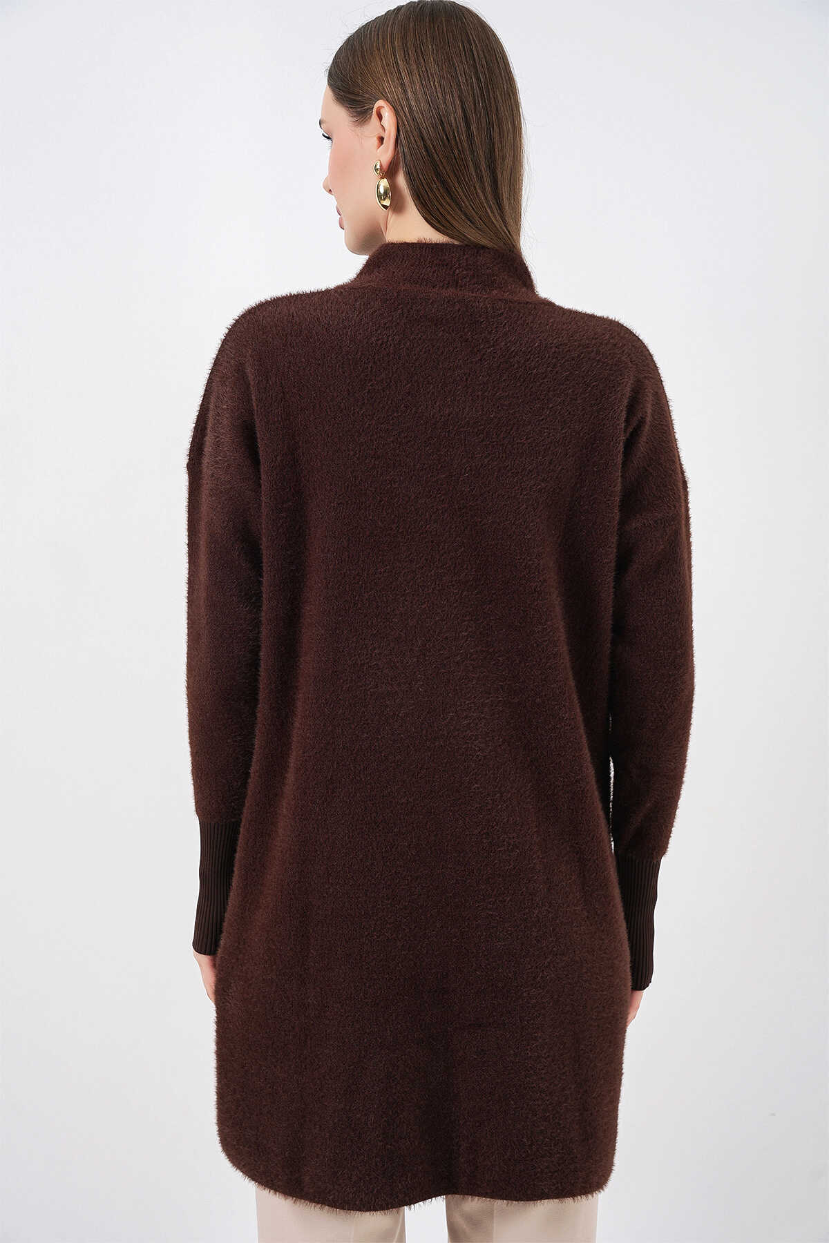 Kadın Yumuşak Dokulu Uzun Triko Hırka 15953 - Kahverengi - Kombin