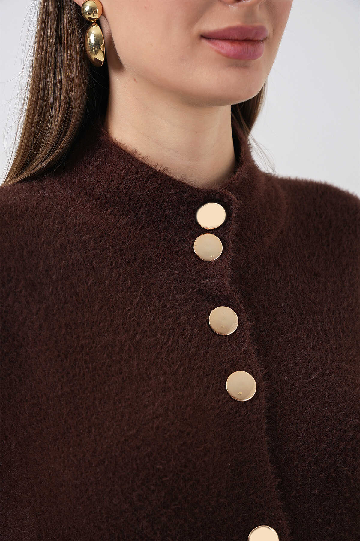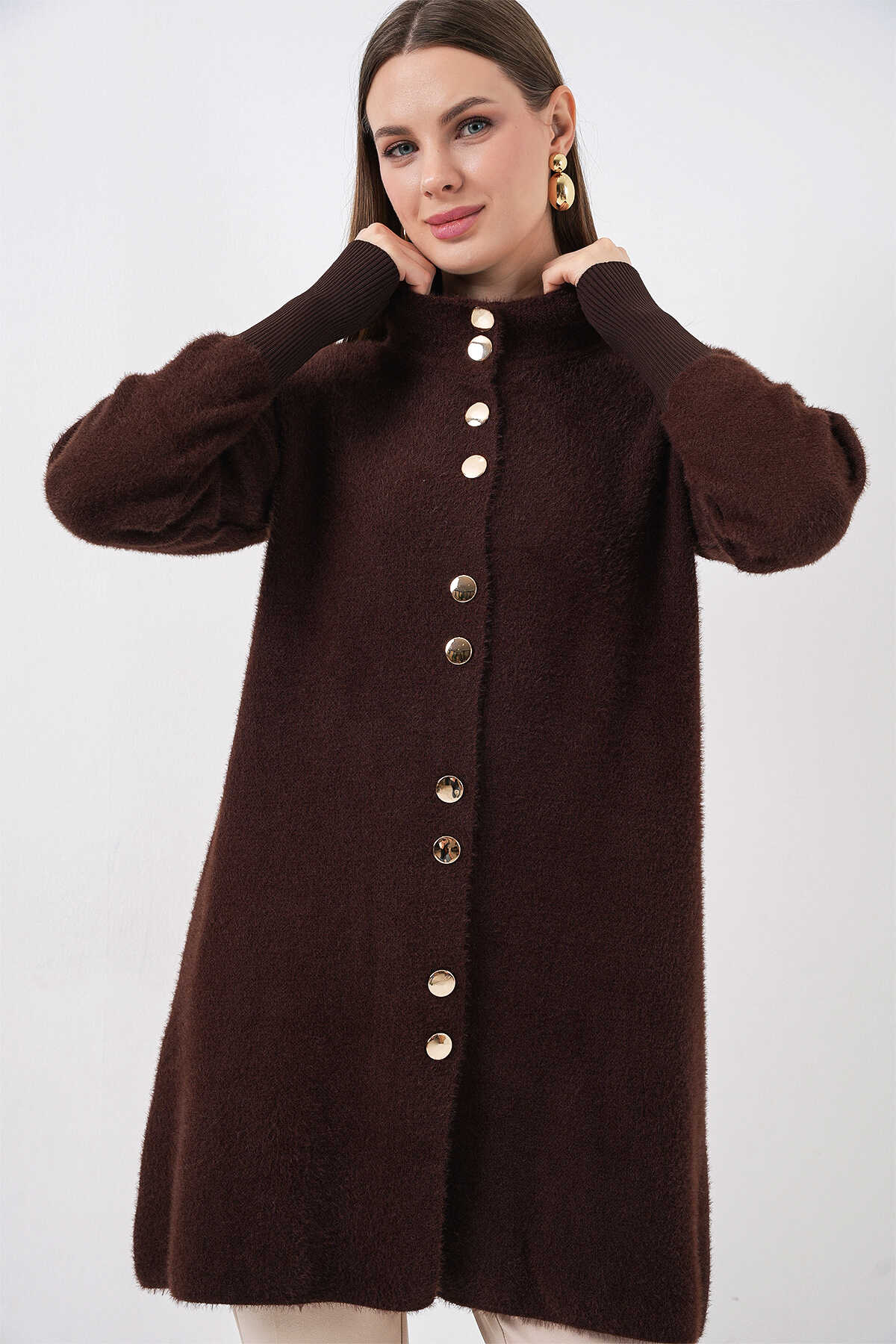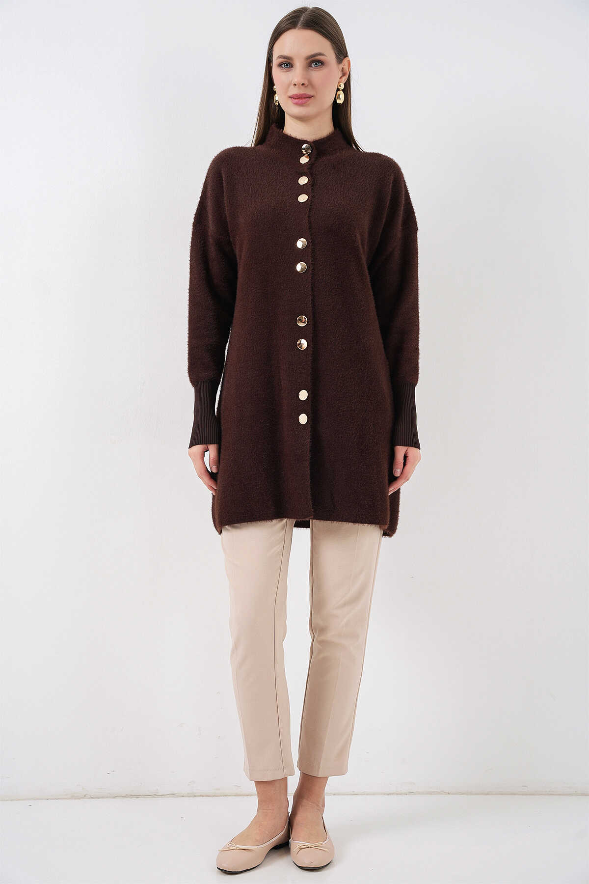 Kadın Yumuşak Dokulu Uzun Triko Hırka 15953 - Kahverengi - Kombin