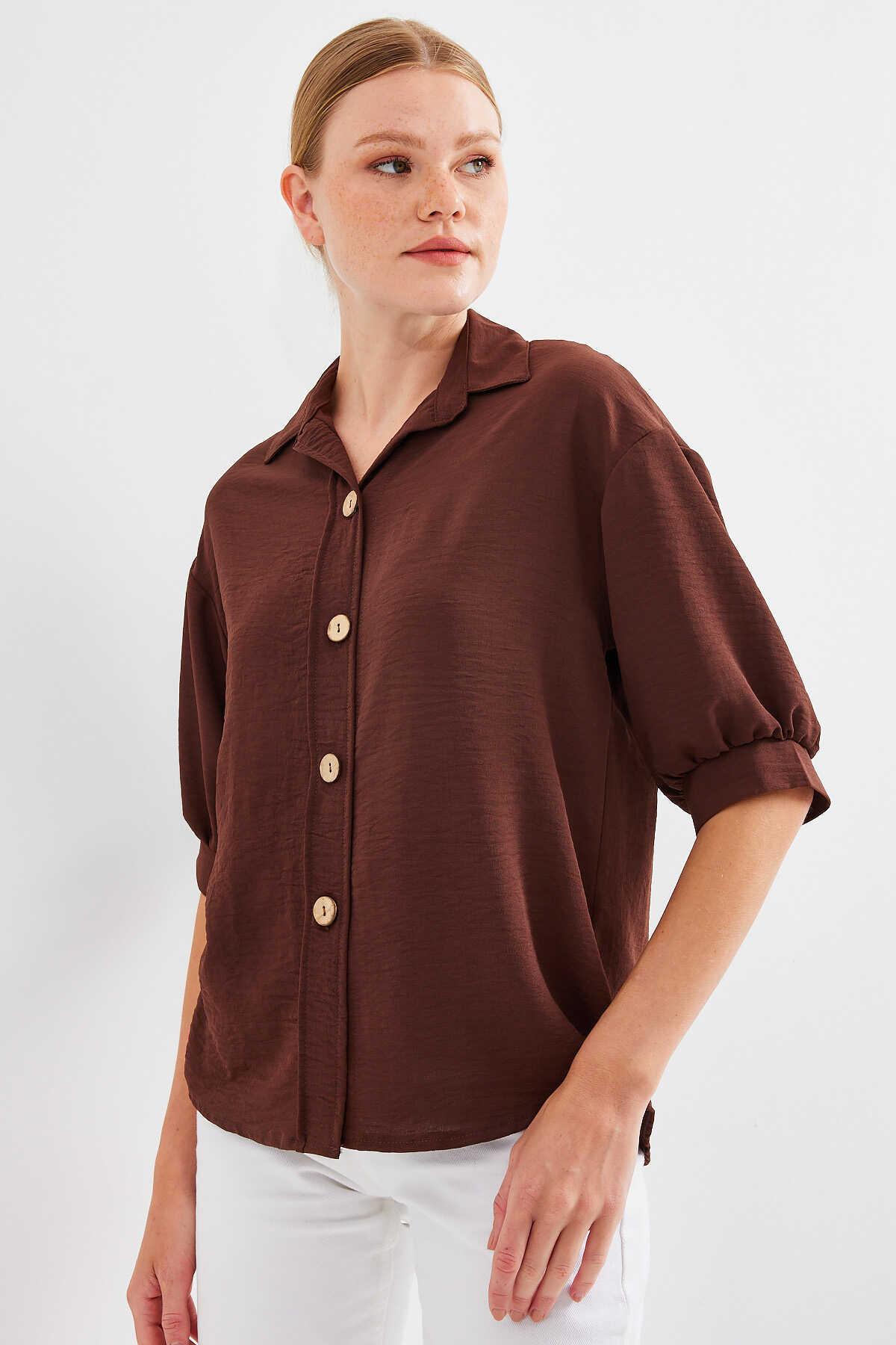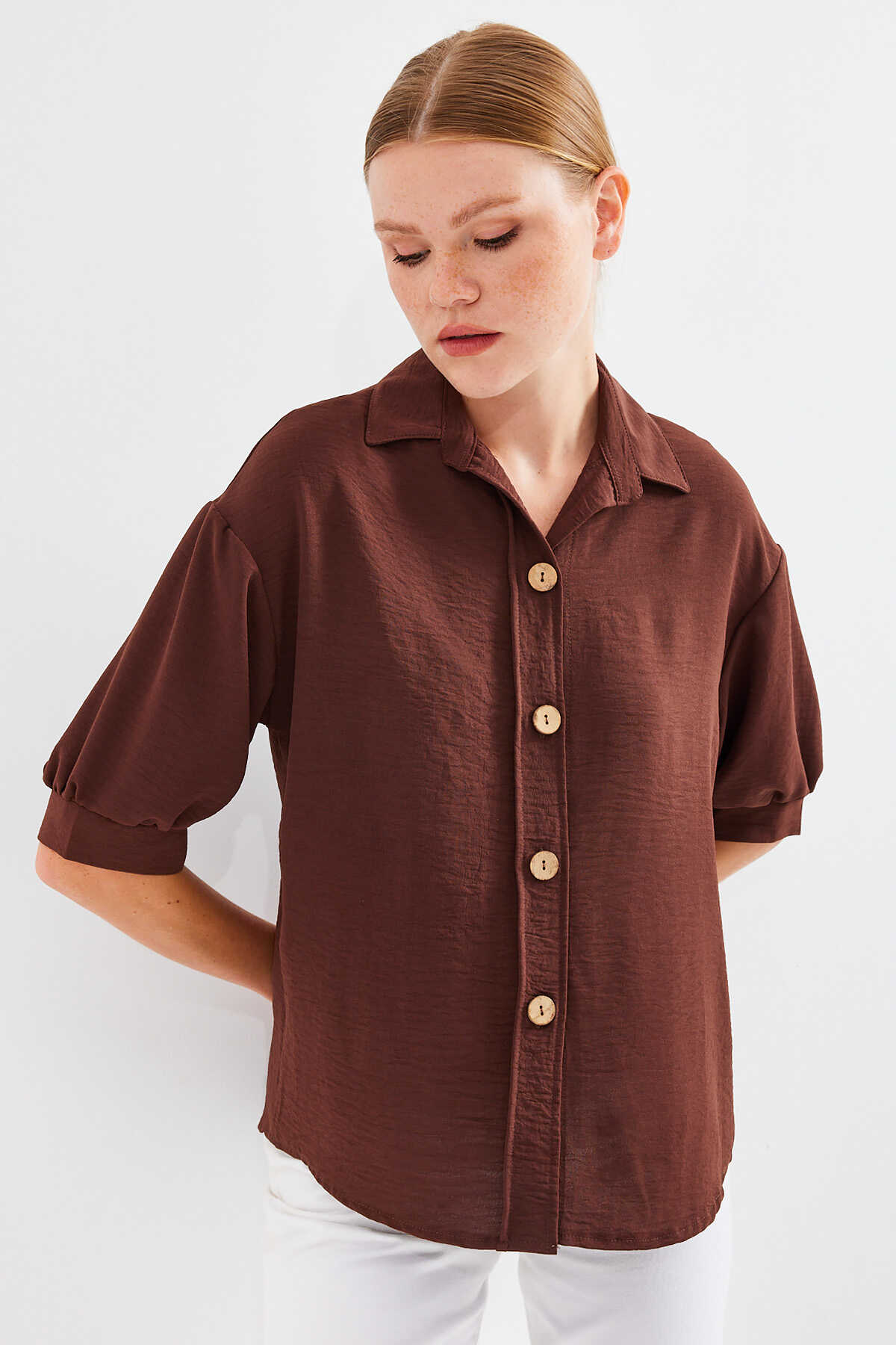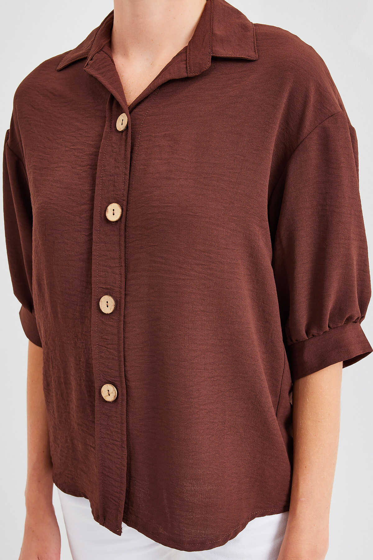 Kısa Kol Oversize Keten Gömlek 20240 - Kahverengi - Kombin