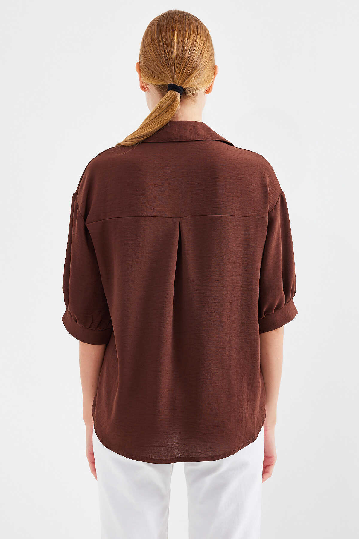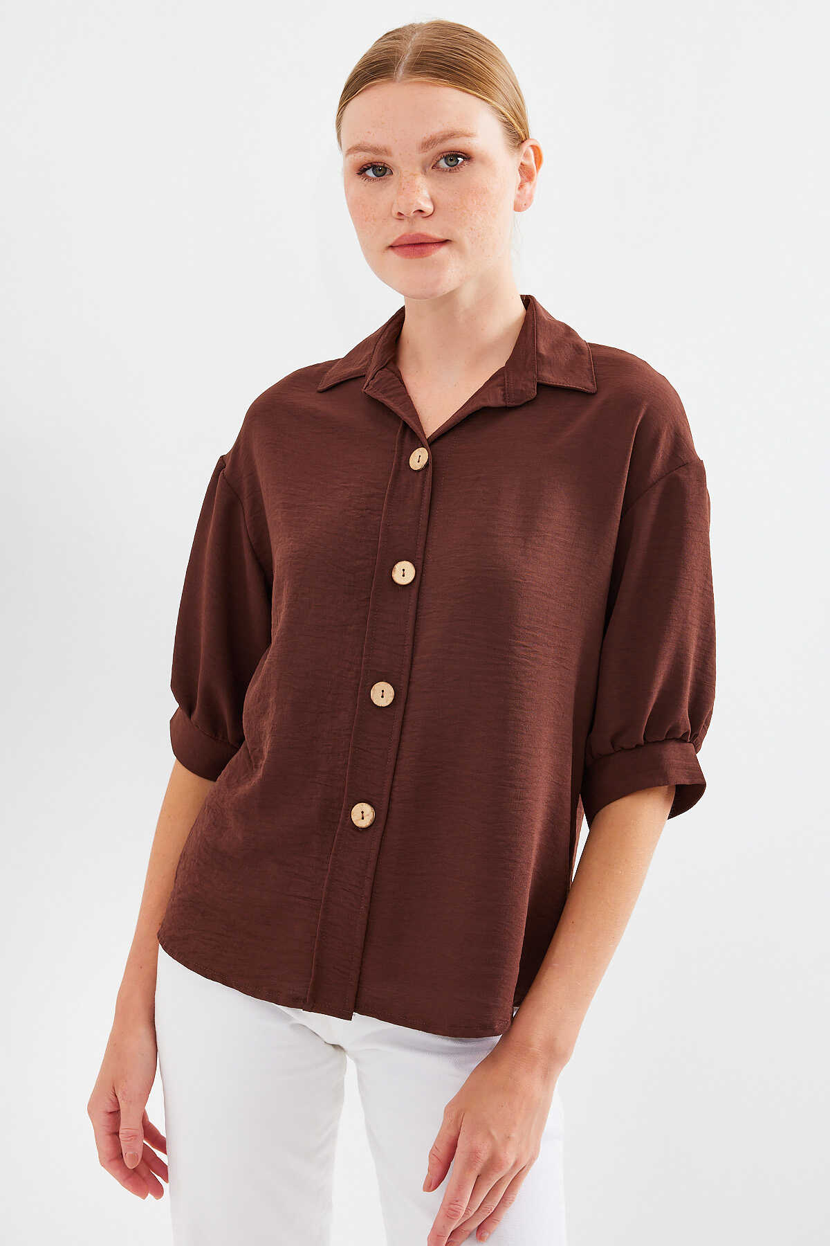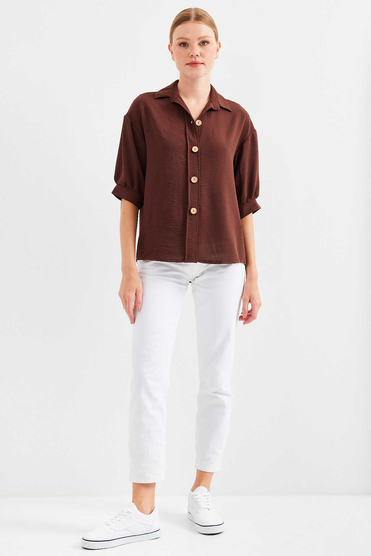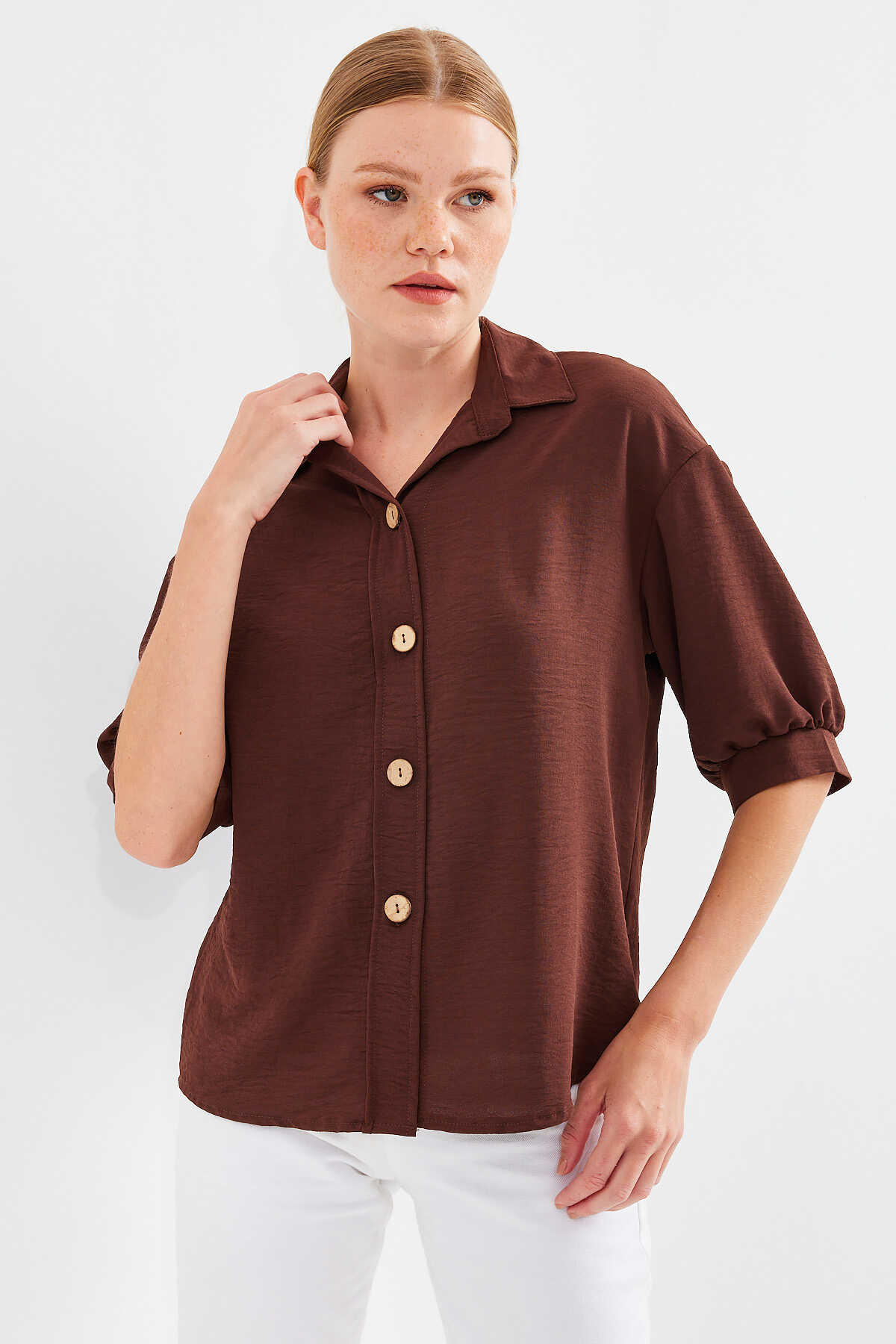 Kısa Kol Oversize Keten Gömlek 20240 - Kahverengi - Kombin
