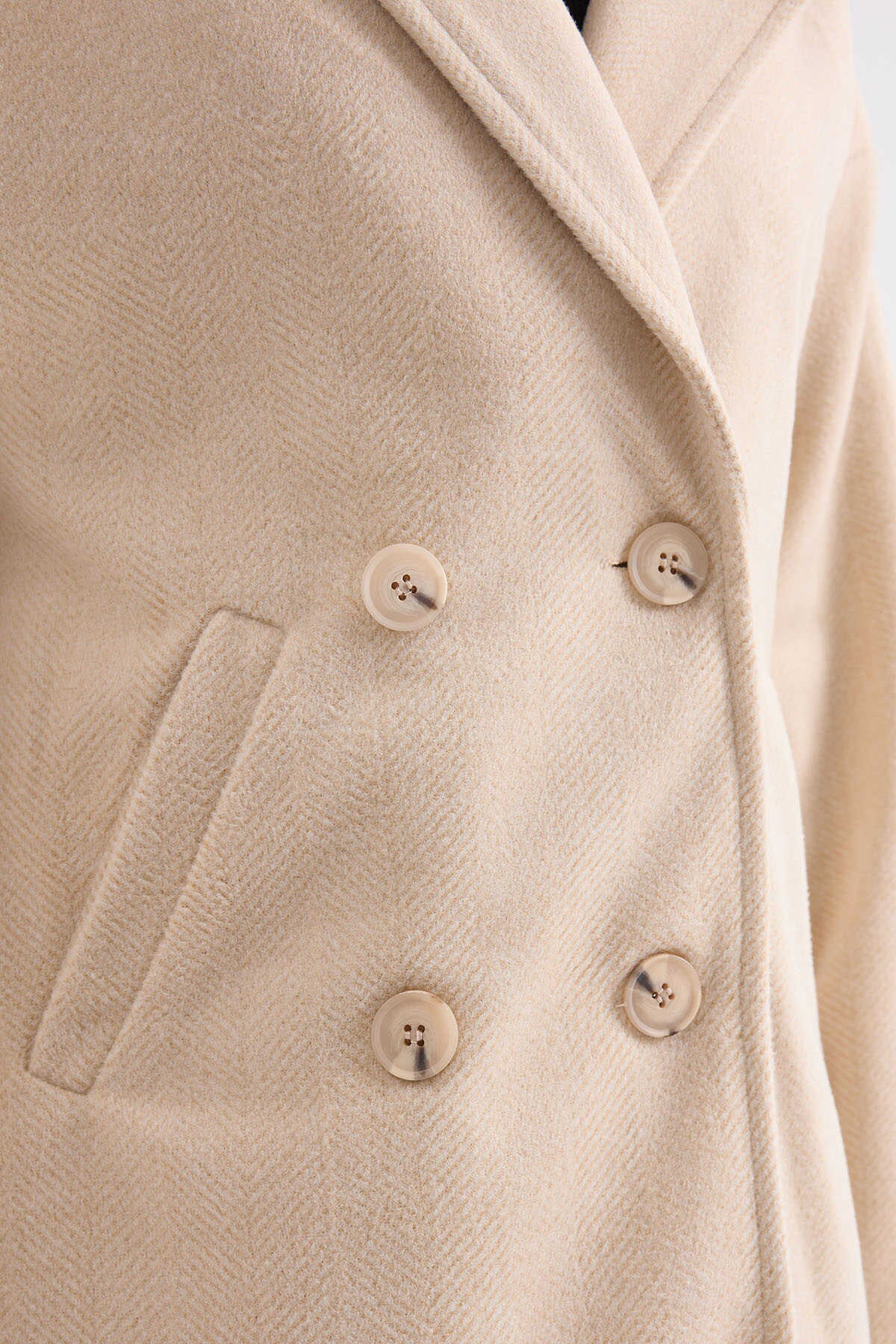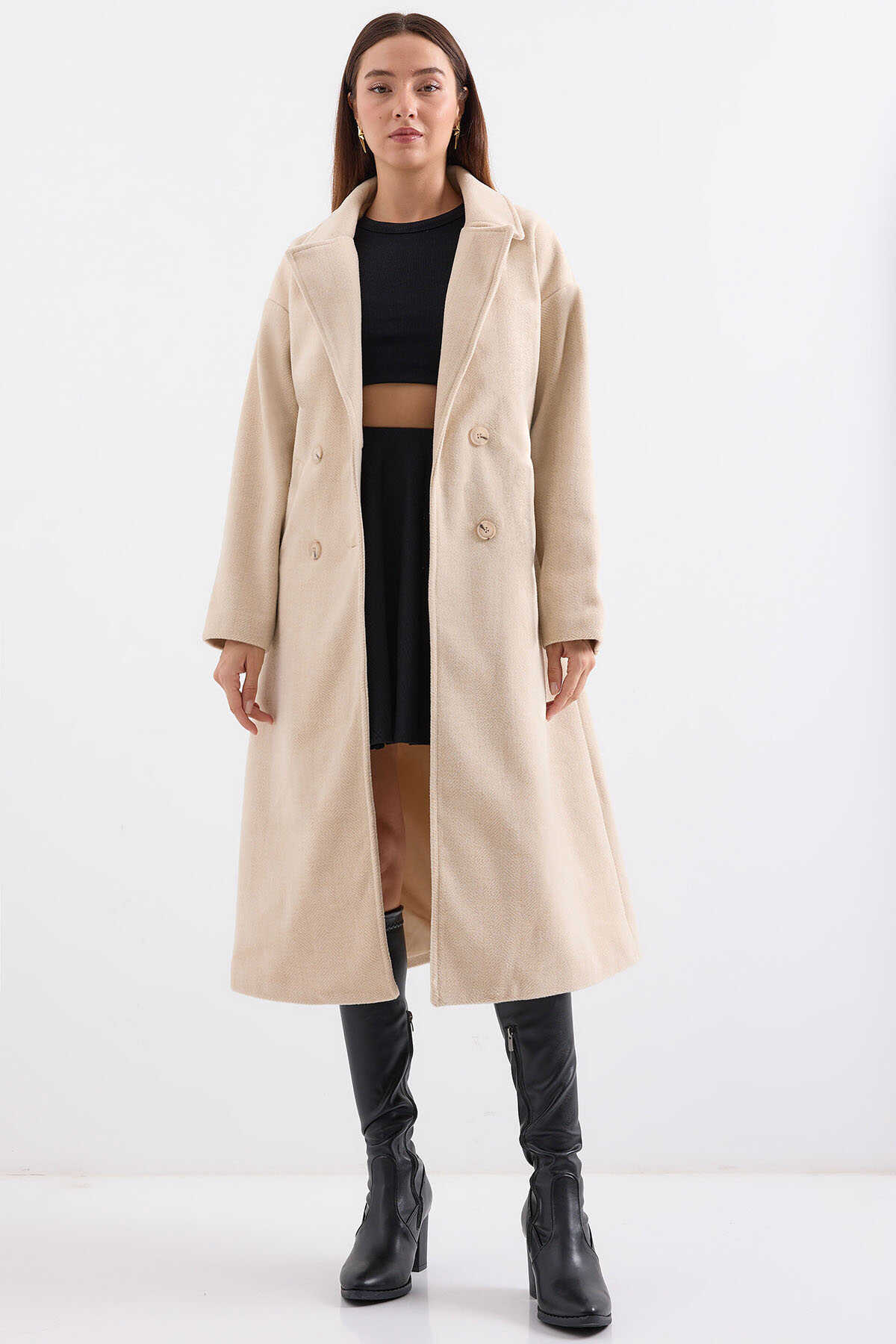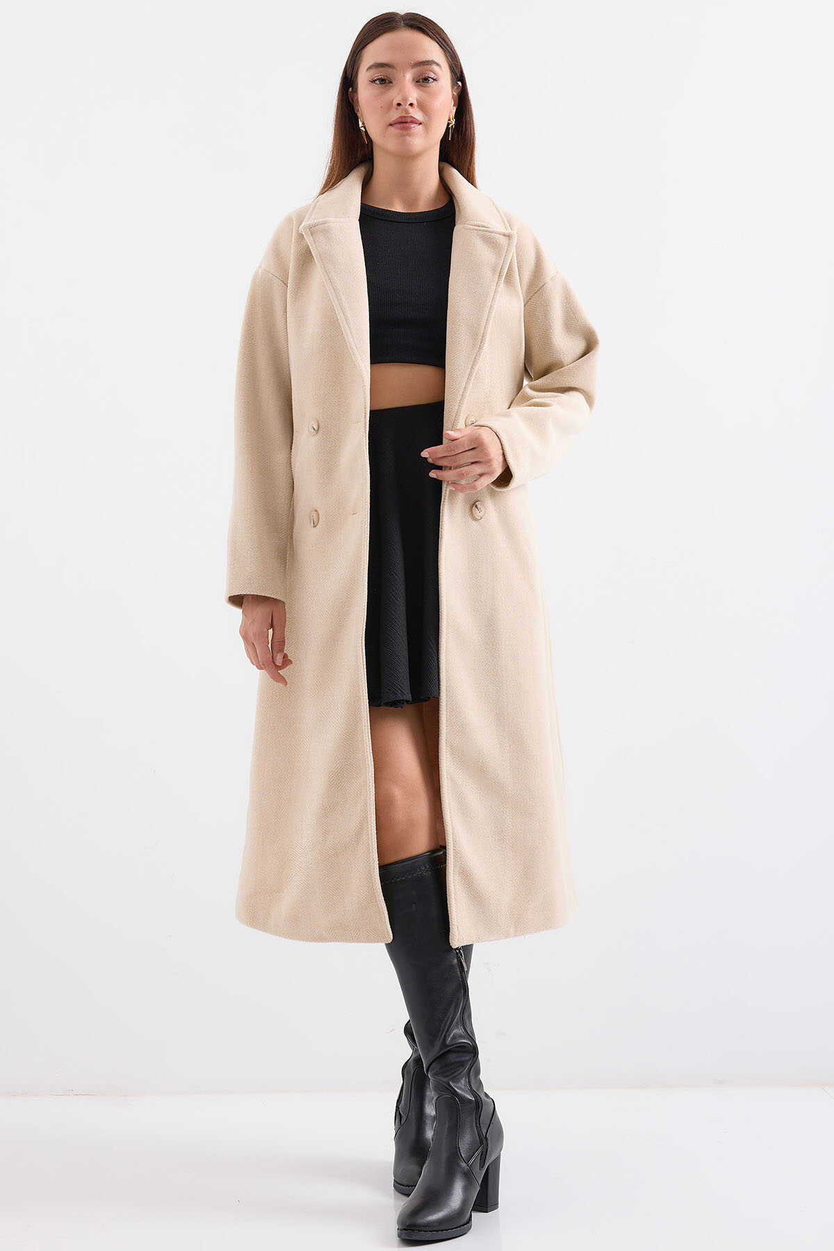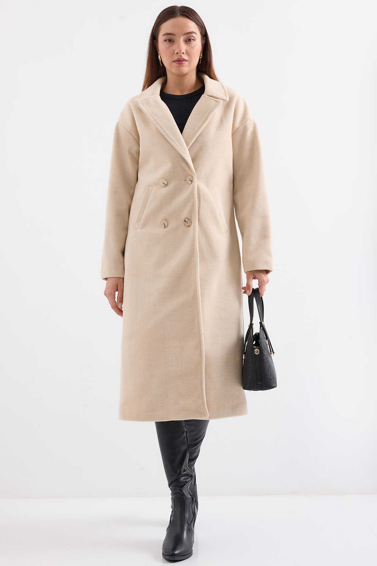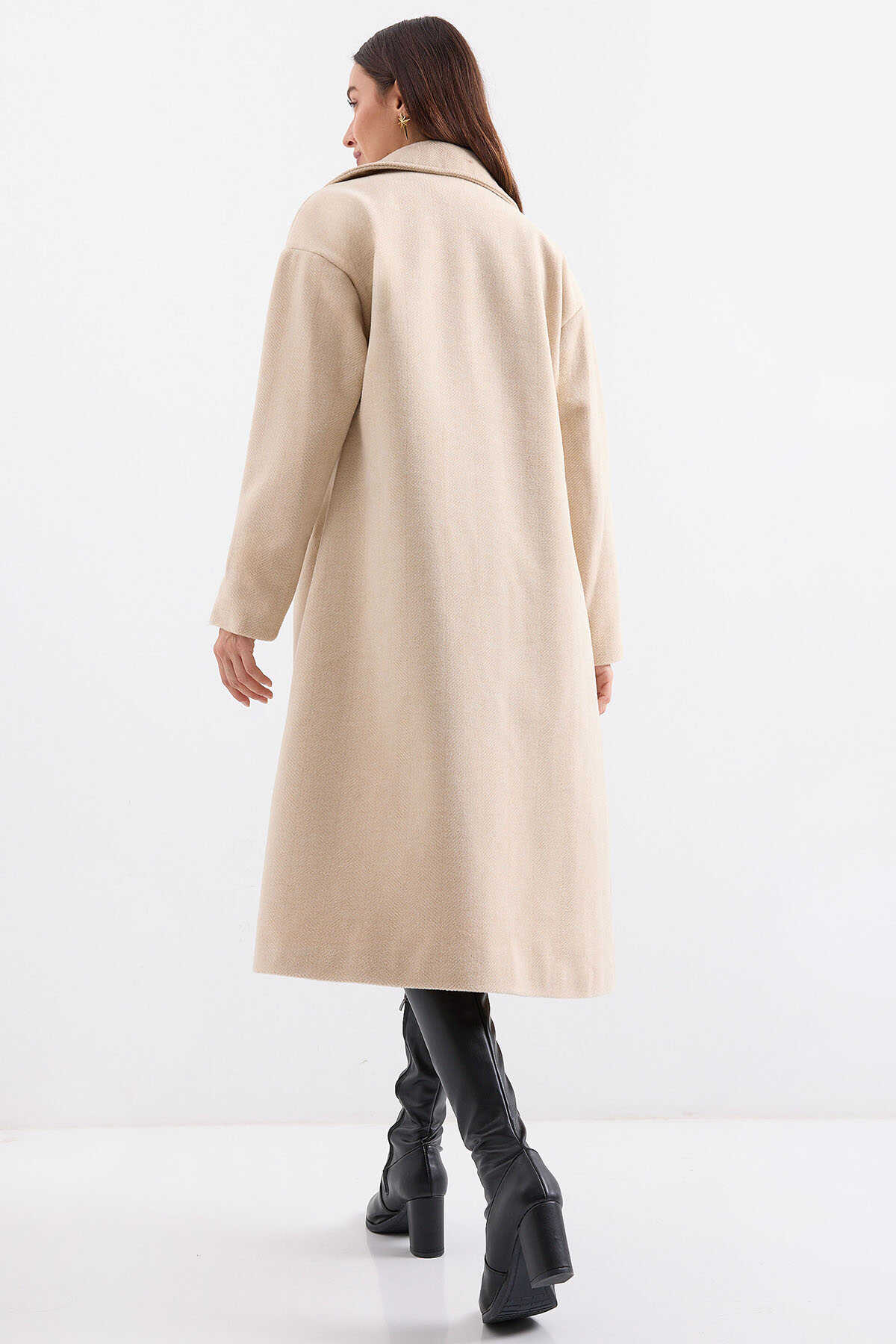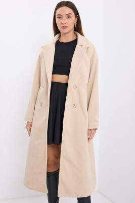 Krem Oversize Geniş Kesim Yünlü Uzun Kaşe Kaban 9113 - Kombin